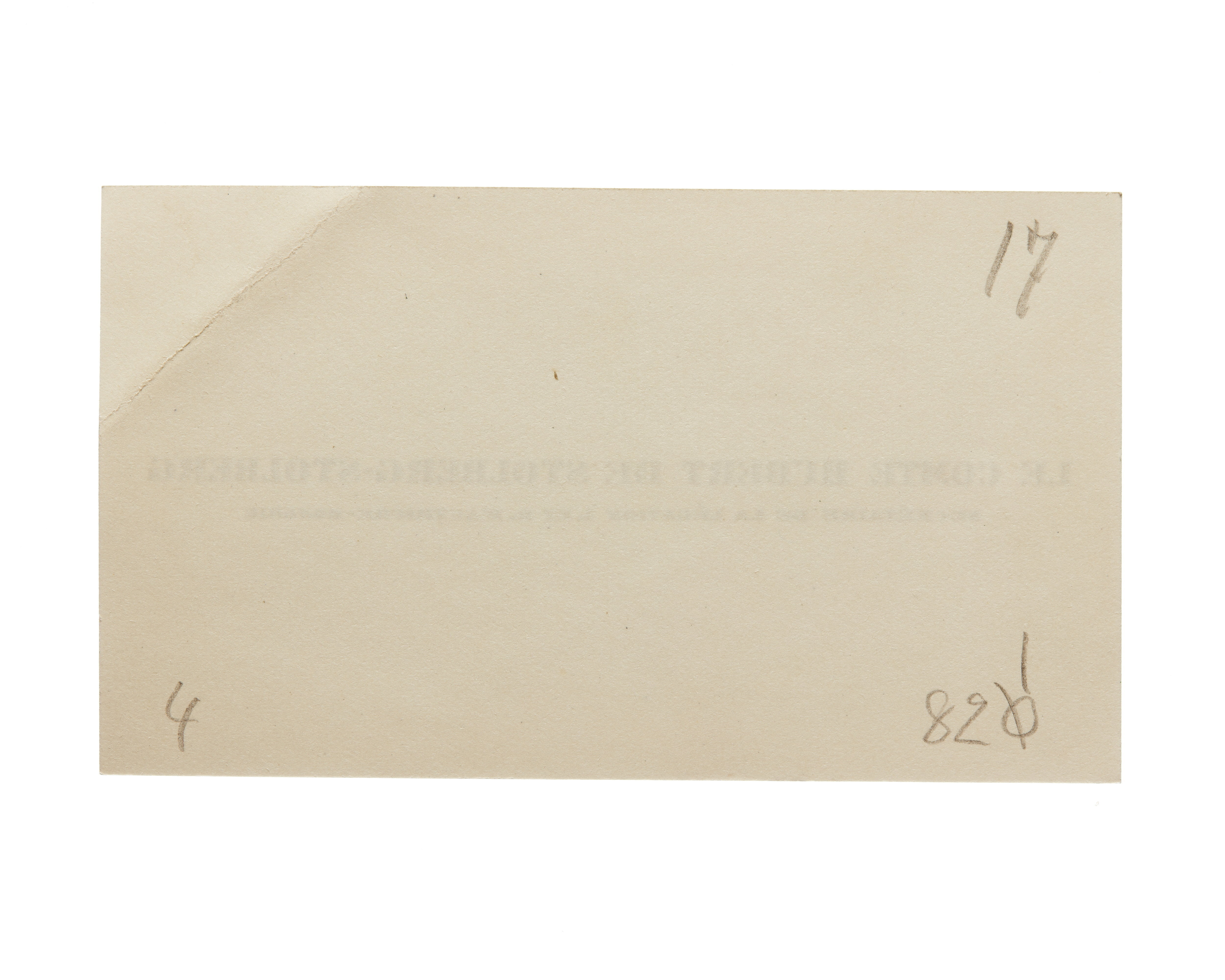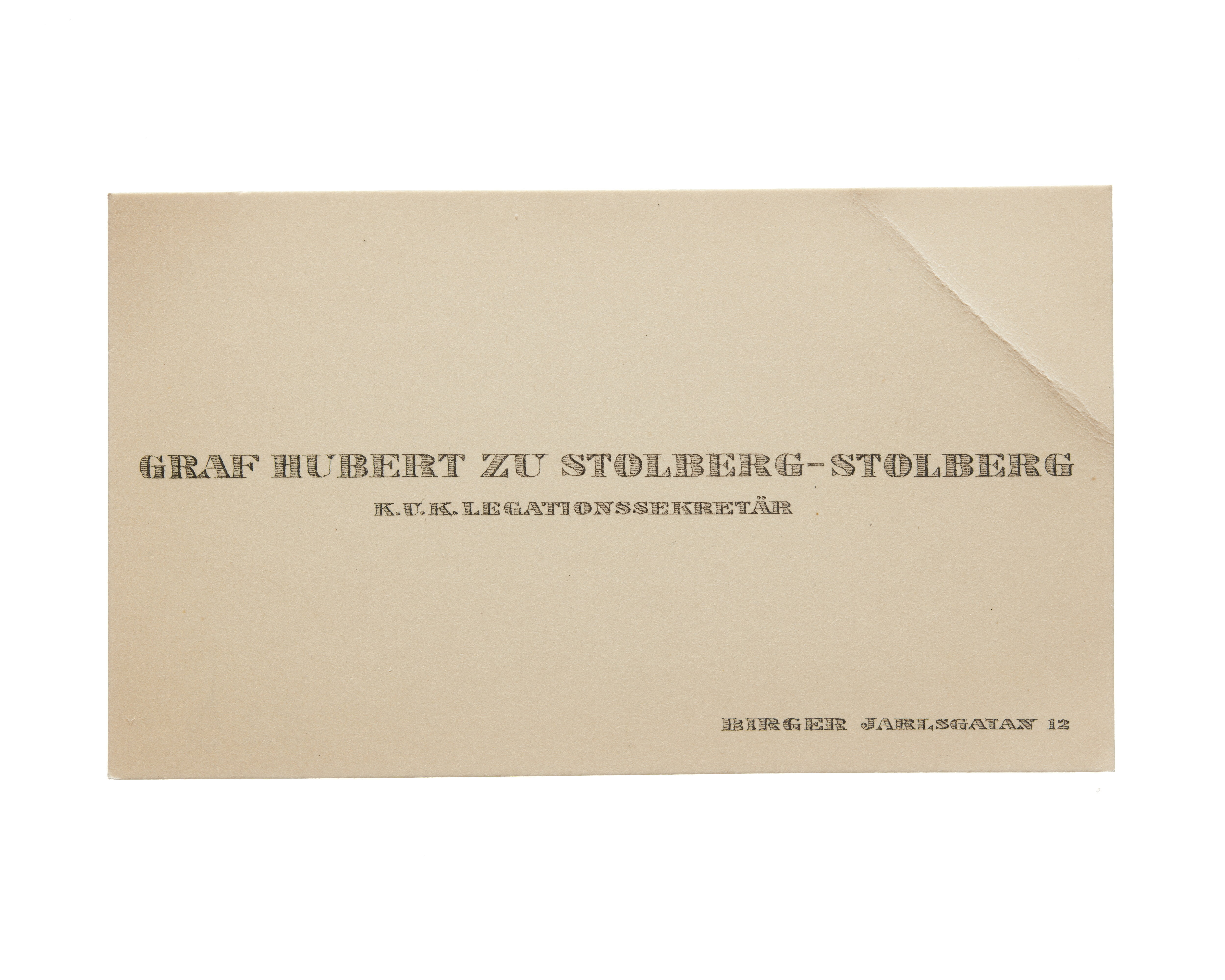 Sex visitkort från la comte Hubert de Stolberg-Stolberg, Secretarie de lalegation I. et R. d'Autriche-Hongrie. Första korte är utan datum, vikt i övre högra hörnet. Adress (nedre vänstra hörnet, handskrift) Birgerjarlsgatan 12. Andra korte är utan datum, vikt i övre högra hörnet. Tredje korte är utan datum, vikt i övre högra hörnet. Står på kortet "La comtesse de Stolberg-Stolberg, nee Princesse de Lobkowitz". Fjärde kortet daterat 1917, vikt i övre högra hörnet. Femte kortet daterat 1917, vikt i övre högra hörnet. Sjätte kortet daterat 1918, vikt i övre högra hörnet.