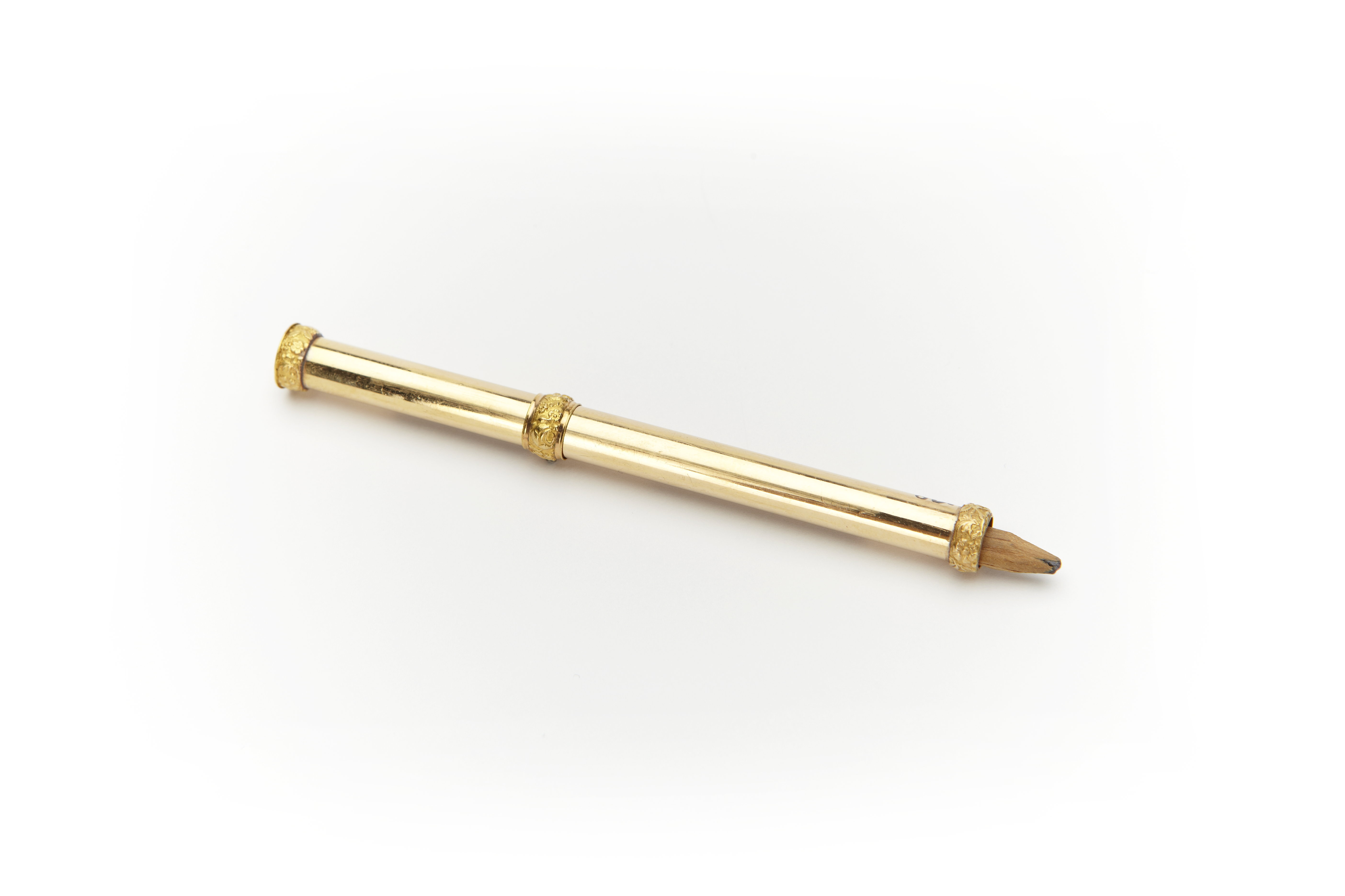 Tillverkare: Gustaf Möllenborg, Stockholm 1840. En ring i vardera änden, skjutbar blyertspenna i pennhållare av guld. Stämplar: GM (SS 2146), St. Erik (SS 2145), tre kronor, 18K, årsbokstav K4 (1840)
