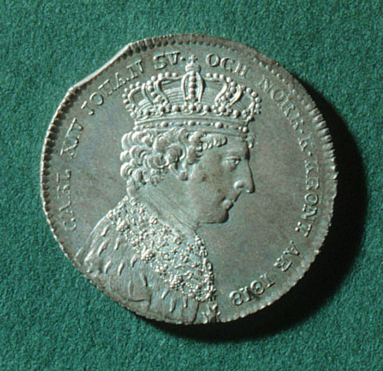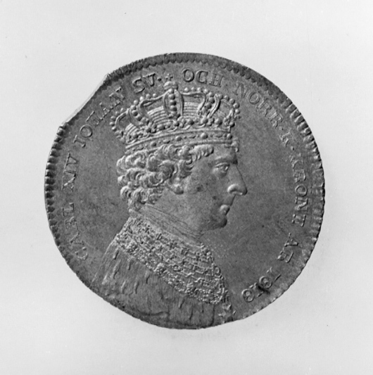 Kastpenning från konung Karl XIV Johans (1763-01-26 - 1844-03-08) kröning i Stockholms storkyrka 1818-05-11.