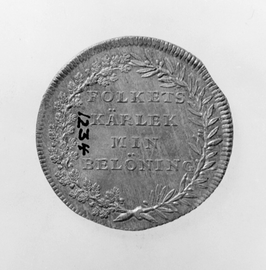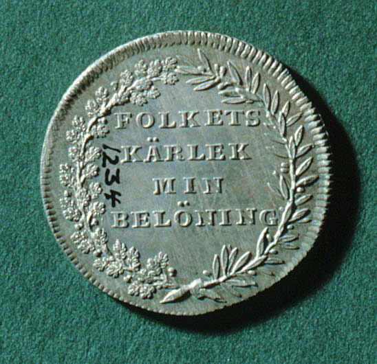 Åtsida: Karl XIV Johan, bröstbild, profil h, krona, mantel, fyra ordenskedjor, text:"CARL XIV JOHAN SV.OCH NORR.KONUNG ÅR 1818". Frånsida: eklövs- och lagerkrans, text: "FOLKETS // KÄRLEK // MIN // BELÖNING".Räfflade kanter, vinkelräfflad rand, kanten skadad på flera ställen.
