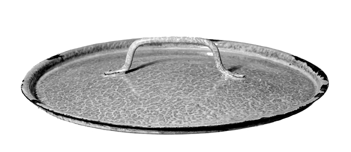 LOCK (till kastrull eller gryta) Av emaljerad stålplåt; emaljen gråspräcklig. Runt, lågt, kupigt, kring kanten en rakt uppstående fals med rakt utstående kantfläns; på mitten ett avlångt rundstavigt handtag med snett nedböjda ändar och rakt utstående platta ytterändar, fästa vardera med en nit. Höjd: 1,6 cm.; diameter: 22,9 cm.