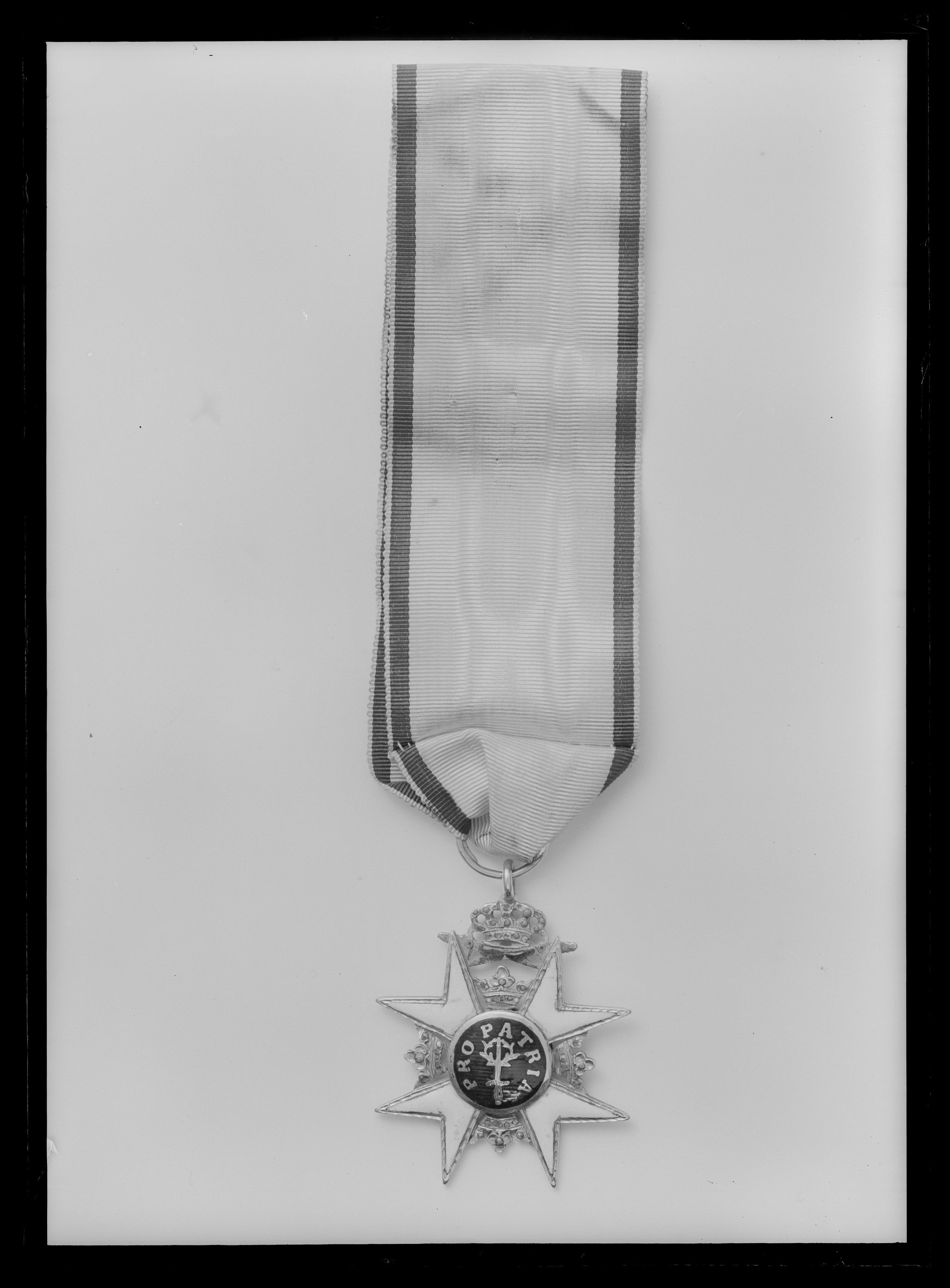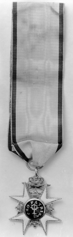 Vitemaljerat, liggande malteserkors av guld, vågiga kantränder, inga kulor på spetsarna. Mellan korsarmarna öppna kronor av guld och turkosblå emalj. Svagt välvd medaljong av guld och mörkblå emalj med på ena sidan svärd och tre kronor och på andra sidan svärd, lagerkrans och text: "PRO PATRIA", allt guld. På de övre korsarmarnas övre spetsar fäst två korslagda svärd med spetsarna nedåt, blåemaljerade klingor, däröver en fast kunglig krona av guld, däri trädd öppen bandring av guld.