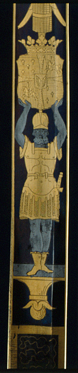 Tregrenat fäst av förgylld mässing. Kavel klädd av läder lindad med täta tvinnade koppartrådar, ursprungligen förgyllda. På den övre sida bygeln graverat i skrivstil: " Magnus Brahe 1830 ". Klinga, böjd eneggad utom vid det ca 195 mm långa spetspartiet där tvåeggad med etsat och förgylld dekor mot blånerad botten intill 460 mm från basen. Vid basen på båda sidor ett rektangulärt fält med finmönstrat ådernät samt guldram därefter på utsidan krigsguden Mars hållande ätten Brahes stora vapensköld på uppsträckta armar, därovanför fasces med två korslagda svärd, latinskt kors omgivet av lager- och en ranka, därefter triangel med Guds allseende öga omgivet av strålar och en större lagerranka. På insidan fattas Athena hållande en sköld med Magnus Brahes monogram, trofégrupp, svärd med ek- och lagerranka, nordstjärnan omgiven av strålar, därefter en störe ranka av ek. Starka delen av klingans rygg förgylld och med etsade våglinjer, därefter smal blånerad bård 127 mm. Vid basen på ryggen signering i skrivstil: " Liljedahl, Stockholm ".