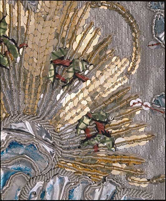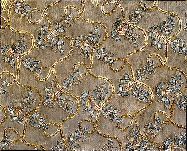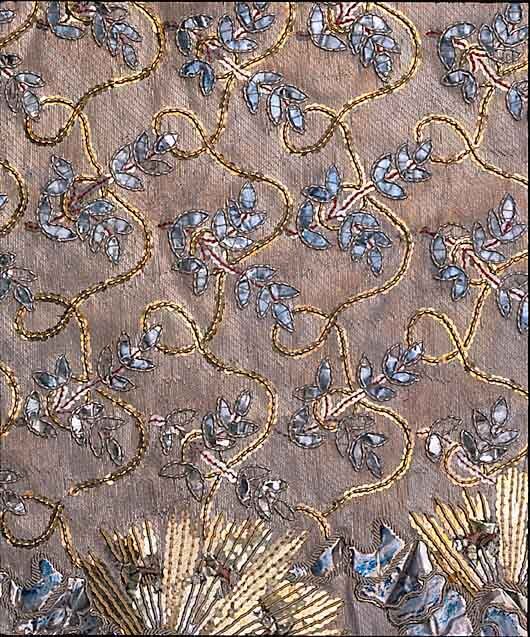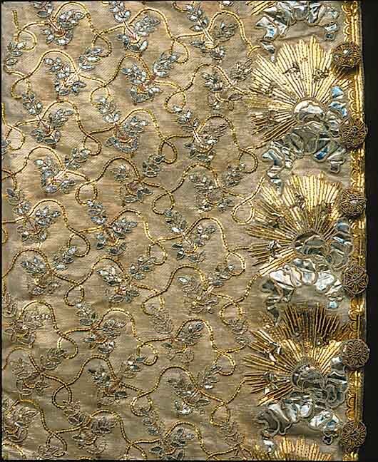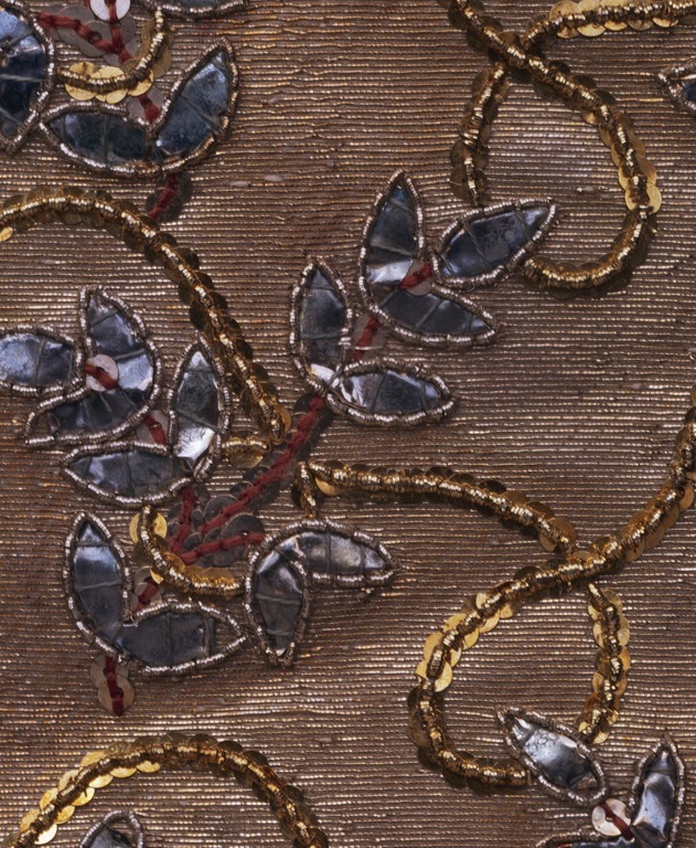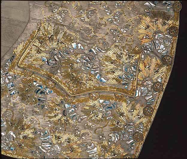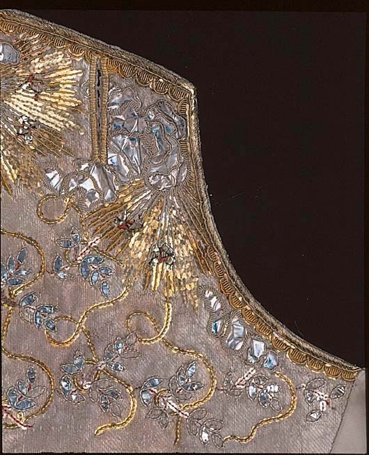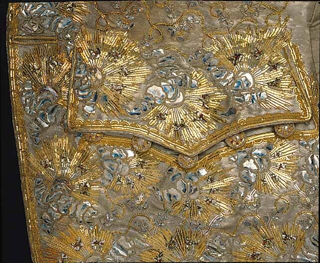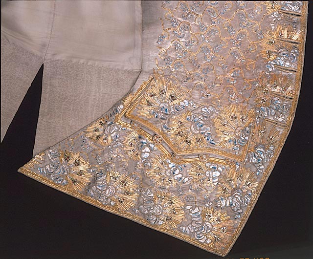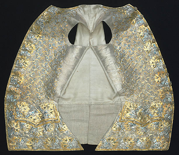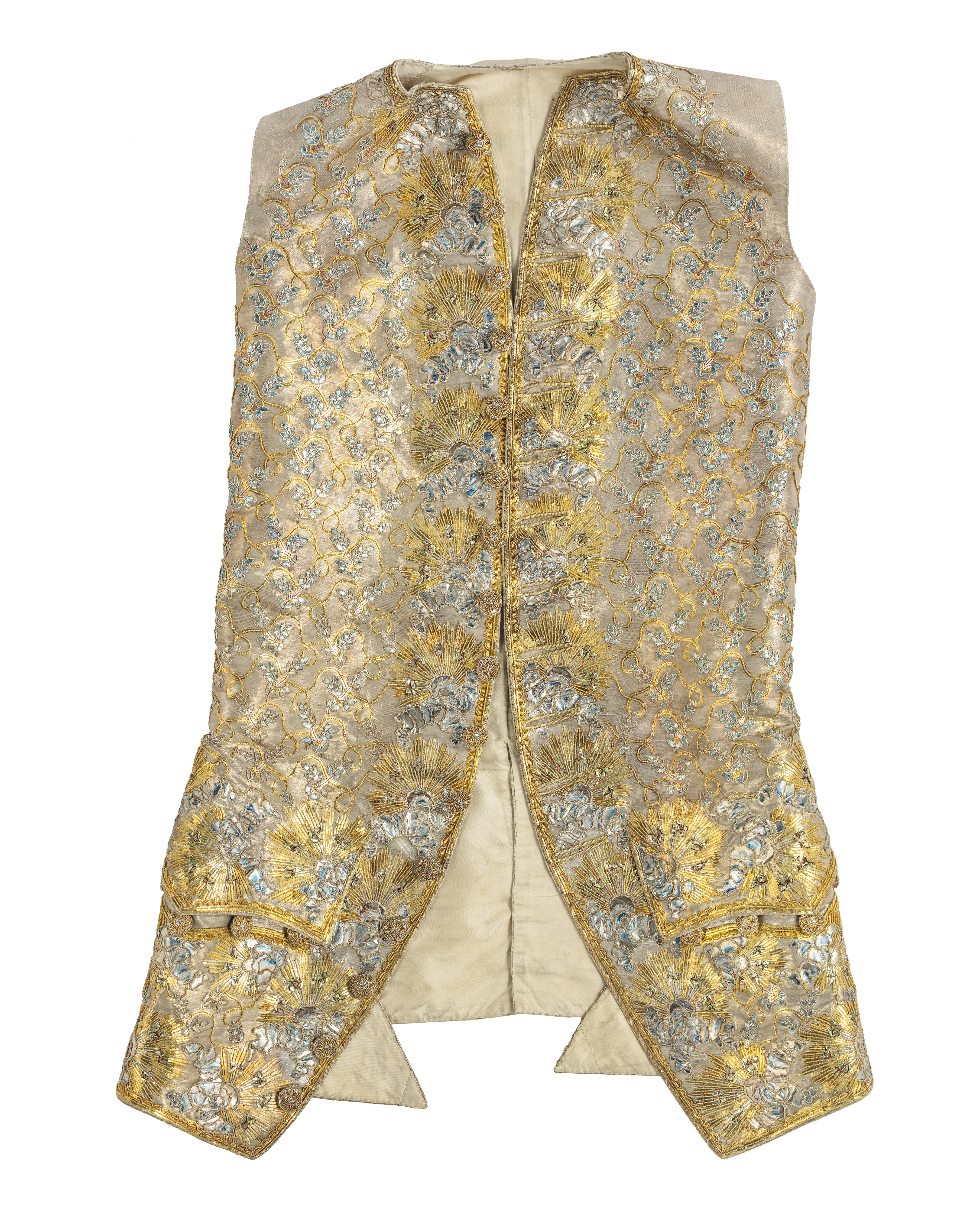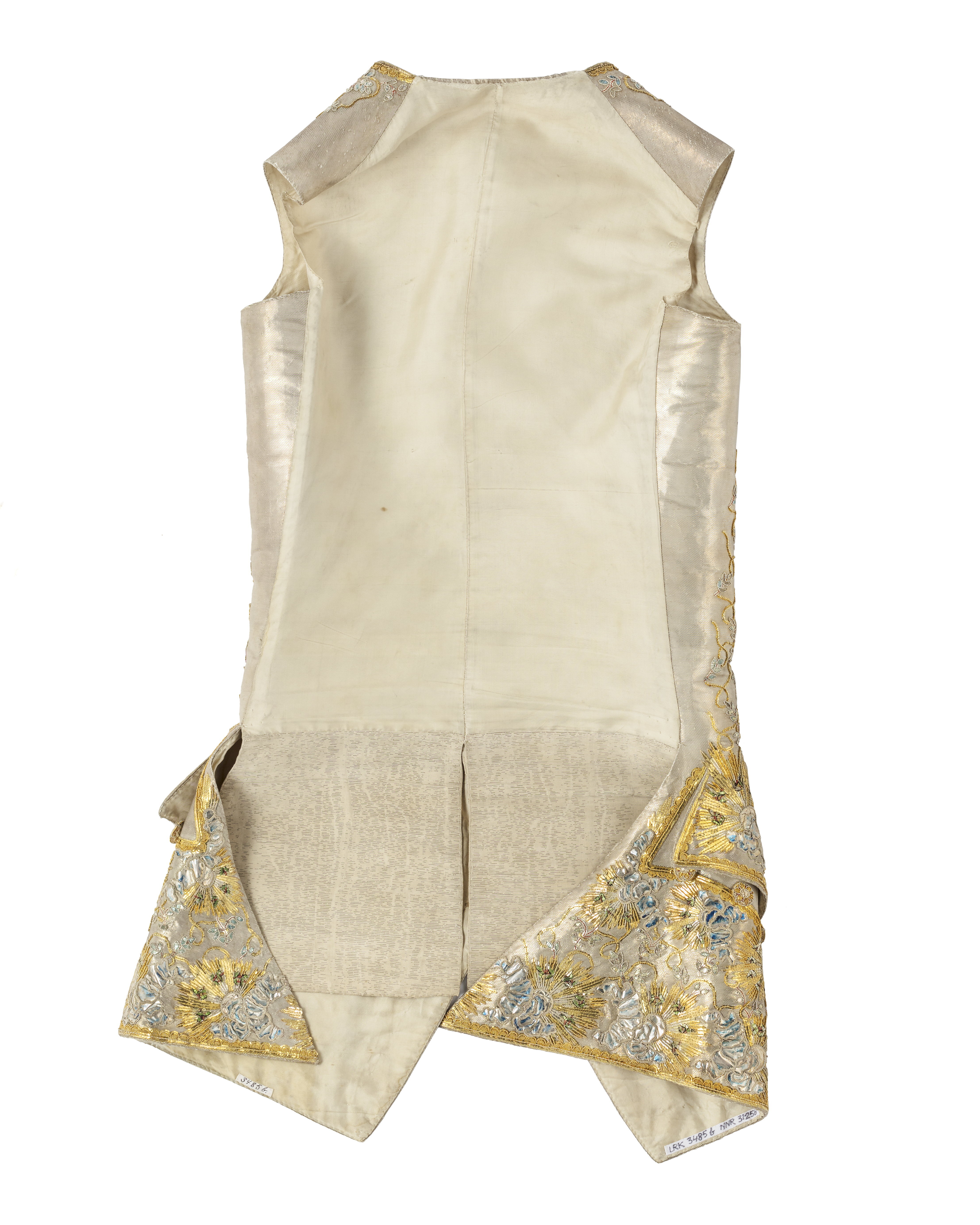 Använd vid bröllopet den 4/11 1766. Modellen är lång, kroppsnära och öppen nedtill med markerade ficklock. Under dessa en trekantig ficköppning och fem knappar som delvis döljer sig under ficklocken vilka inte är tänkta att kunna knäppas, utan bara för syns skull. Ficklockets broderi är påsytt efter det att ficklocken satts på plats. Kvaliteten på tyget är mycket hög. Ett kypertvävt broderat silvertyg. Samma botten som byxtyget. Skörten är spetsiga och bak är de i ett enklare tyg än framtill. Framstycket är helt täckt av en broderad yta guldslingor, bladkvistar med blad i blå metallfoie, slingor av guldpaljetter, kantiljer. Bård längs med framkanten och nederkant av moln i blå folie och stora guldstrålar som riktas uppåt längs framkanten och snett liggande längs nederkanten. Mönsterrapporten ca 8,5 cm (lika som den mindre varianten på rocken). Yttersta kanten framtill utanför broderiet är försedd med en dubbel rad guldkantiljer och paljetter emellan. På höger framstycke sitter 16 knappar, den översta 4 cm från halsen och därefter med 4,5 cm mellanrum till 4,5 cm, från nederkanten. Det finns 12 knapphål, 4 cm långa, med guldtrådskanter och på fodersidan sydda med sysilke. De är parrallella med halslinjen dvs riktade snett uppåt. Under ficklocken sitter fem knappar som ej kan knäppas. Fodret är tillskuret som västens yttertyg. Stora hällor till byxknapp sitter fast i sidorna på västen.