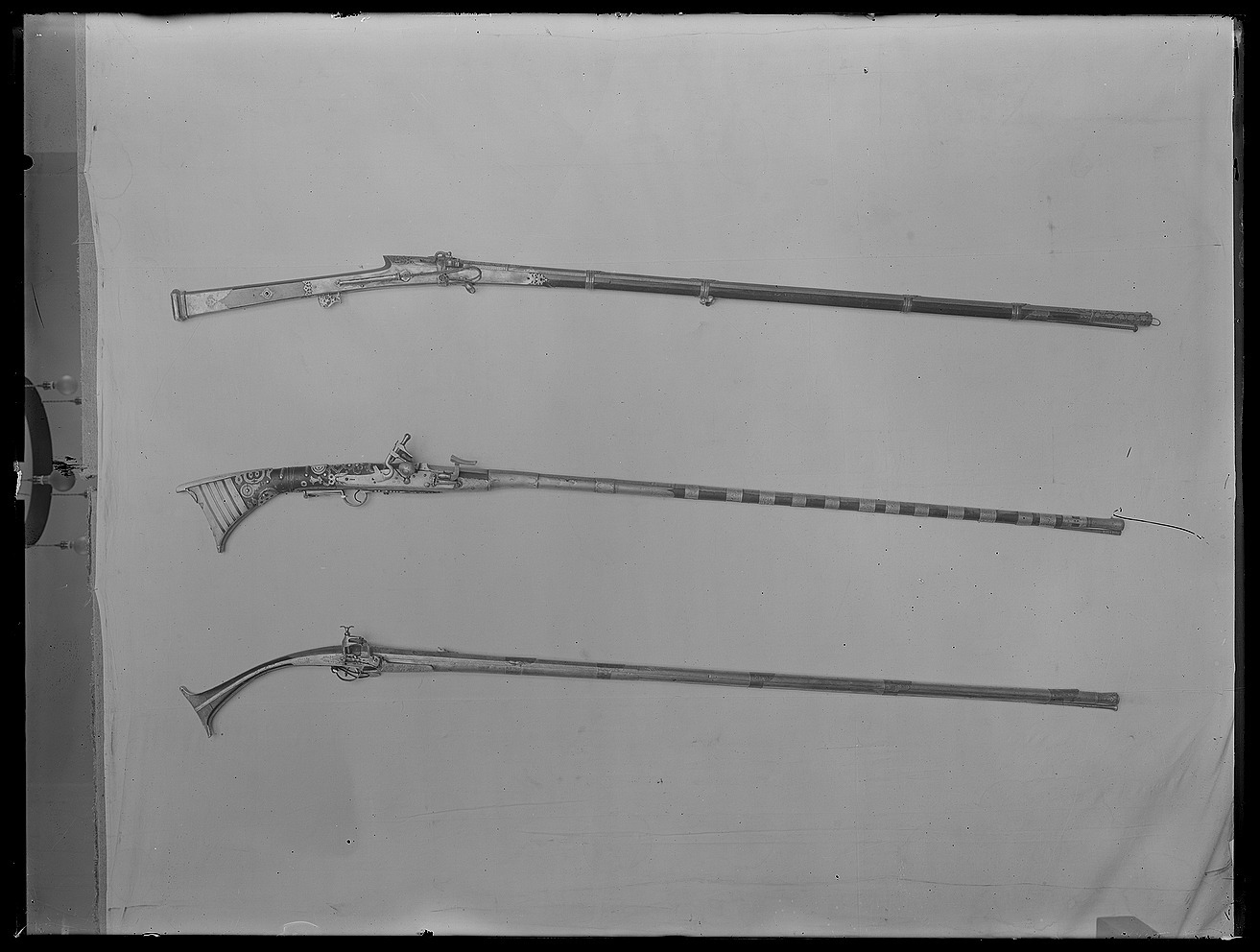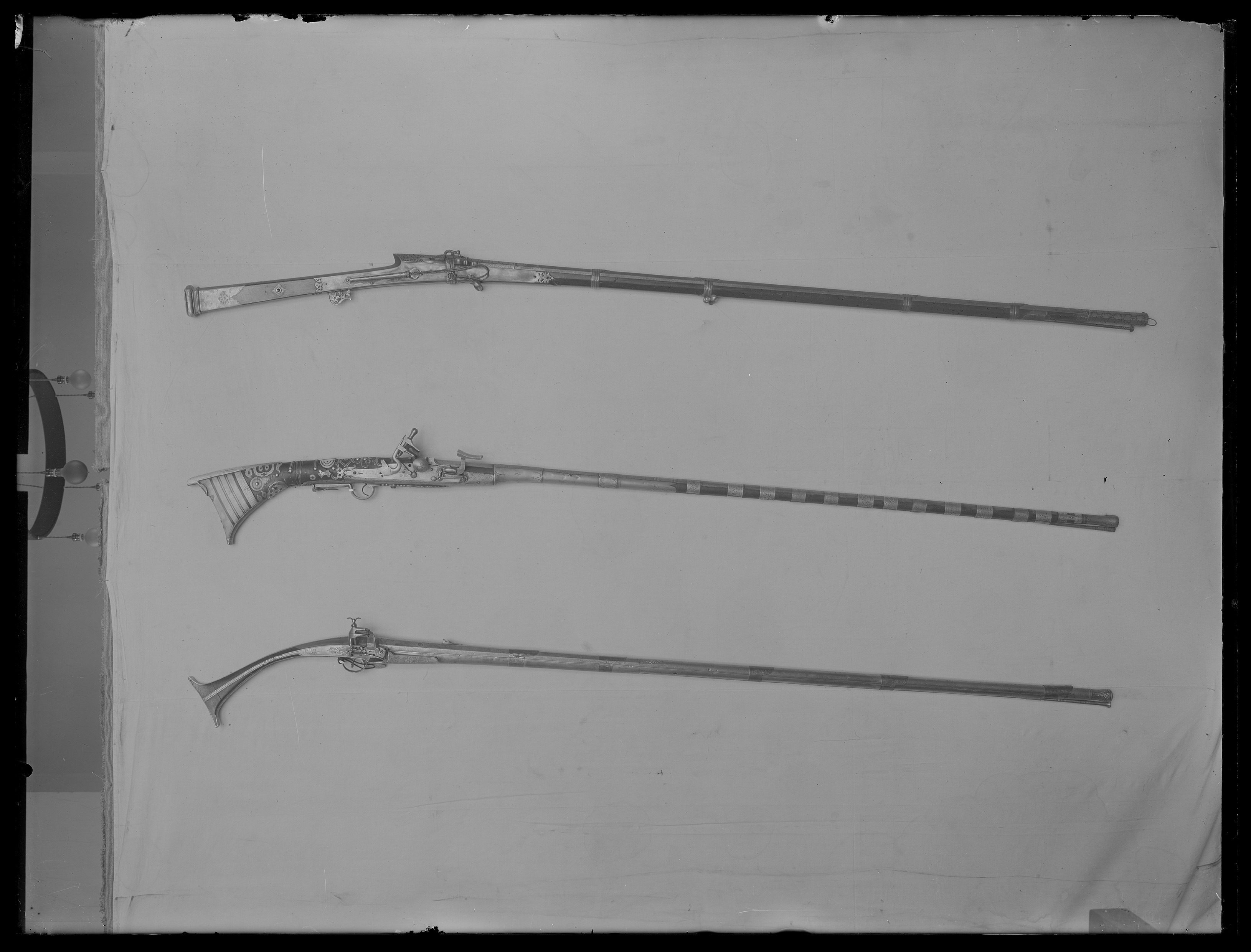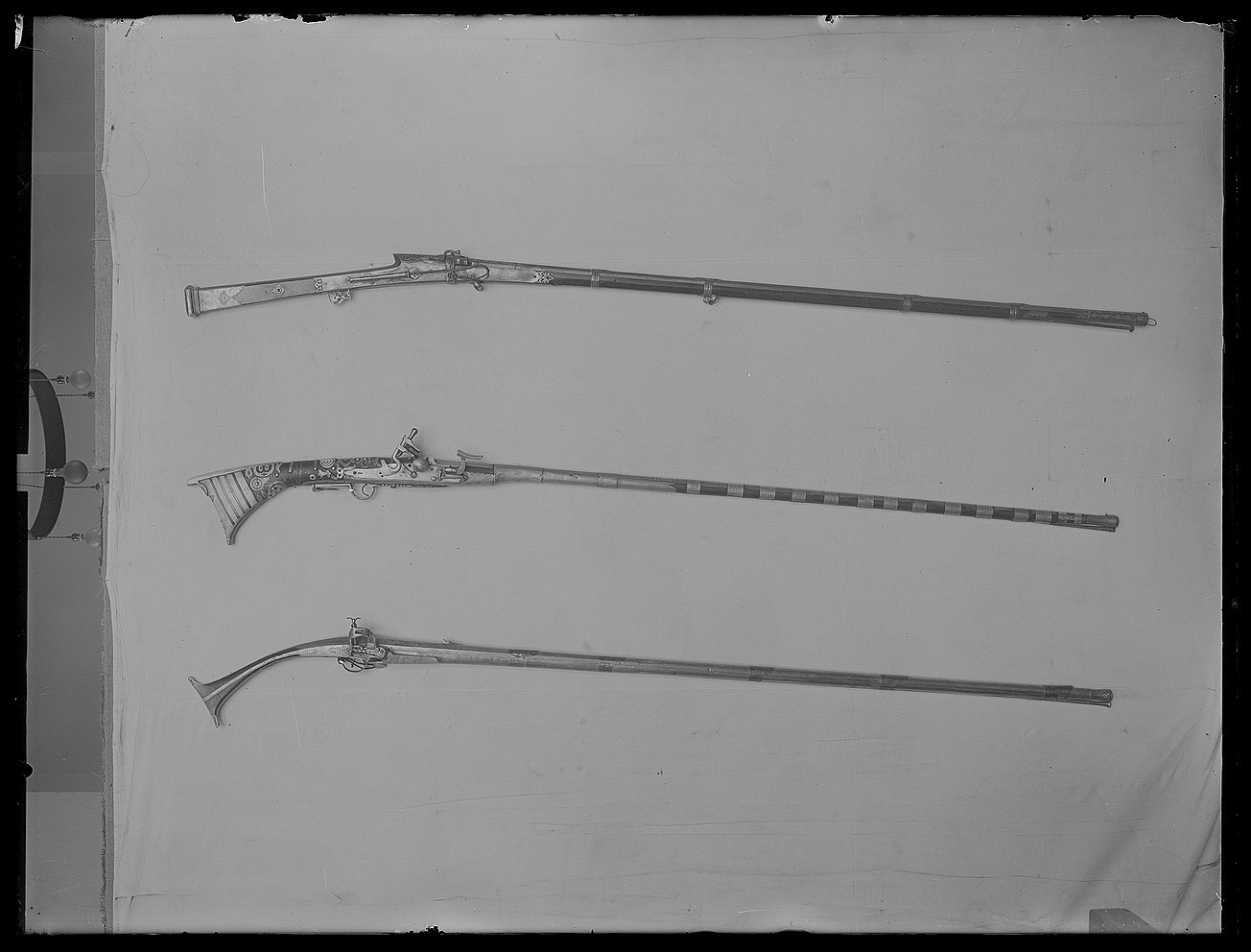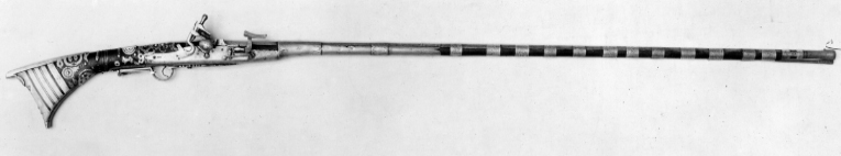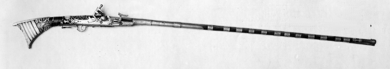Slätborrad pipa av stål med åttsidigt kammarstycke avslutat med två+två ringformiga vulster, därframför svinrygg till pipans framände, tre tvärvulster och ett 40 mm långt beslag av silver med två små runda, otydliga stämplar. Pipans mynning något vidgad. Kammarens bakersta del beslagen med silver graverat och genombrutet i voluter och åttor. På kammaren tre nötta stämplar. Riktmedel: Rundat ståndsikte och spolformigt stolpkorn av stål. Fästning: Två pipband av stål, ett bredare med graverad dekor av våglinjer och bågar. 12 pipband av silver med graverad dekor, olika på alla, geometriska ornament och stiliserade växtmotiv. Snapplås med plant 220 mm långt låsbleck med två stämplar. S-formig hane med plan hanfot, lös överkäke, käkskruv med päronformat huvud. Hake för halvspänn bakom hanfotens klack. Fängpanna med skjutbart lock. Fängpannans kant rund och välvd. Separat eldstål. Utvändig eldstålsfjäder. Invändig slagfjäder. Fästning: Tre låsskruvar av stål med bleck av silver. Helstock av mörkt trä. Kort kolv med kraftigt insvängd undersida samt insvängd mellan tå och häl. Kolvens bakre del av vitt ben med vertikala, graverade linjebårder ifyllda med svart färg, litet ornament med röd färg. På kolvryggen genombrutet och konturerat stålbeslag. På kolvens undersida genombrutet och konturerat beslag av mässing, samt genombrutet och graverat silverbeslag, delvis ifyllt med röd färg. Ovanpå detta runt genombrutet silverbeslag. På kolvens sidor inlagt plattor av ben med graveringar ifyllda med svart och röd färg, skåror inlagda med röd färg. På kolvens undersida från varbygelns bakre arm till kammarens slut ett stålbeslag. Beslaget konturerat och graverat med sick-sacklinjer i stiliserar växtmönster. Skålformig varbygel av mässing, beslagen med silver, graverad dekor dubbel bakre arm, med bygel vari spanskt silvermynt är fäst, främre armen konturerad och genombruten. Tillbehör: Laddstock av stål med två ringformiga vulster. Flinta med läderlapp runt.