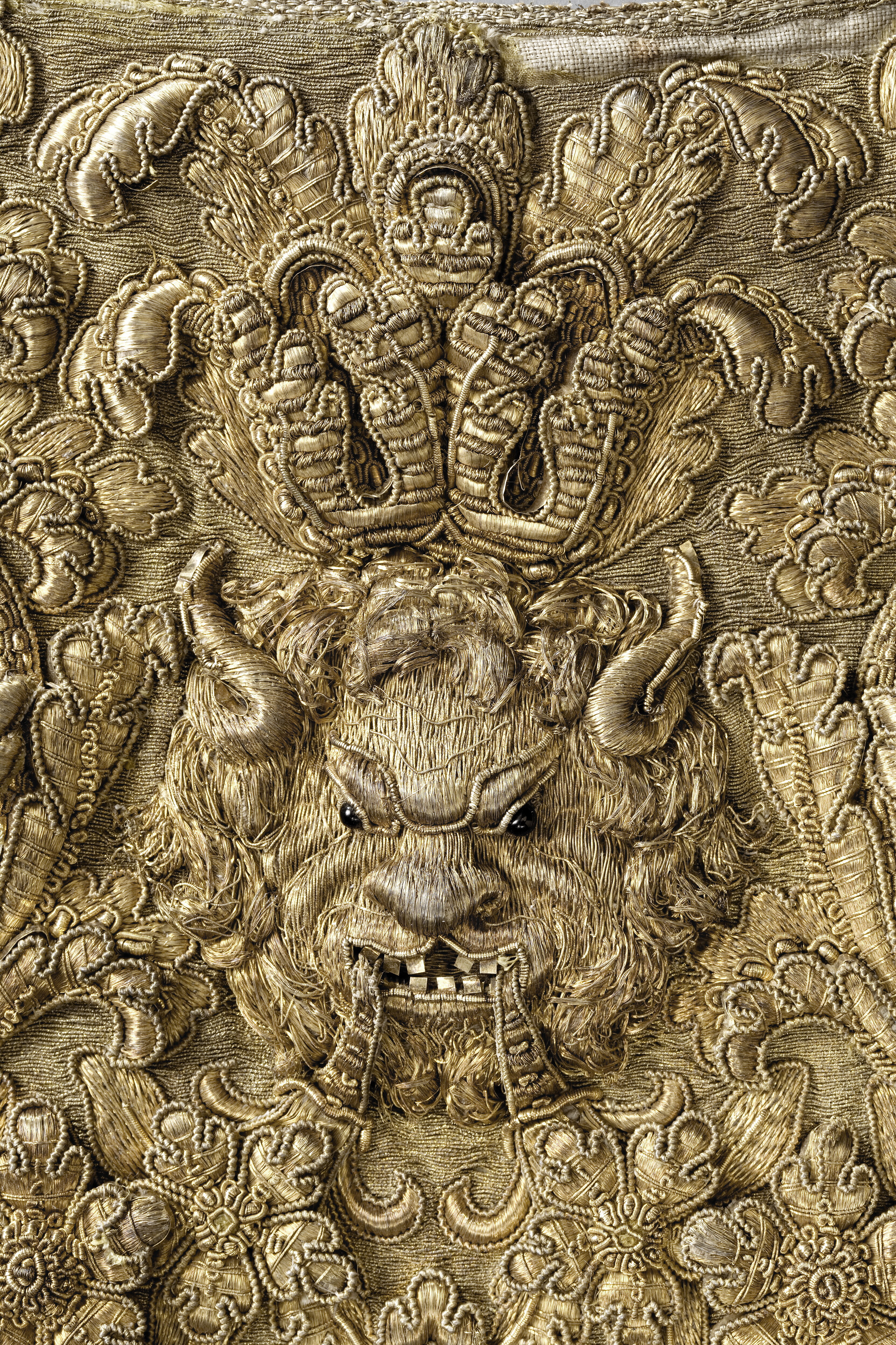- 1 Eschabraque, broderadt med guld och massiva kantiljer i upphöjdt arbete med troféer på wirkad guldbotten samt försedt med förgyld frans och kantiljer.
