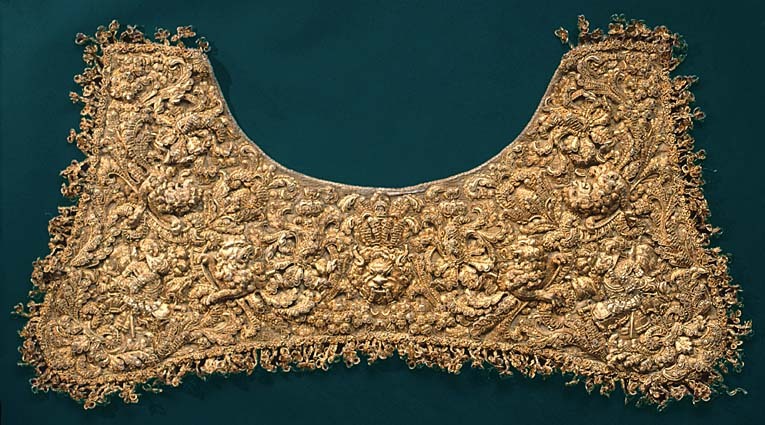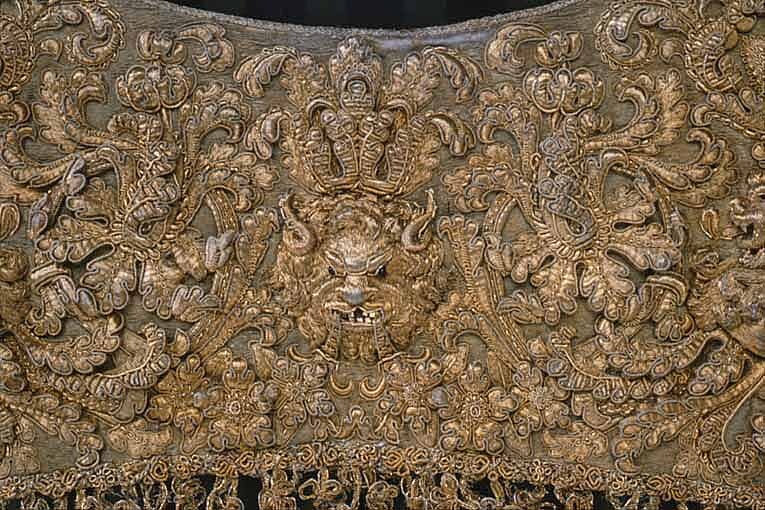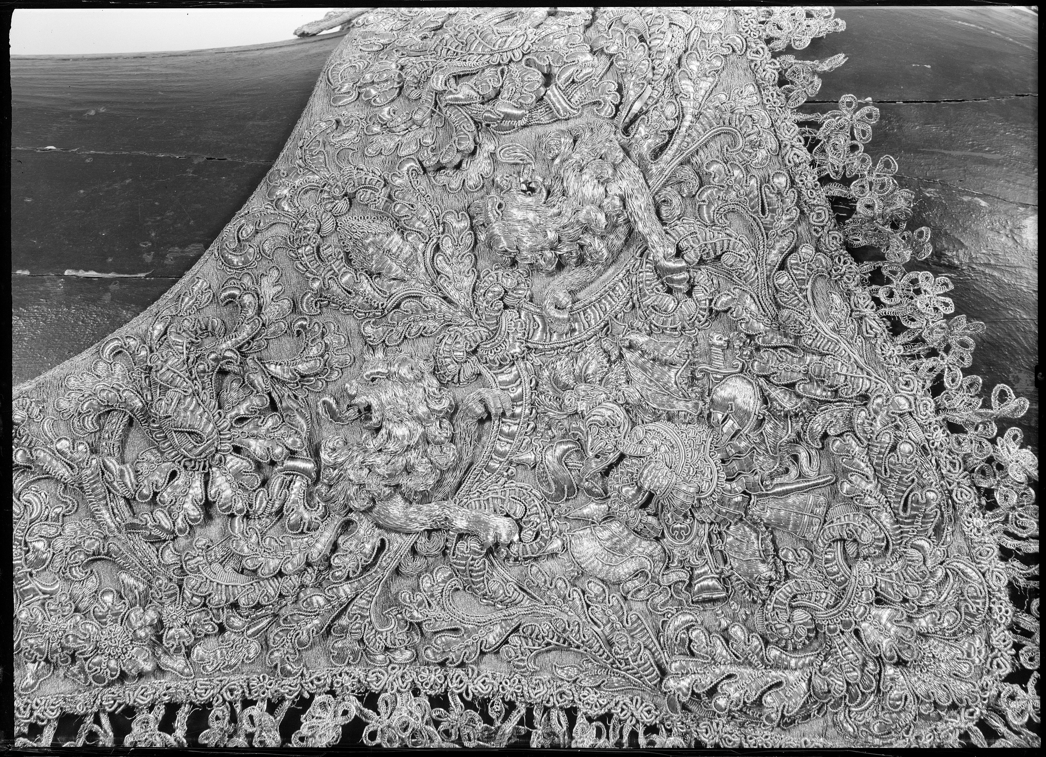 - Schabrak, broderadt med guld och massiva kantiljer i upphöjdt arbete med troféer på virkad guldbotten ...