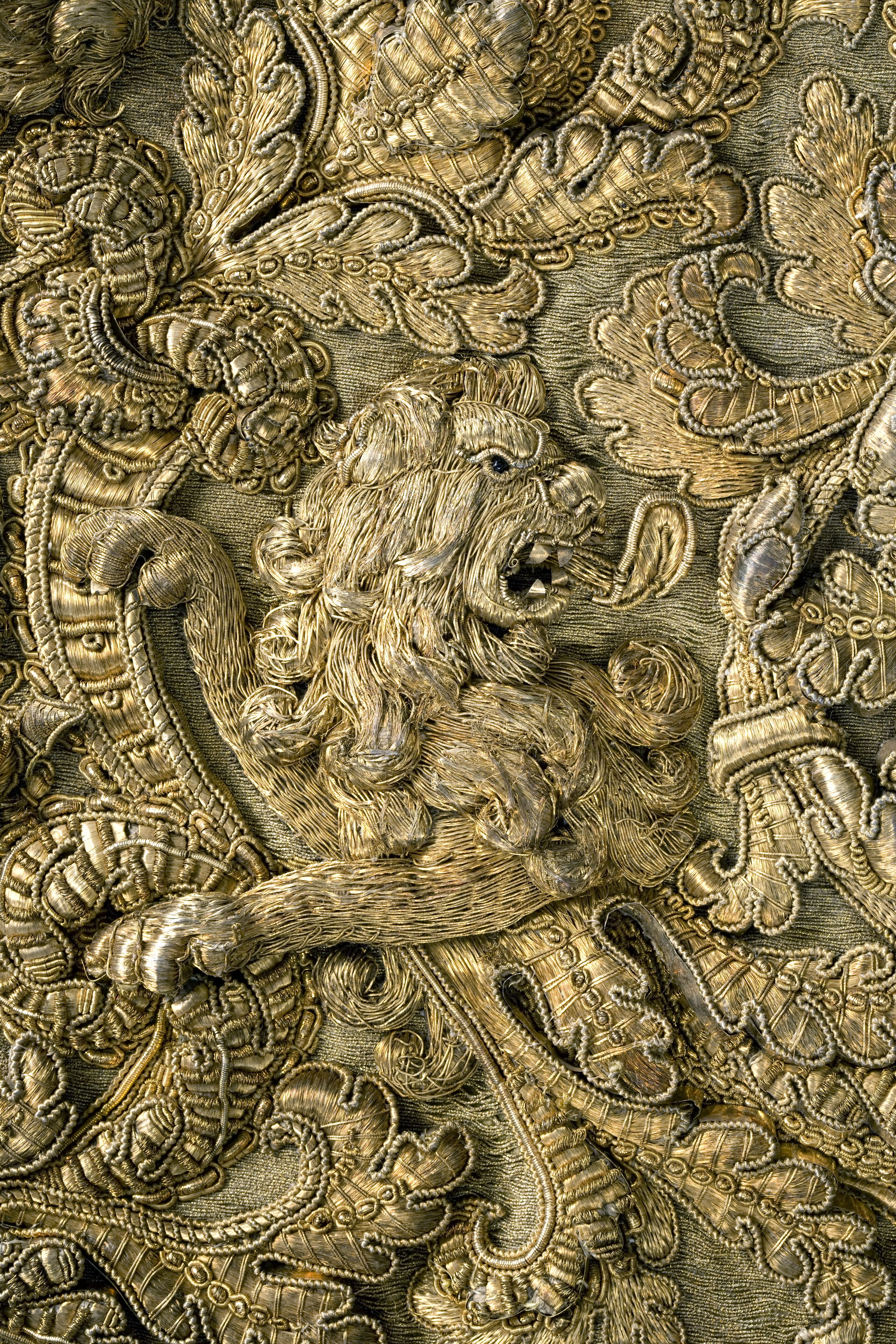 En Förbögel sammanflätad med därvid hängand 5 st broderade Lejon-hufvuden uti Fem stycken förgylte Mässingsringar, hvaruppå finnes 16 stycken Knappar af Massive Silfver Cantiller de 2ne som felar visar nästföregående Inventario.