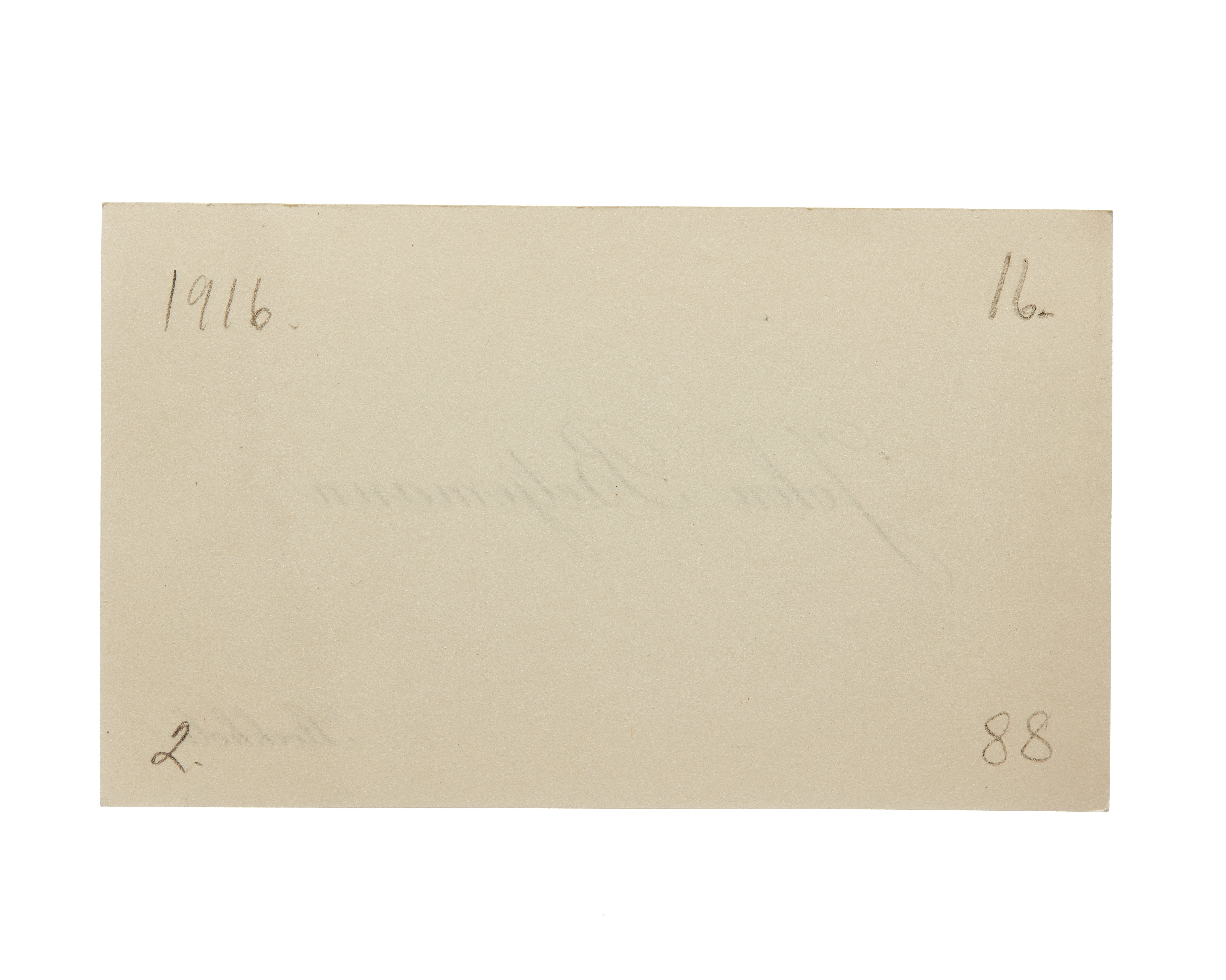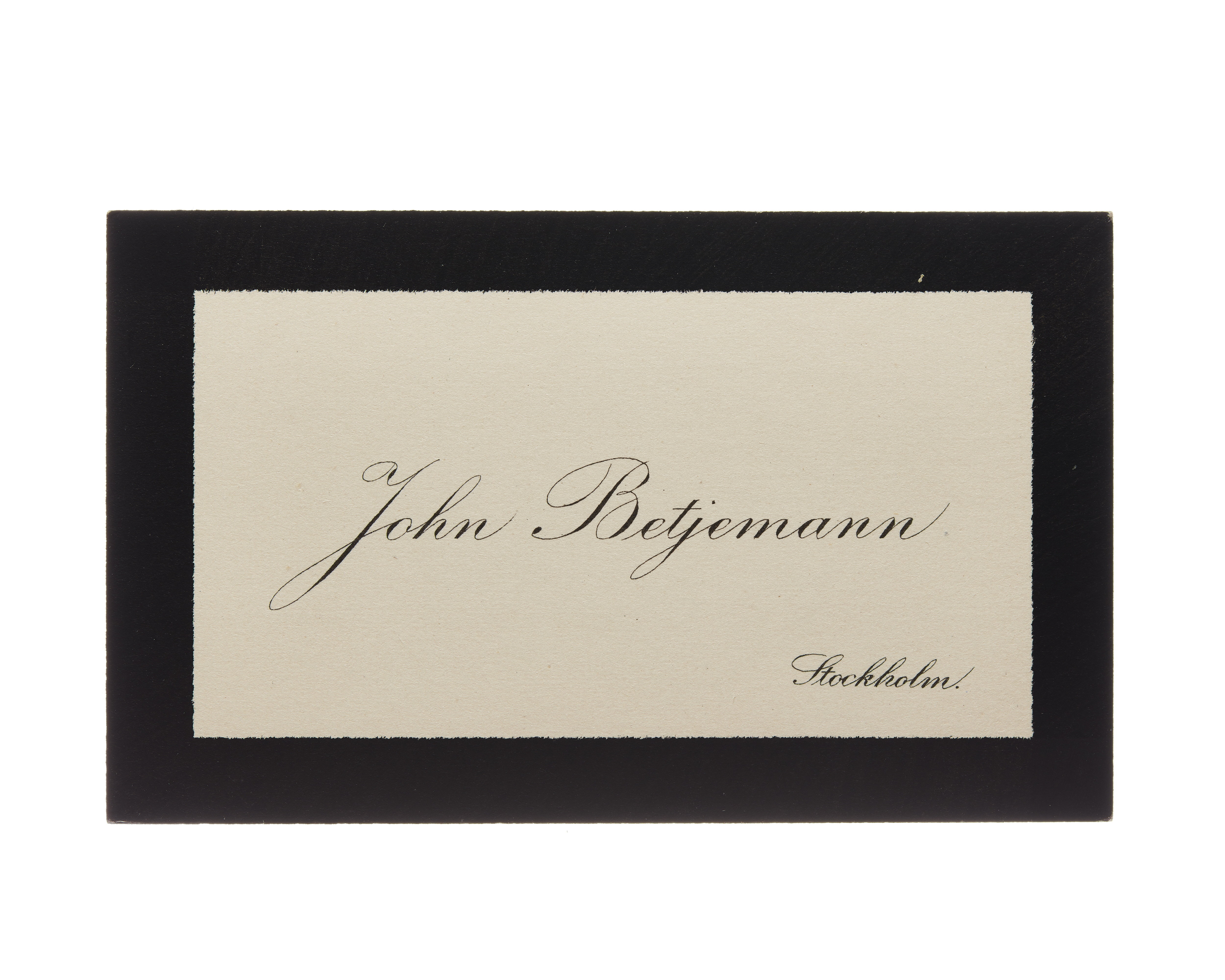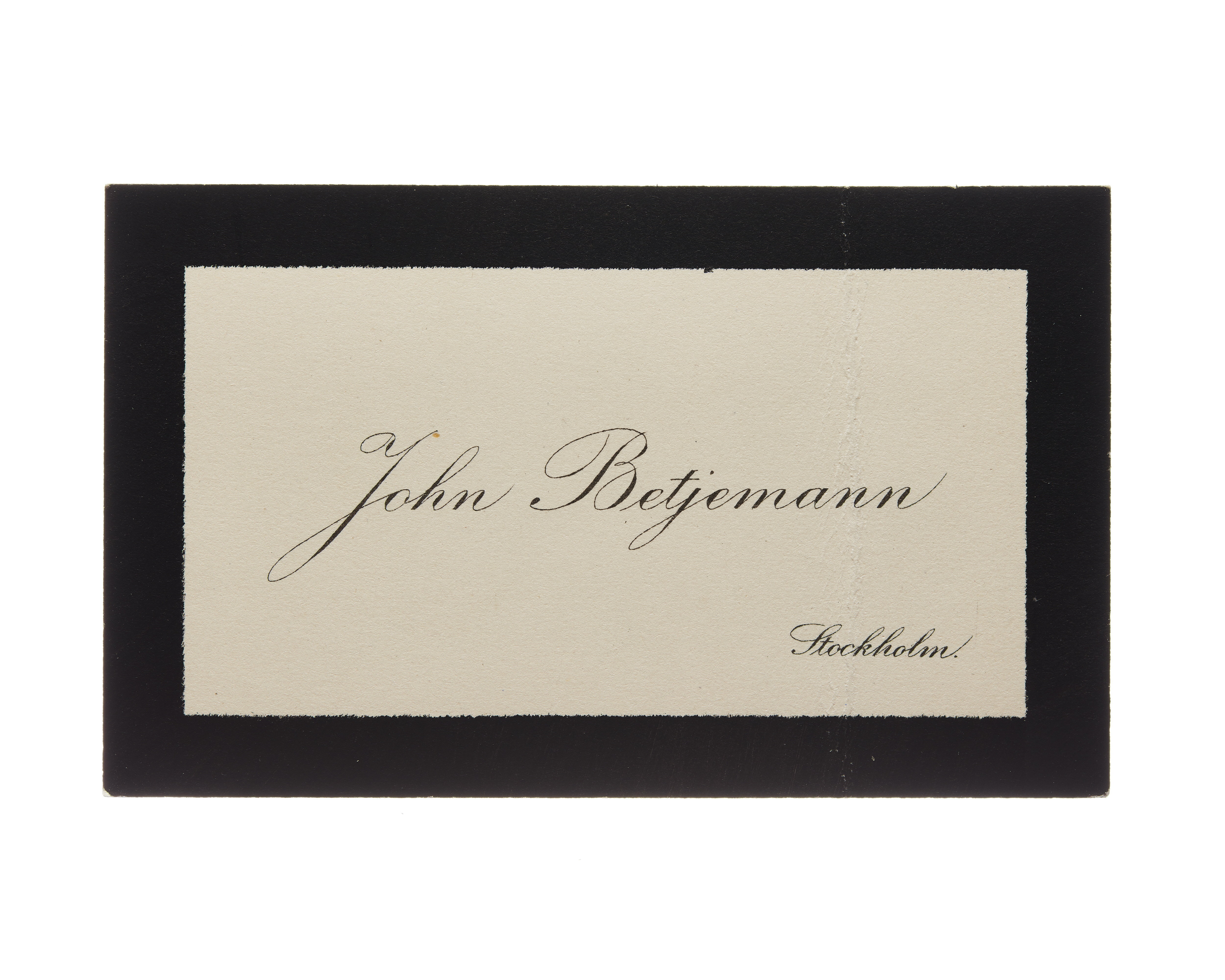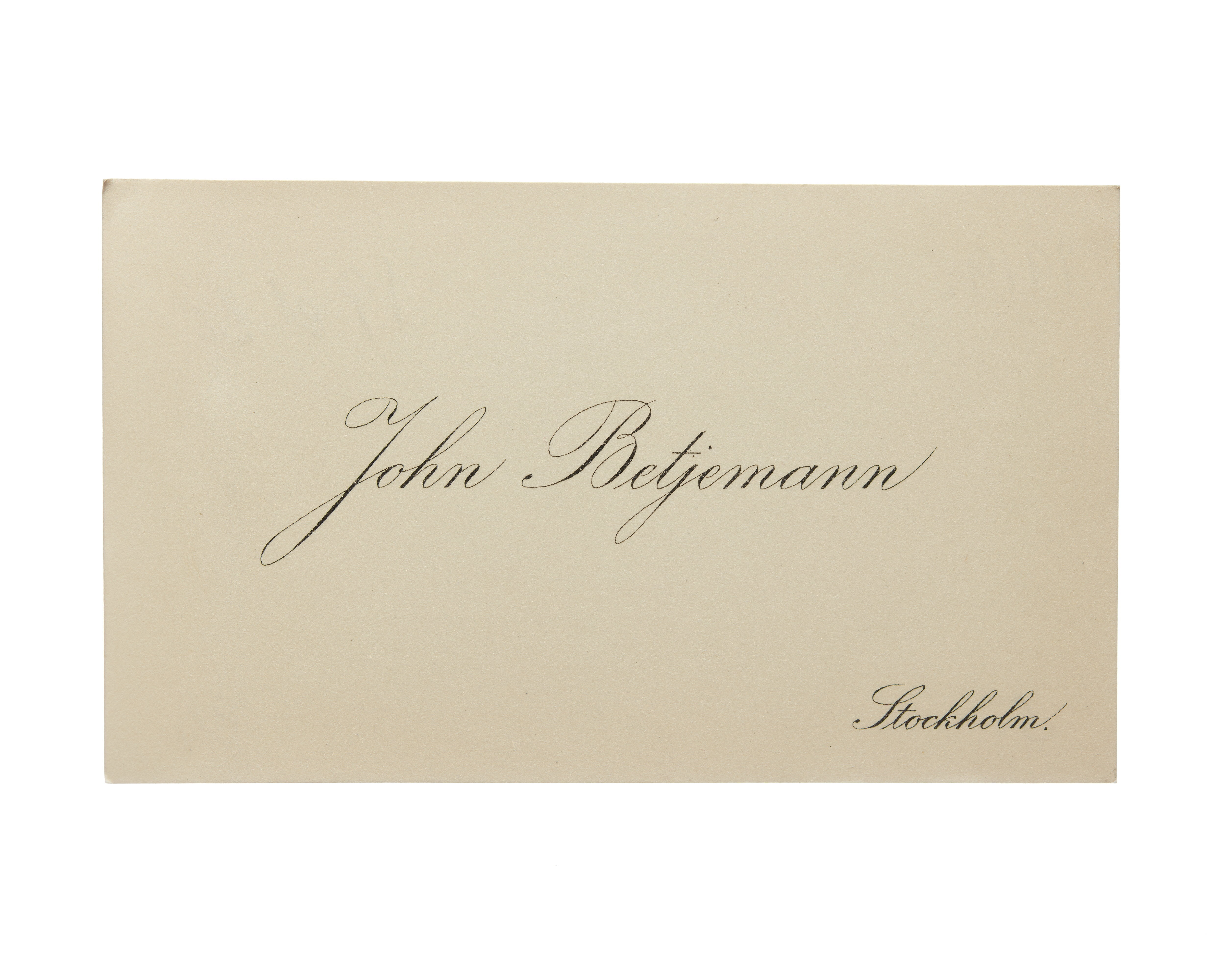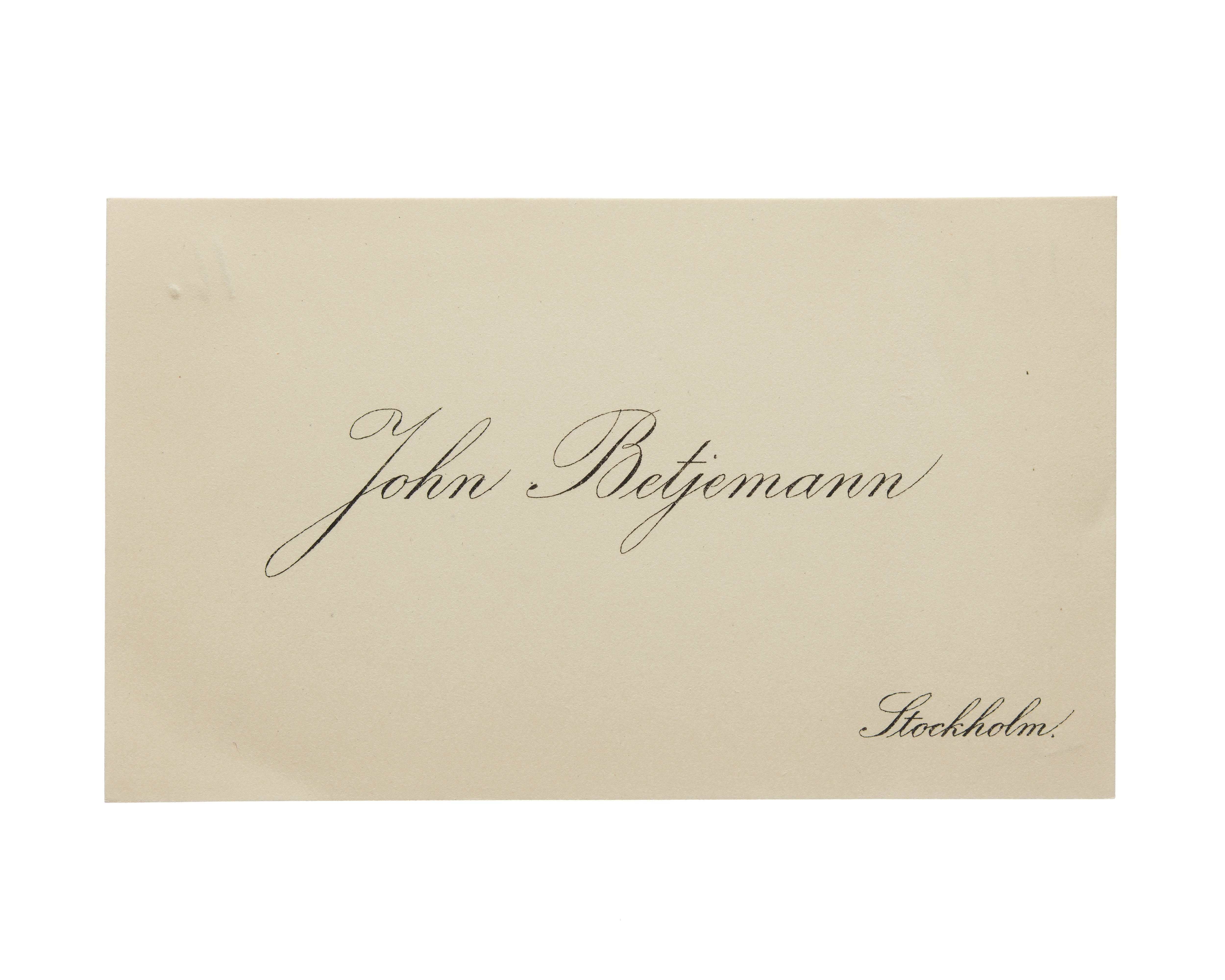 Åtta visitkort från prokurist John Betjmann. Första kortet är utan datum, adress (nedre högra hörnet) Stockholm, vikt i högra sidan. Andra kortet daterat 1916, adress (nedre högra hörnet) Stockholm, vikt i högra sidan. Tredje kortet daterat 1916, adress (nedre högra hörnet) Stockholm, vikt i högra sidan. Fjärde kortet daterat 1917, adress (nedre högra hörnet) Stockholm, vikt i vänstra sidan. Femte kortet daterat 1919, adress (nedre högra hörnet) Stockholm, vikt i vänstra sidan. Sjätte kortet är utan datum, sorgkant, adress (nedre högra hörnet) Stockholm, vikt i högra sidan. Sjunde kortet daterat 1918, sorgkant, adress (nedre högra hörnet) Stockholm. Åttonde kortet daterat 1919, adress (nedre högra hörnet) Stockholm, vikt i högra sidan
