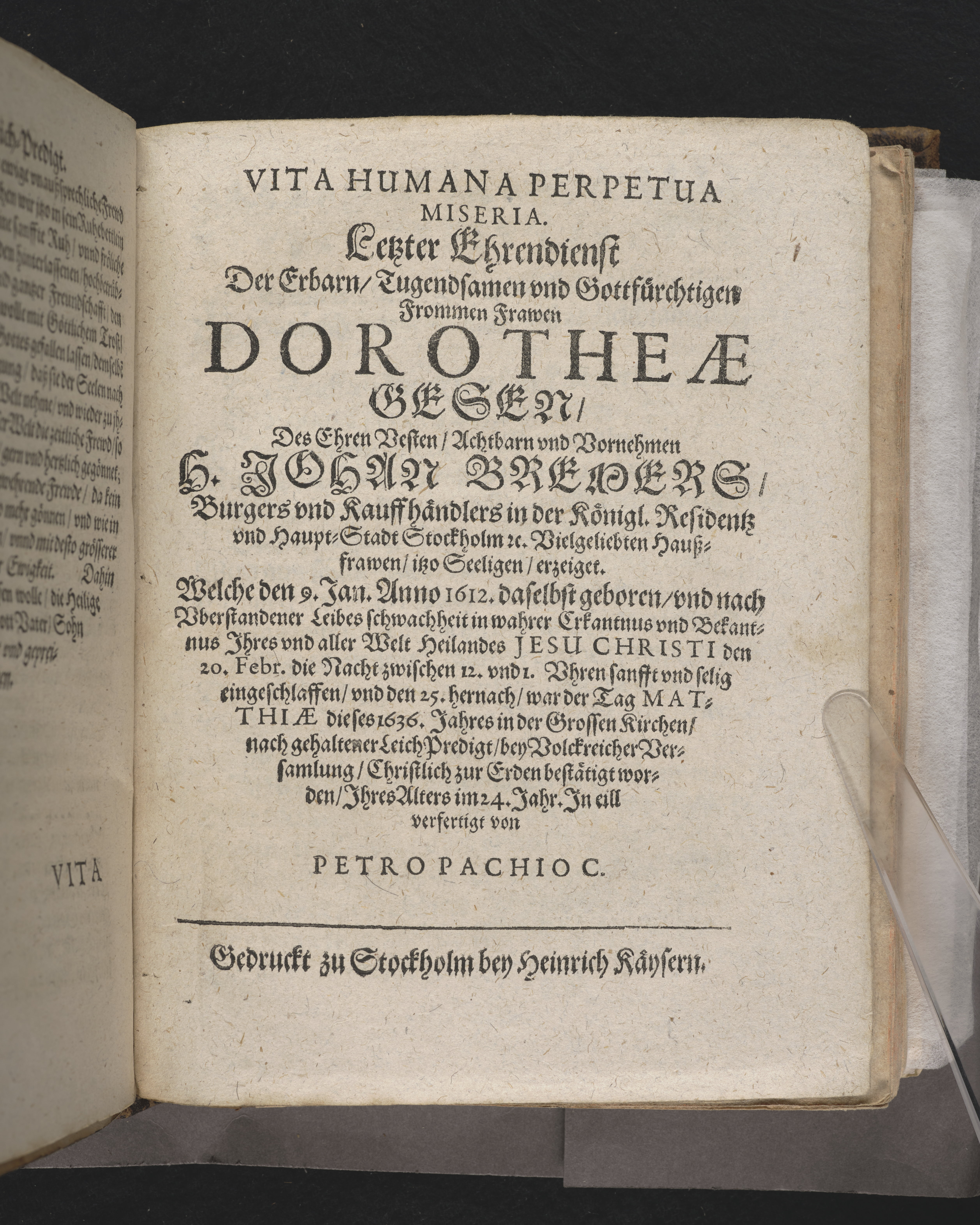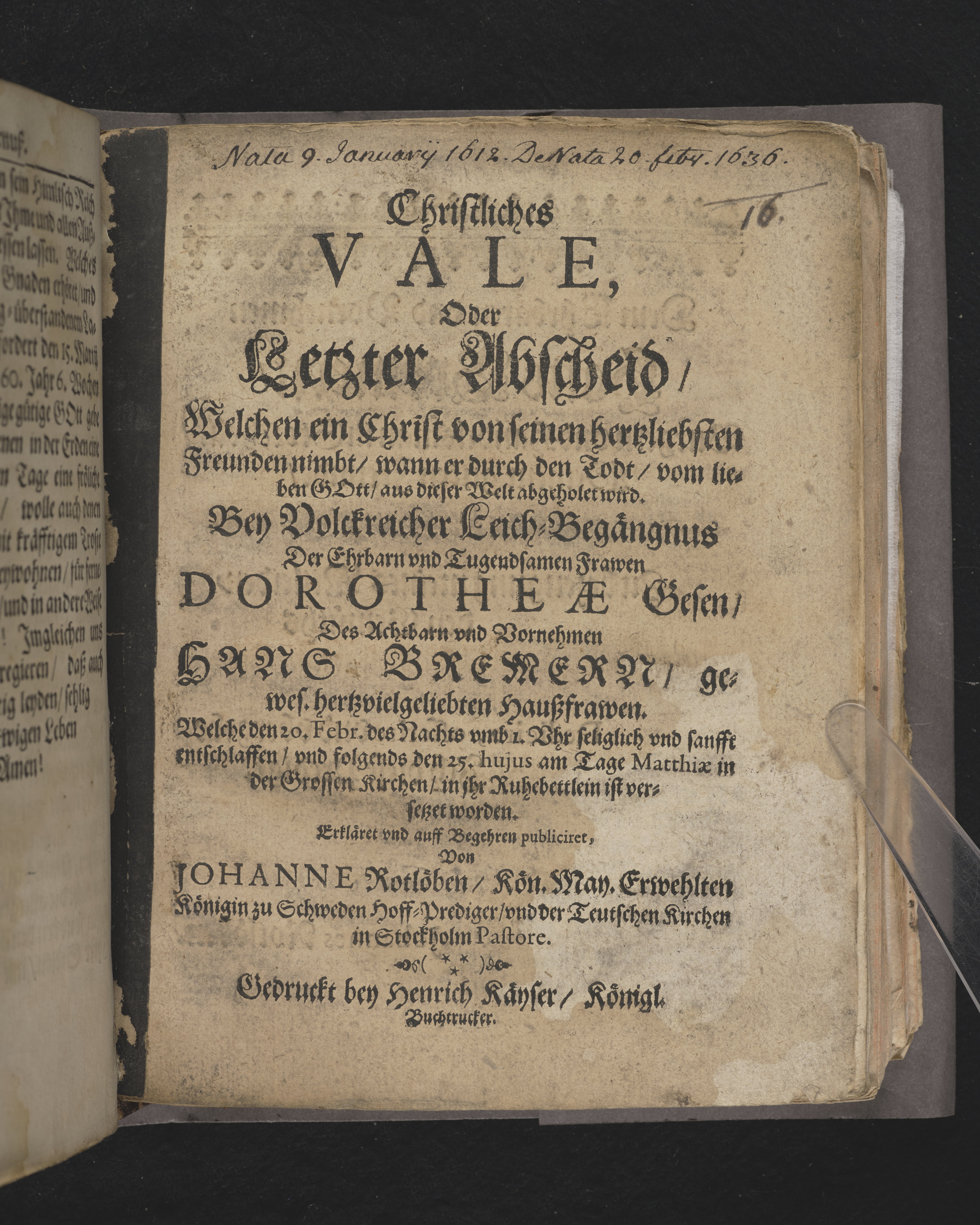 Christliches Vale, oder letzter Abscheid ... bey volckreicher Leich-begängnus der ehrbarn vnd tugendsamen Frawen Dorotheæ Gesen, des achtbarn vnd vornehmen Hans Bremern, gewes. hertzvielgeliebten Hauszfrawen. Welche den 20. Febr ... entschlaffen, vnd folgends den 25. hujus am Tage Matthiæ in der grossen Kirchen, in ihr Ruhebettlein ist versetzet worden. Erkläret vnd auff Begehren publiciret, von Johanne Rotlöben ... Gedruckt bey Henrich Käyser, königl. Buchtrucker.