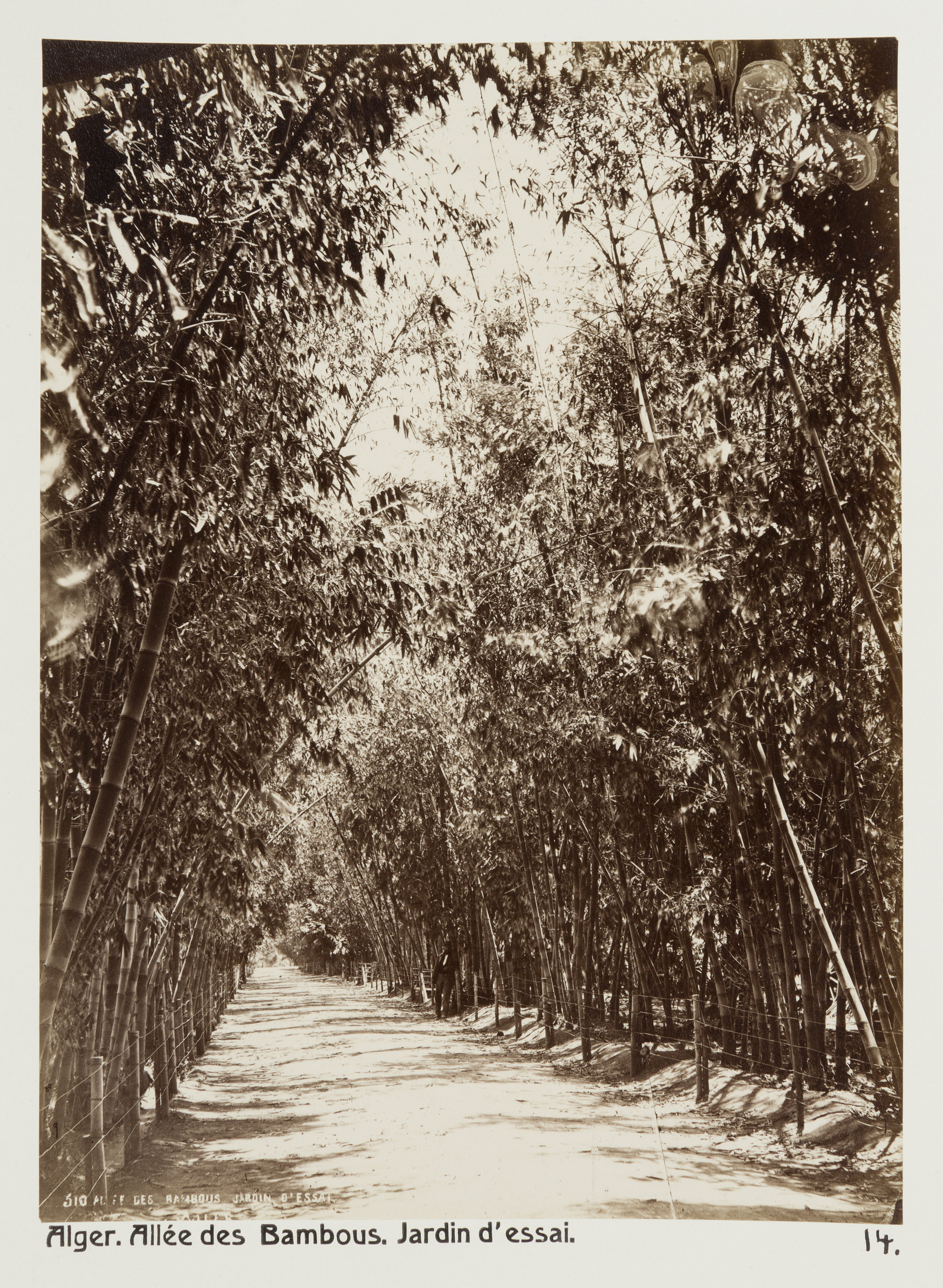 Alger, Algeriet. Bambuallé. Jardin d'Essai. Bilden är en dubblett till LXVI:F.15. Bilderna med inventarienummer LXVI:K.H.01.-137. är inköpta av Johanna Kempe, f. Wallis, i Alger, Biskra, Tunis, Constantine, Oran och Blidah vid hennes vistelse i nämnda städer tillsammans med sin dotter och svärson, Wilhelmina och Walther von Hallwyl, dotterdottern Irma samt fröknarna Caroline Pflaum och Ida Uhse under deras resa genom Algeriet och Tunisien samt åter över Schweiz 11 februari - 19 maj 1889. Förestående uppgifter lämnade med ledning av fröken Ida Uhses Reseanteckningar. Vissa av bilderna är dubbletter till bilder i inventarienummerserien LXVI:F.01.-138. som köptes in av Wilhelmina von Hallwyl under samma resa.