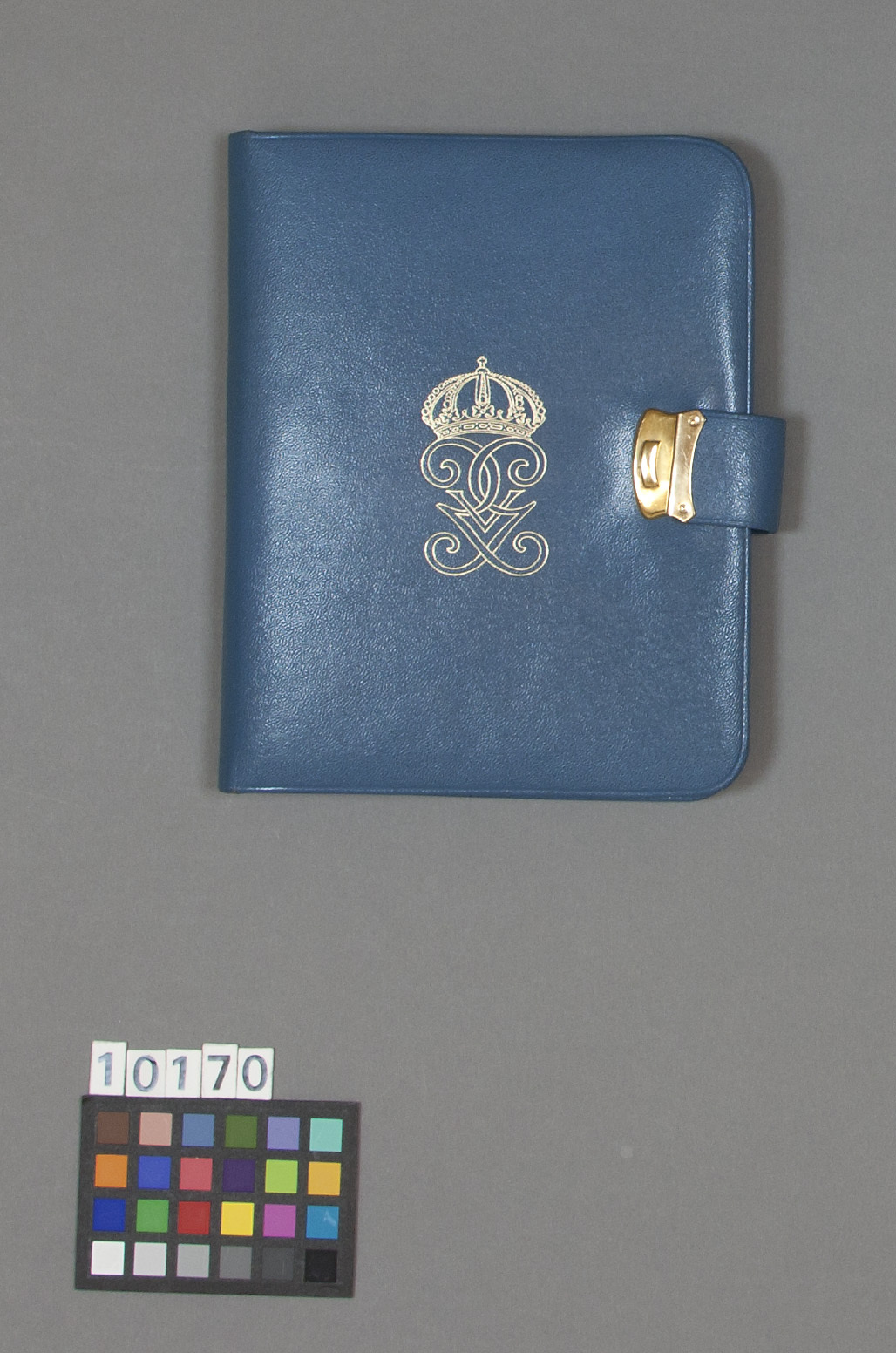 Nåletui av ljusblått skinn (får) fodrat med brunt skinn. På utsidan pressat med guld: spegelvänt G, romersk V nedanför kunglig krona (Gustaf V:s monogram). Etuiet låses med slejf och knäpplås, det senare av mässing, slejfen kantad med mässing. På insidan halvcirkelformad hållare av blått skinn med sju fack för stora brodernålar vari placerat 6 st nålar med ögon av gulmetall, nedanför dessa en rak hållare, fodrad med vit flanell och svart bomull med tio grupper av nålar av varierande storlek och antal, tillsammans 156 nålar. Nedanför dessa pressat med guld siffror från vänster:"1,3,5,7,9,10,8,6,4,2" samt text: "EMBROIDERY". Därefter en fällbar slät platta helt överklädd med brunt skinn och nästa sida två raka nålars av blått skinn med nålar. Den övre med 118 nålar, pressade siffror med guld: "14,16,18, 2, 4, 6, 8, 7, 5, 3, 1, 17, 15" och nedanför dessa text:"TAPESTRY". Den nedre med 84 nålar, siffror med guld: "14, 16, 18, 2, 4, 6, 8, 7, 5, 3, 1, 17, 15" samt text: "CHENILLE".