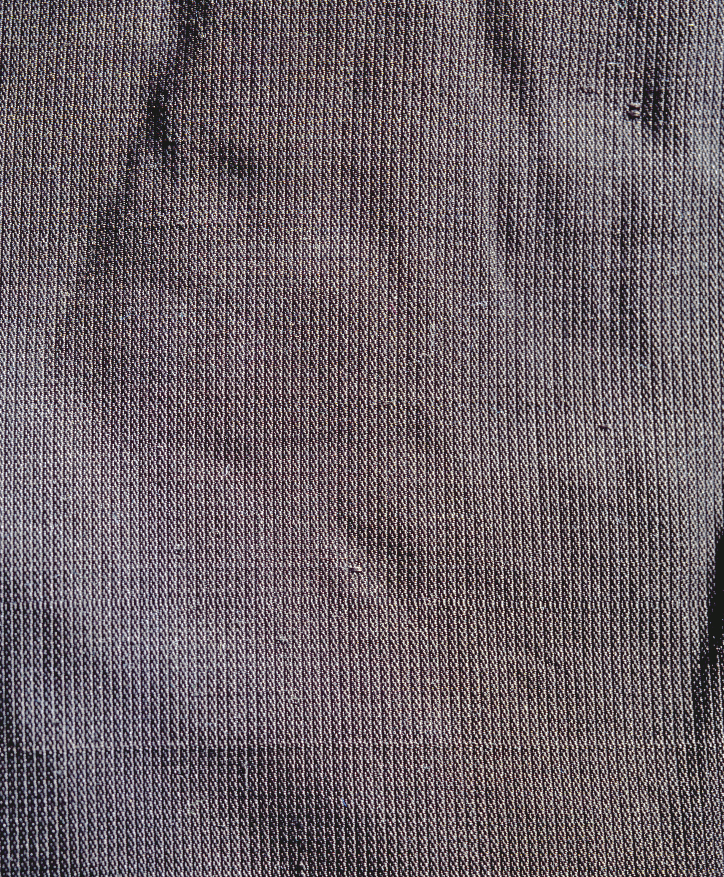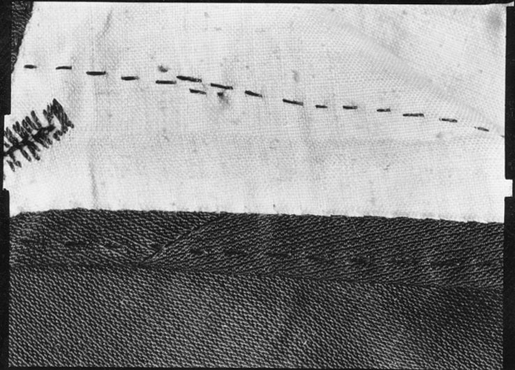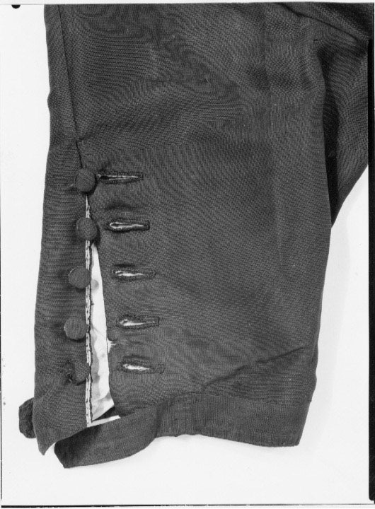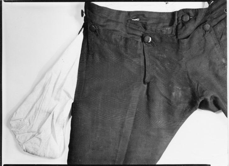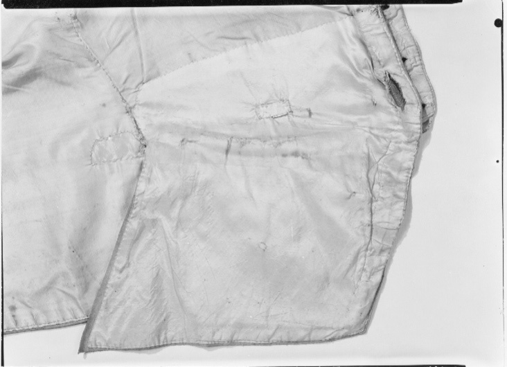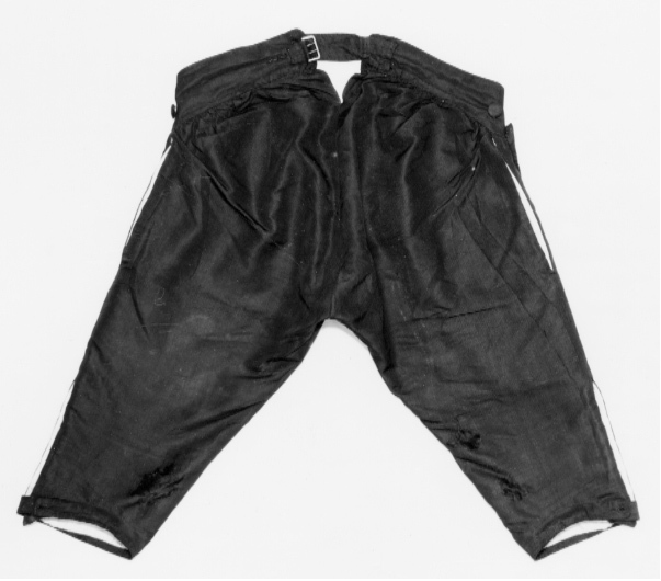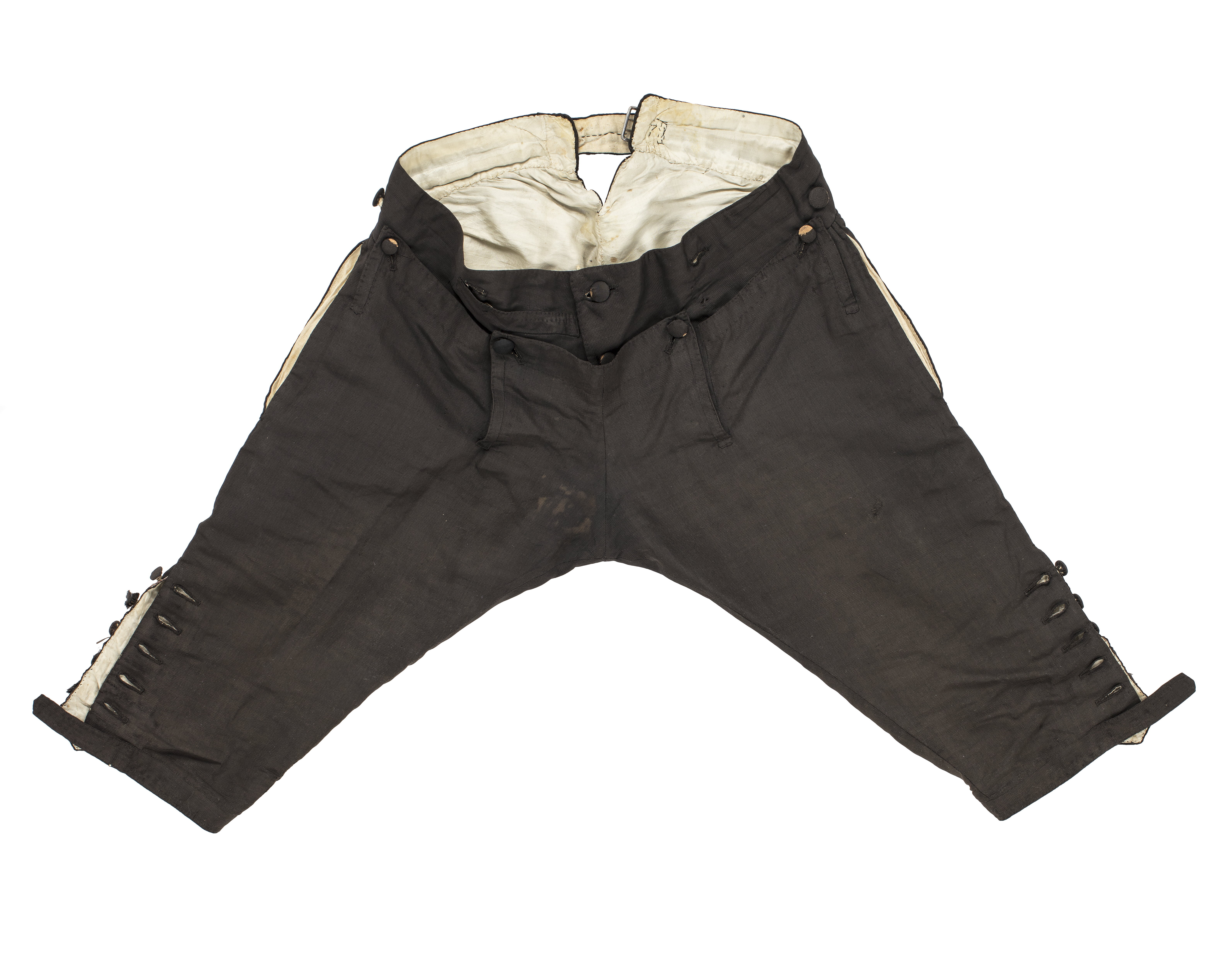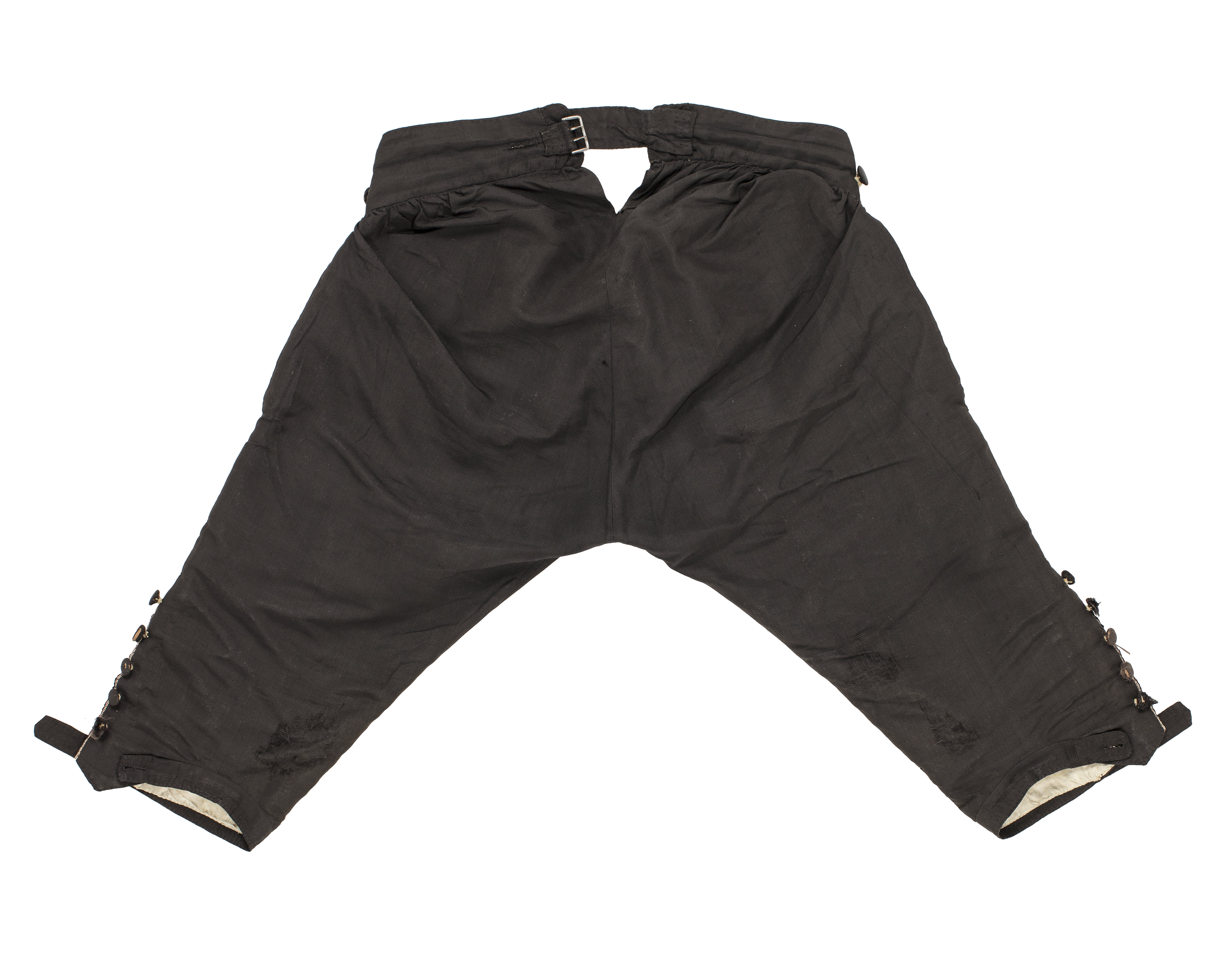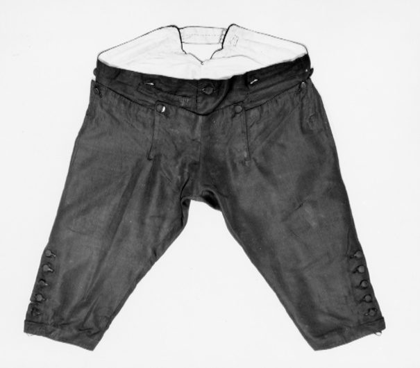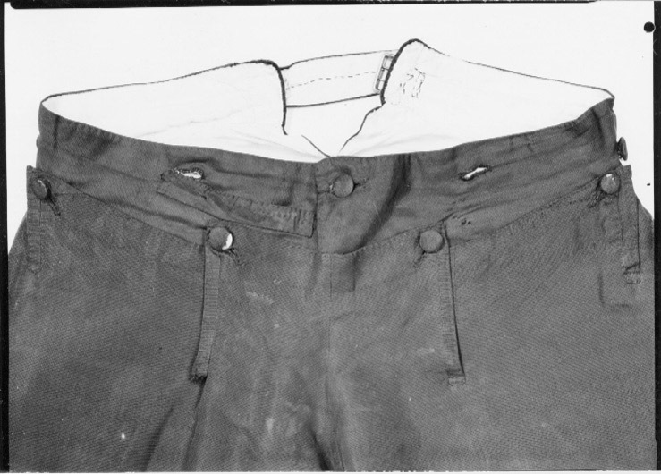 Byxor i silkestrikå med lucka fram och fem fickor. Stor och rymlig baksida som rynkats mot linningen. Urringade baktill vid knävecken och en 2,5 cm bred benlinning med knapphål bak. Där bensprundet knäpps sticker byxan ned som en snibb eller spets underlinningen. Sprundet knäpps med fem knappar (15 mm) Knapphålen är sydda i yttertyget med brun tråd och kastade på fodersidan med ljus tråd. Sleijfen mitt bak är tagen på skrådden. På vänster sida finns ett knapphål som ev. ska möte en knapp på sleijfen, nu är knapphålet igensytt och på slejfen finns ett metallspänne som troligen ej är ursprungligt. Sprundet bak i midjan är 11,5 cm långt. I luckans hörn finns snedställda knapphål och sidorna på luckan har en stolpe som fungerar som kant till luckan. På frambyxan finns på vardera sida en större liggande ficköppning som knäpps i hörnen med snedställda knapphål. Tyget är skarvat vid fickand hörn. Ovanför fickan finns knapphål i linningen. Djupa fickpåsar i sidsömmarna, linnepåsar. Biljettficka i linningen på byxans högra sida med fickpåse i linne. Foder i ljus sidenkypert. ev ej ursprungligt!