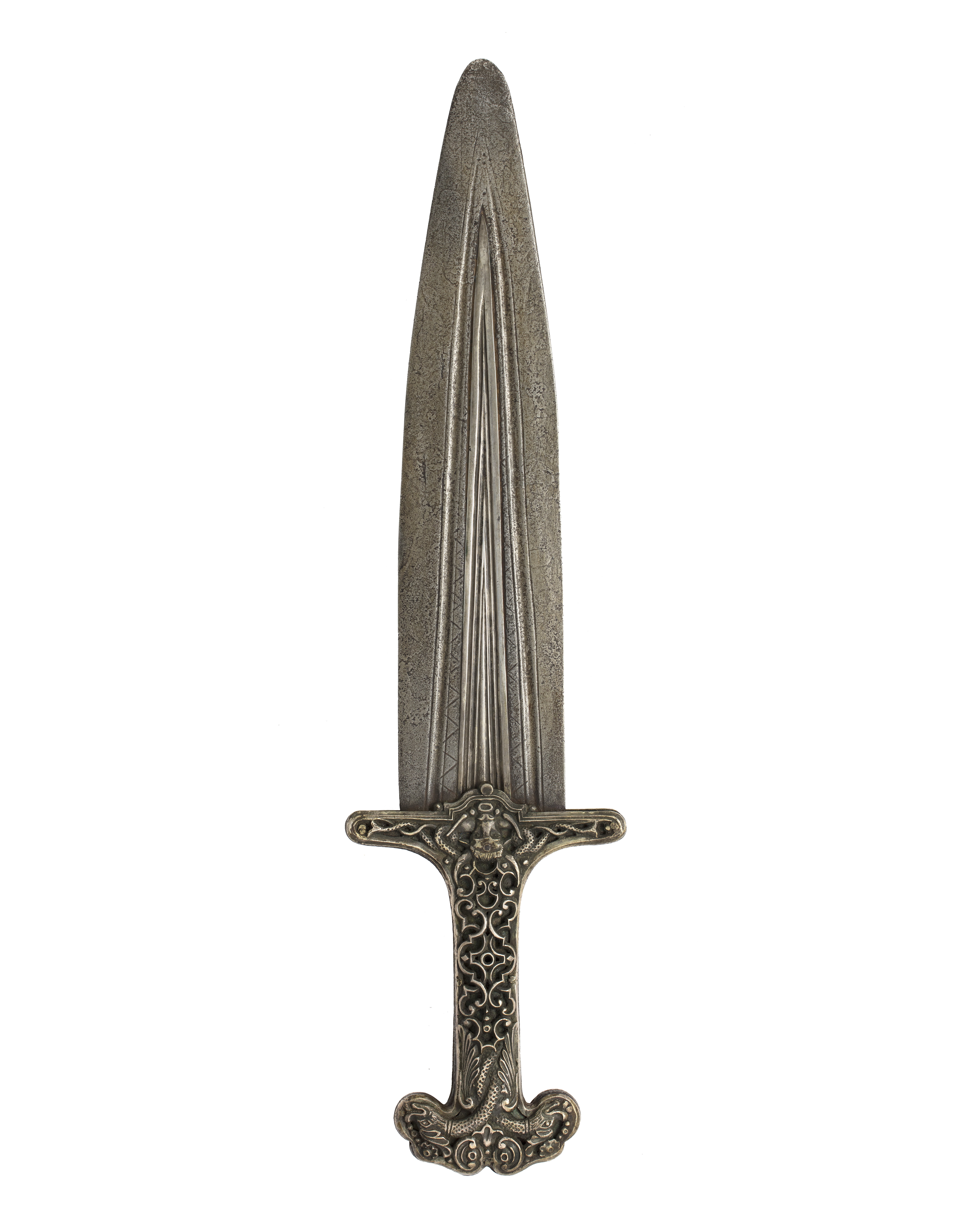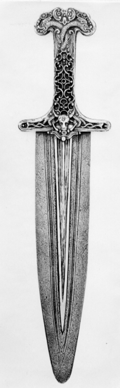 Dolk av stål med symmetriskt fäste och mässingsdekor.