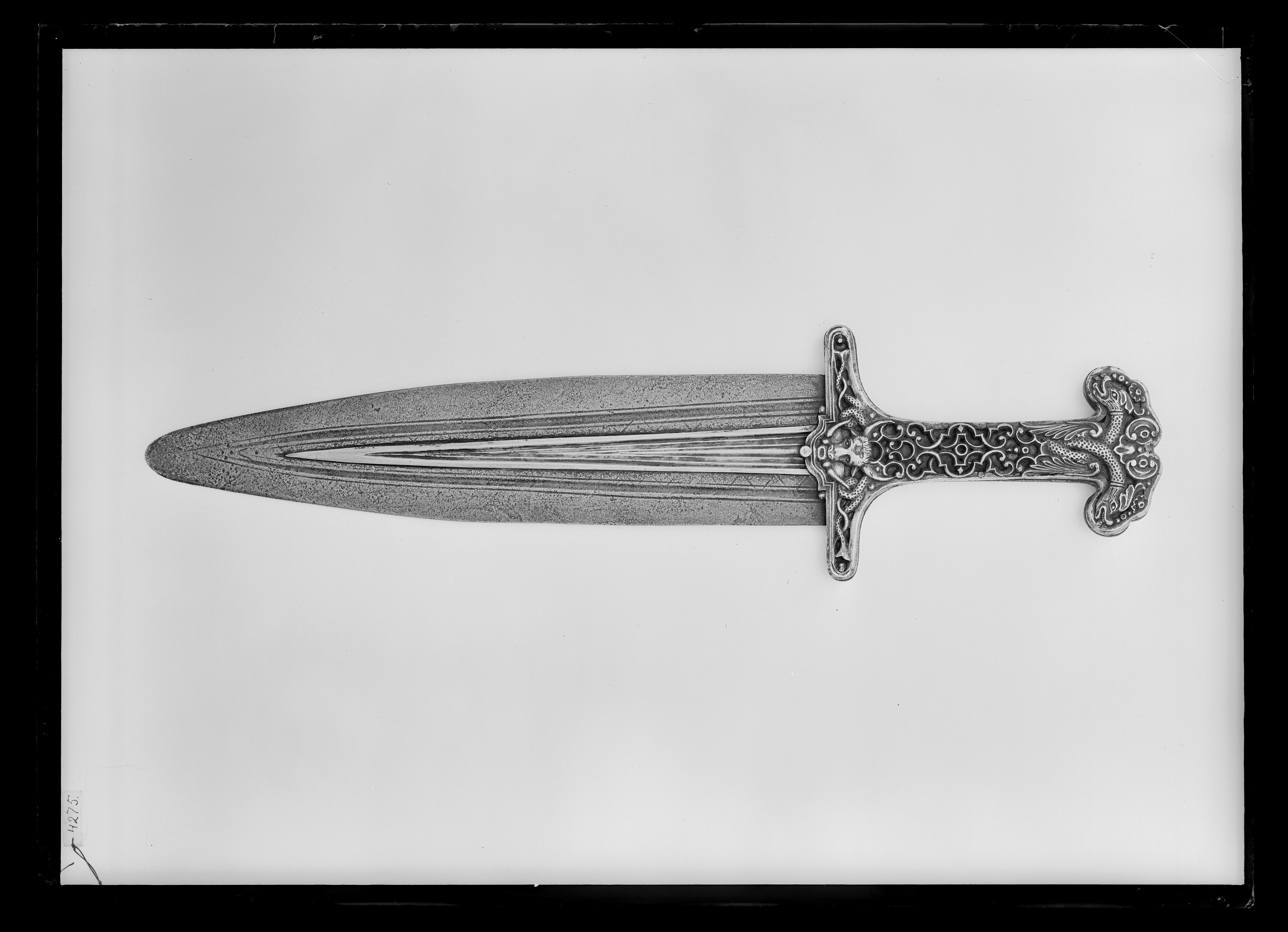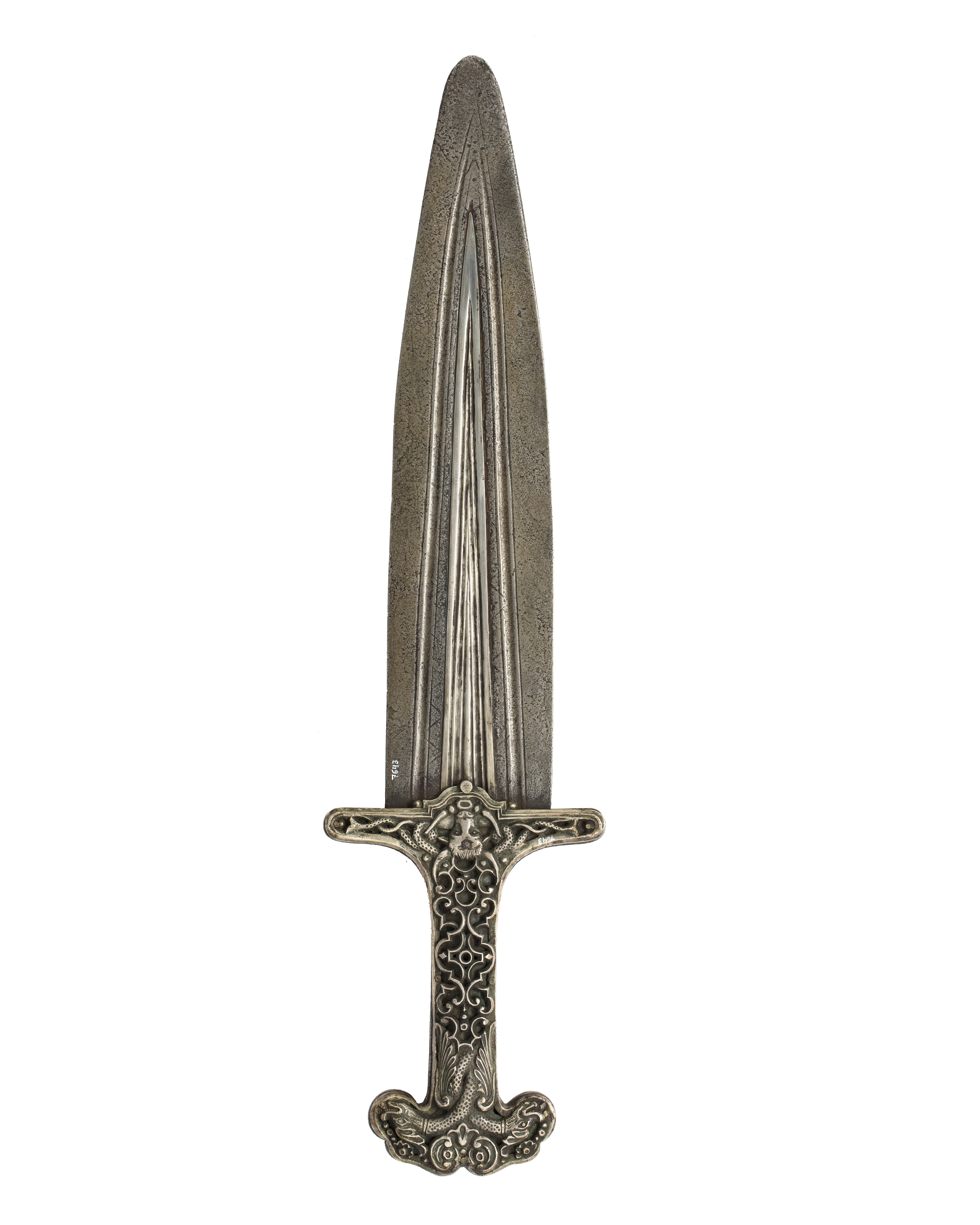 Platt symmetriskt fäste, vidgat upptill och nedtill med skulpterade genombrutna plattor av silver nitade på tången av stål. Tångens sidor inlagda med smal rand av mässing. Gallerverk och upptill på fästet två bevingade drakhuvuden på var sida. Nedtill på fästet ormslingor runt tjurhuvud. Klinga av stål, 69 mm bred, rak, tvåeggad i mitten trekantigt räfflat parti av silver omgivet av hålkälar och sick-sackräfflor. Rundad spets. Skänkt år 1869 av hovmålaren Egron Lundgren (1815-1875) till Livrustkammarens samlingar då utställda i Nationalmuseums lokaler. Gåvan bestod av tre blankvapen av mycket exotisk karaktär, se även nr 7642 och nr 7644! Tio år tidigare hade Lundgren rest med engelska högkvarteret i Indien för att dokumentera Sepoyupproret, en milstolpe i motreaktionerna på den europeiska kolonialismen, i detta fall Englands. Upproret betraktades som kuriöst och historiskt, väl värt att dokumentera. Lundgren hade vid den tiden med stor framgång etablerat sig i England, var mycket uppskattad av drottning Victoria för sina exotiska och orientalistiska målningar, bl a från Sydeuropa och Egypten. Han var även i Sverige intressant för hovet under Karl XV och drottning Lovisas tid. Han har själv skildrat sitt liv som "världsmedborgare" i böcker. En monografi finns om honom i 2 band av Karl Asplund 1915, Nationalmuseum har gett ut två böcker över hans rika målerisamling där i akvarell och olja, 1992, The Painter´s Eye Egron Lundgren and India, S Å Nilsson och utställningskatalog1995.