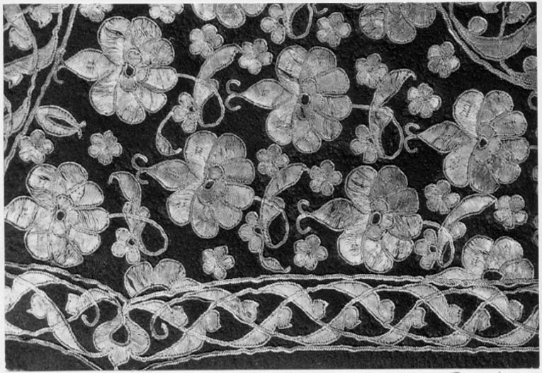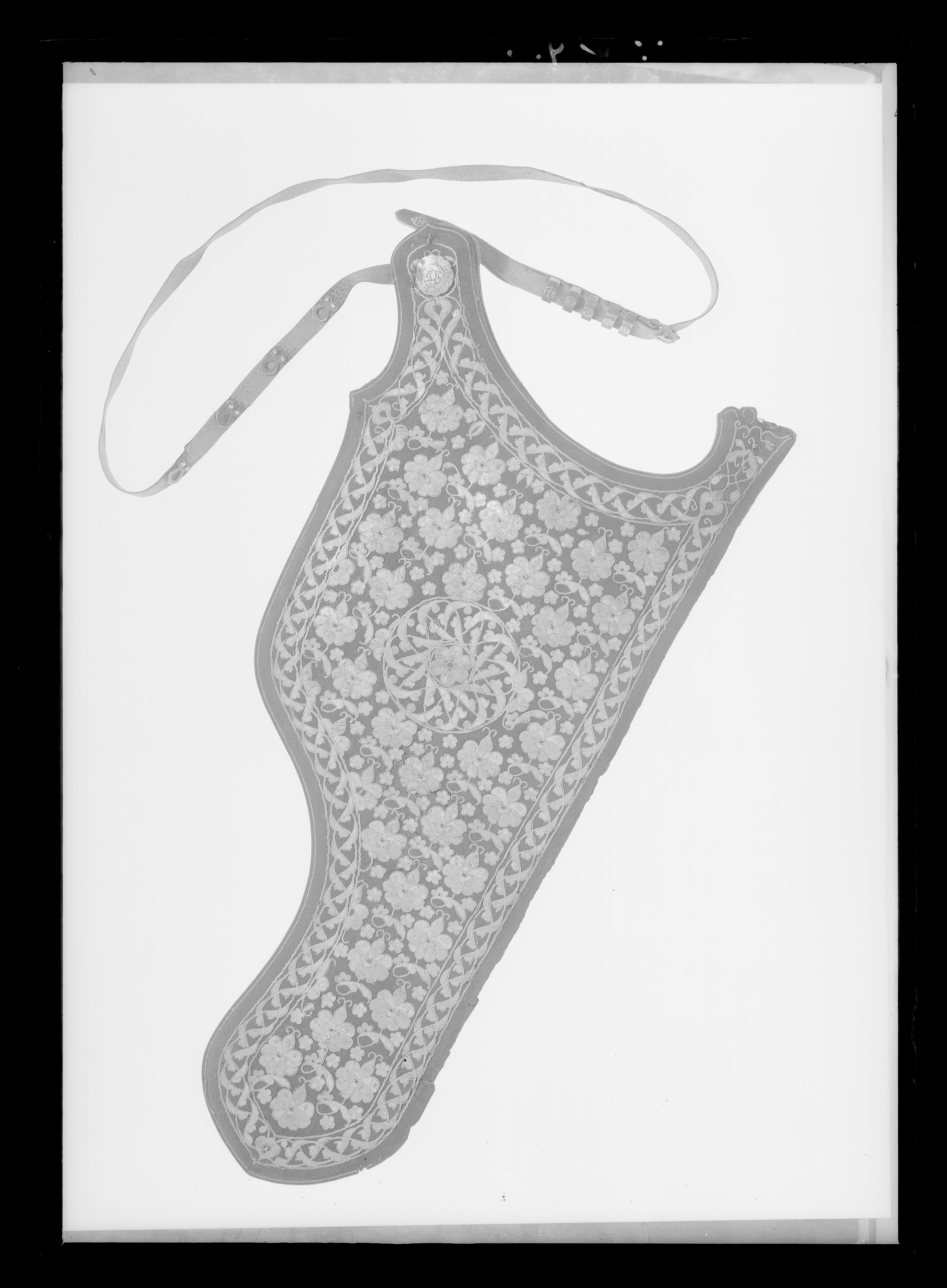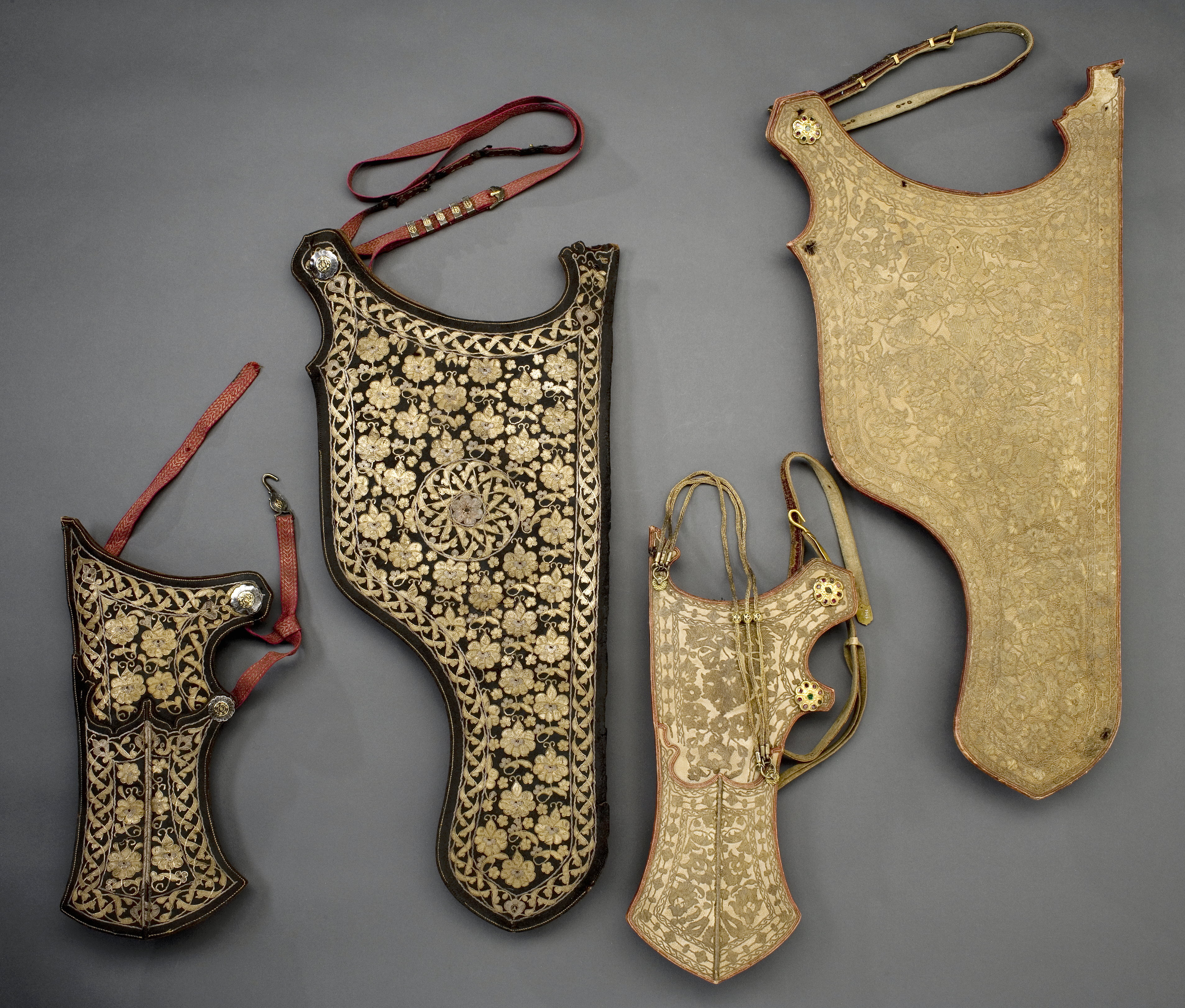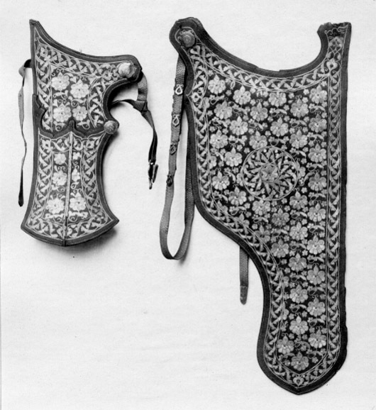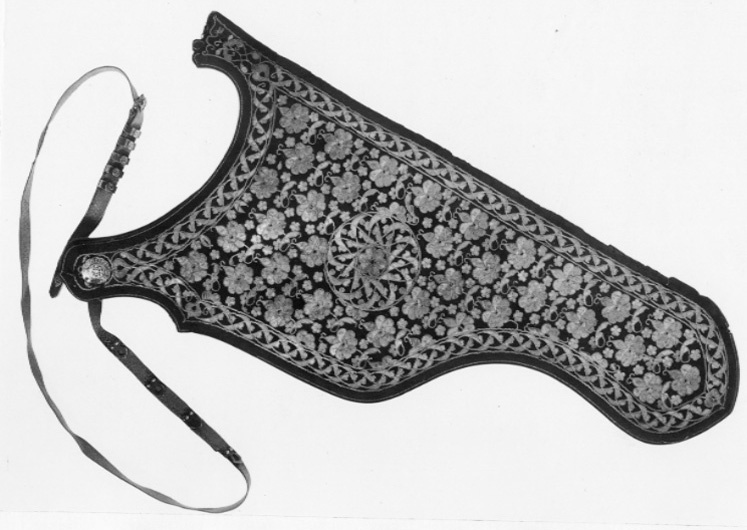 Bågkoger av svärtat läder, foder av brunt läder. På kogrets insida förstärkning av rött läder med konturerad kant. På utsidan yttäckande plattsömsbroderi med guld och silvertråd i form av blommor, omgivet av en bladbård. På kogrets ena spets upptill ett runt silverbeslag i form av en blomma med dekor i niello, mittdekor av guld. Tillbehör: Bärrem av rött silke med silvertrådsdekor, beslag av silver med niellodekor, förgyllda nitar och blommor.