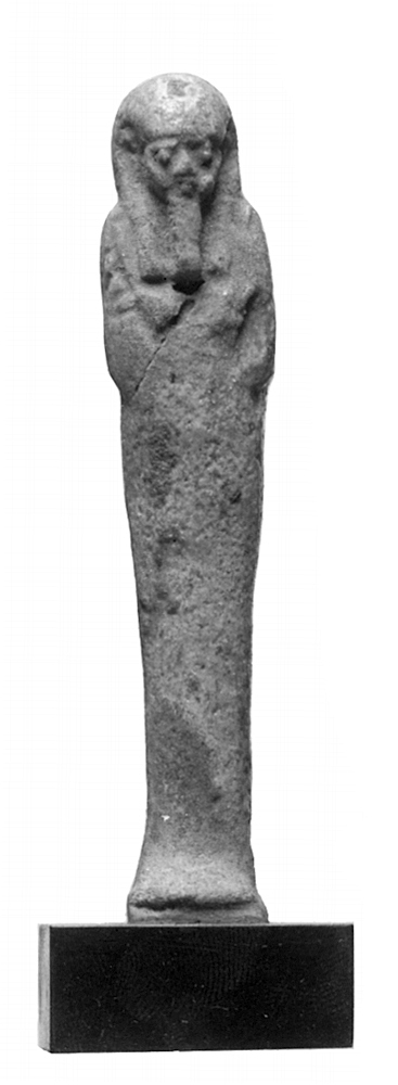 - Af lergods, glaserad i ljust grågrönt. Längd: 9.3 cm.; bredd, öfver bröstet: 1.9 cm. Fotplatta, längd: 1.6 cm.; bredd: 1.4 cm. Om dylika figurer har amanuensen vid Victoria-museet i Uppsala filosofie licentiaten Pehr Lugn lämnat följande upplysningar: Från Mellersta riket (omkring år 2000 f. KR.) till sen tid var det sed i Egypten att lägga ned i grafven hos den döde ett större eller mindre antal graffigurer, s. k. usjebti (egentligen schawabti), ett egyptiskt ord, som plägar öfversättas med »svarare» men ursprungligen torde ha betecknat det träslag, hvaraf figurerna förfärdigades. De som härröra från äldre tid, äro vanligen groft tillyxade i trä, men senare vinnläde man sig om ett mera konstnärligt utförande. Då användes som material icke så mycket trä som fastmer alabaster, kalksten, bränd lera och i synnerhet fajans. Detta sistnämnda material utgöres af fint arbetad lera, öfverdragen med blå eller grön glasyr, ofta i mycket klara och lysande färger. Fajansfigurerna pressades i allmänhet i formar; för förnäma och rika personer tillverkades de ej sällan i hundratal. Träfigurerna äro öfverdragna med asfalt eller på annat sätt målade och försedda med inskriptioner i svart, brun eller gul färg. Äfven usjebti af annat material ha öfverdragits med färg. Ofta s Under 19. dynastien (1350—1205 f. Kr.) uppträda usjebtifigurerna i de lefvandes dräkt med framtill utstående ländkläde, fint veckad linneklädnad och sandaler. De för faraonerna afsedda pläga bära kungadräkt eller åtminstone kungahufva med uraeusorm. Oftast ha dock usjebtifigurerna mumieform med lindorna ibland angifna i särskilda färger; endast ansikte, hals, armar och händer äro synliga. Armarna äro korslagda öfver bröstet, och händerna hålla hackor eller ibland de symboliska tecknen för OSIRIS och Isis: ded-pelaren (ryggraden) och den magiska knuten. På ryggen, undantagsvis i händerna, bära de vanligen en säck, kanske afsedd för att forsla bort sanden, som äfven i den andra världen tänktes drifva in öfver landet från öknen, eller måhända för att förvara utsädet vid sådden. Om halsen bär figurinen ibland en amulett, och öfver bröstet ser man understundom själen i fågelgestalt med människohufvud. Hufvudet är höljdt af det tredelade gudahåret. Männen bära icke sällan gudaskägg. Usjebtifigurerna äro vanligen försedda med respektive ägares namn och titlar i hieroglyfskrift, ofta föregångna af ordet shd (»lysande»). Därjämte återfinner man längre eller kortare utdrag ur kapitel VI i Dödsboken, ibland hela detta kapitel, ehuru i olika variationer. Usjebtifigurerna äro små porträttfigurer af den döde, afsedda att tjäna som ställföreträdare för honom, i händelse han i dödsriket skulle bli kallad till dagsverksarbete, såsom fellaherna plägade bli i denna världen. Gåfva till Wilhelmina von Hallwyl, f. Kempe, en julafton under 1890-talets förra hälft från fröken Charlotte Jakobine Caroline Christiane Mariane Helene Pflaum, f. 28 Oktober 1816 i Nürnberg, Bayern, d. 9 Februari 1909 i Södertelje, hvilken hösten 1852 kom från Tyskland till Sverige som lärarinna åt Wilhelmina Kempe och sedermera stannade i hennes föräldrahem. Gåfva till fröken Caroline Pflaum från en tysk vetenskapsman, som medfört den från en utgräfning i Egypten.