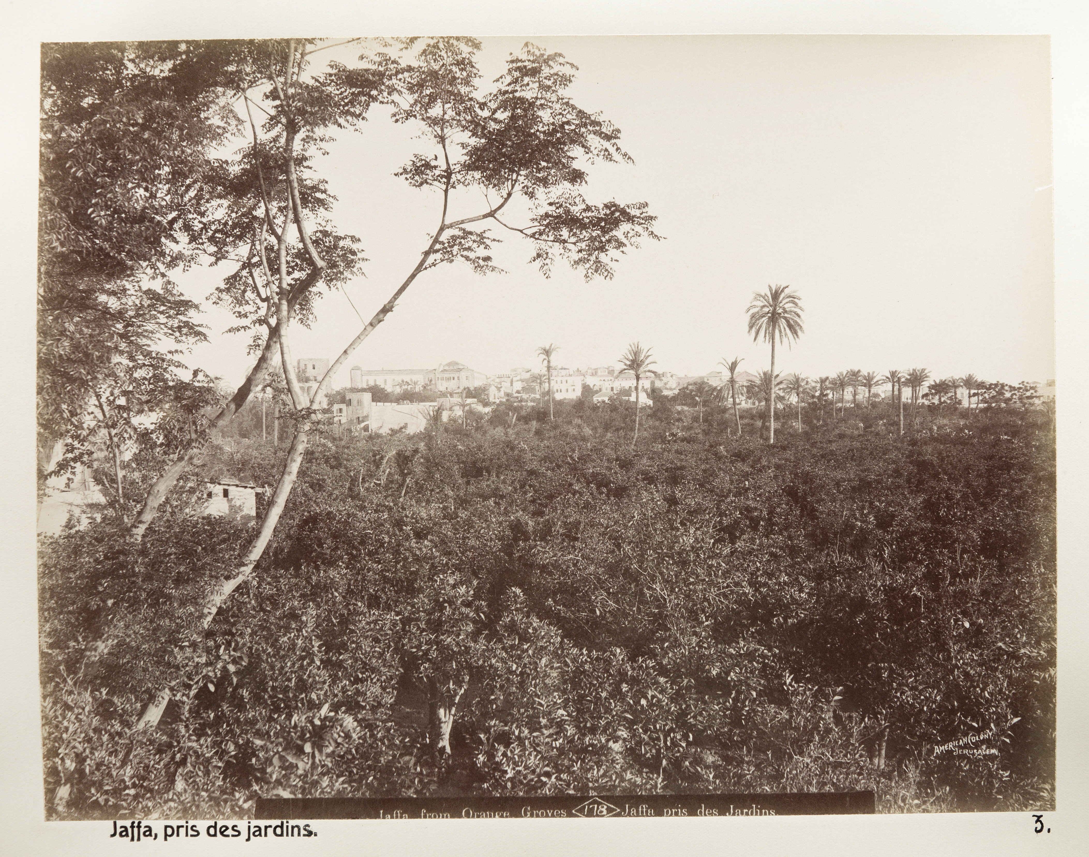 Jaffa, sett från apelsinlundarna. Text på originalet: "Jaffa from Orange Groves./Jaffa pris des jardins." Fotografierna LXVI:N.01.-180. kommer från resan till Palestina och Syrien som Wilhelmina och Walther von Hallwyl gjorde den 30 mars-27 april 1901. De lämnade Sverige den 5 november 1900 för Egypten, där de stannade till den 28 mars 1901, då de fortsatte till Palestina. Med på resan var Wilhelminas sällskapsdam, fröken Ida Uhse. Den 27 april fortsatte de till Turkiet och Mindre Asien. De mindre fotografierna (utom de från Samos) LXVI:N.90.-100. är tagna av Wilhelmina själv, under en resa till häst från Jerusalem till Damaskus 8-20 april 1901. Övriga fotografier är inköpta av Wilhelmina i Jerusalem, Damaskus och Beirut. Alla uppgifter kommer från Ida Uhses reseanteckningar.