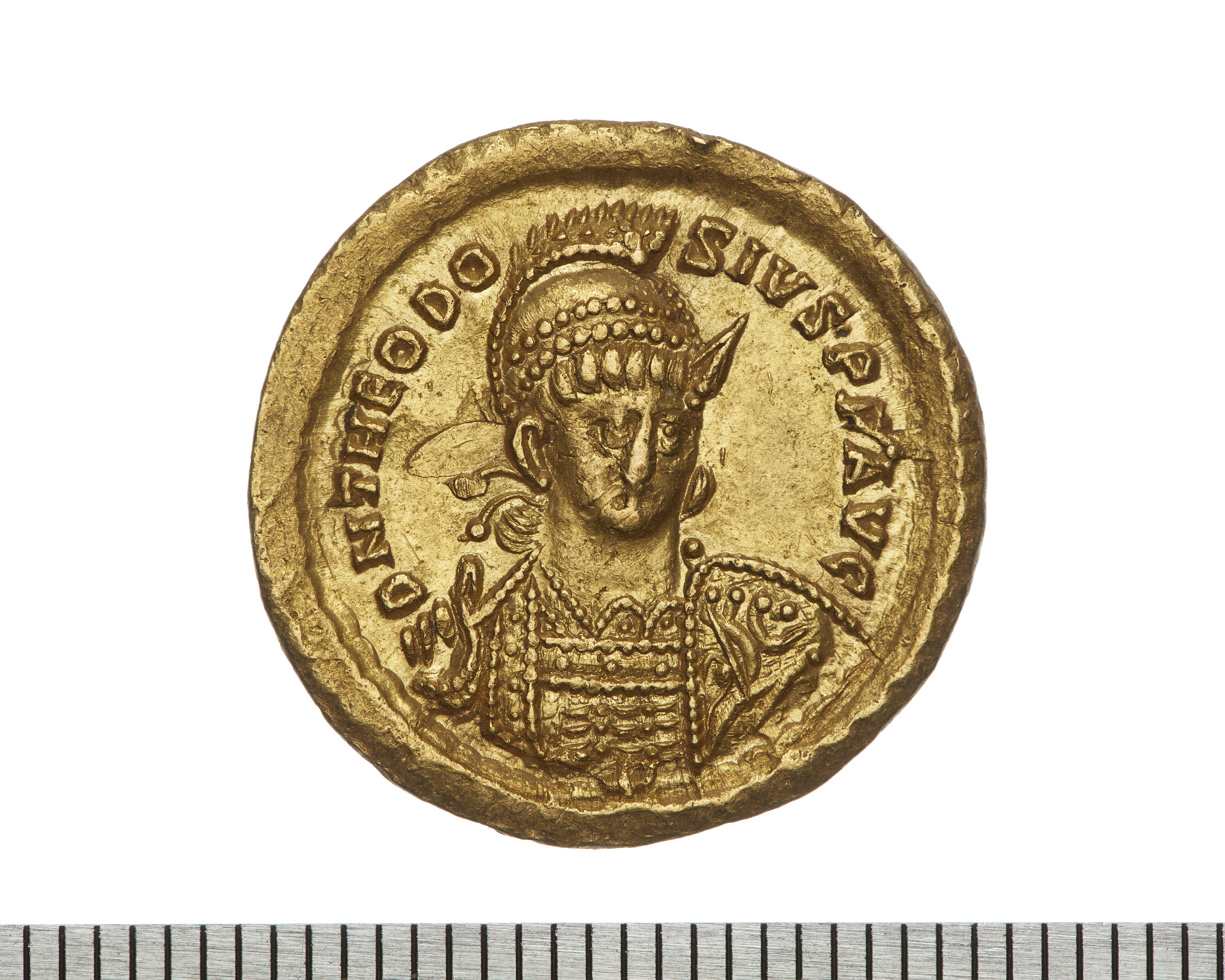 Upphov: Theodosius II. Media: Bonnevier, Helena. Ekonomiska museet - Kungliga myntkabinettet/SHM, (CC BY 4.0) Du får bearbeta och dela verket för alla ändamål, även kommersiella, så länge du anger upphovsperson och licensgivare.