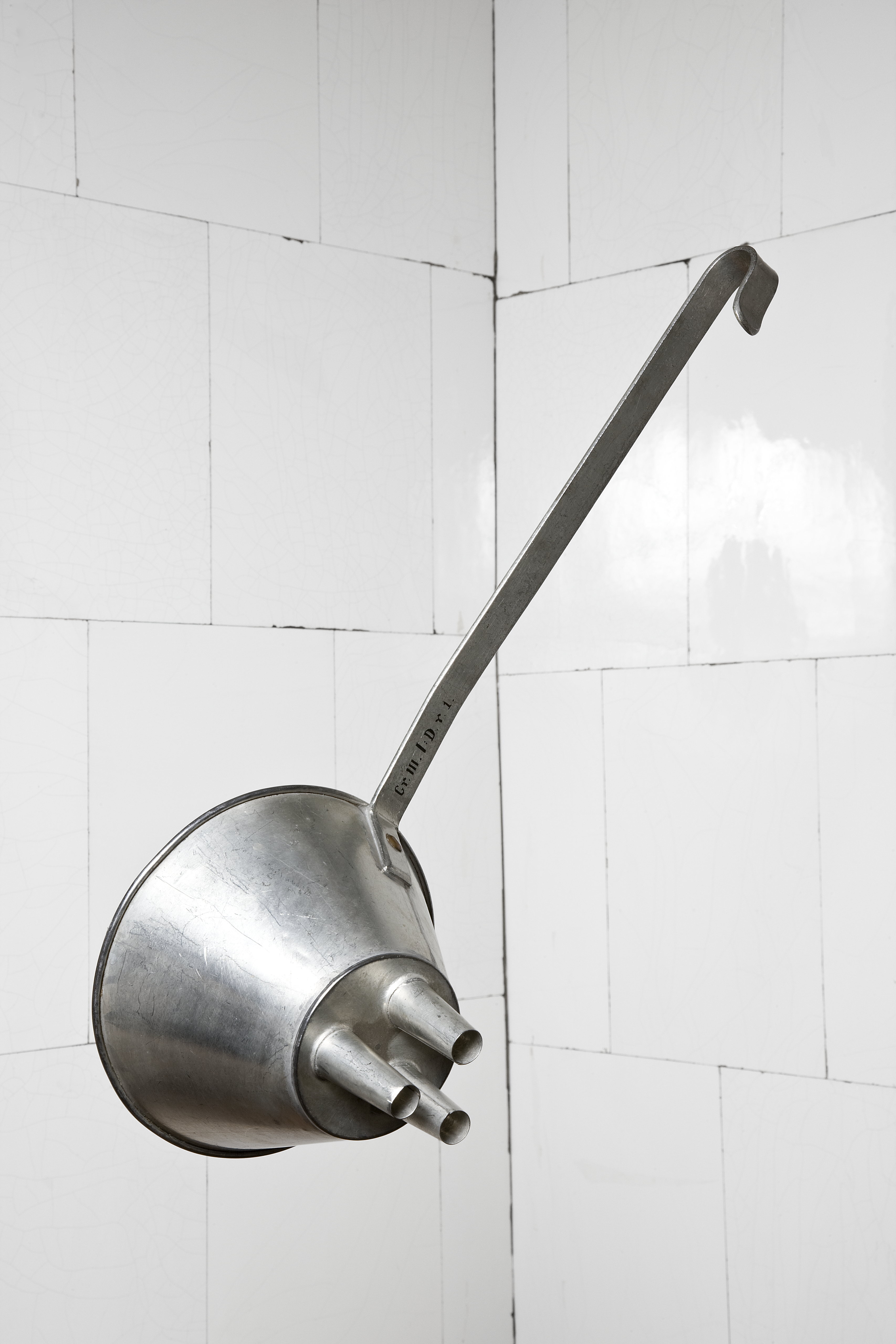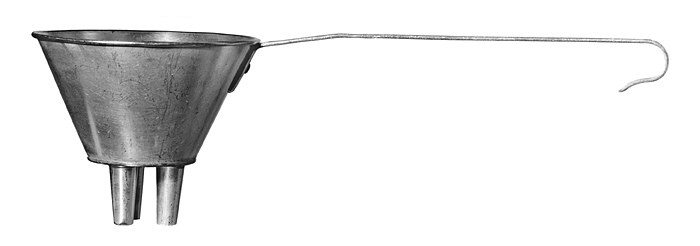 STRUVTRATT Av bleckplåt, med skaft av förtent järn. Omvänt konisk, med plan botten och tre rör; kring övre kanten en utstående stav; rör omvänt koniska samt fastlödda vid botten. Skaft långt, platt, fäst vid tratten med en kopparnit, yttre änden omböjd till en lång hake. Höjd: 14,3 cm.; diameter: 17 cm. Skaft, längd: 30,5 cm.