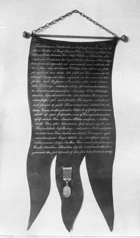 Skylt i form av tretungat banér av plåt, målat med blåsvart färg, nedhängande från metallstång med två runda, tillplattade ändknoppar, stången och knopparna målade med guldbrons(?). Vid stången fäst kedja med ovala länkar. På skyltens framsida text målad med guldfärg: Fredrikshamns och Svensksundsmedaljen gifven af Konung Gust.III till d.v. Fänriken vid Kongl. Arméens flotta och Riddaren af Svärds Orden sedermera Contre Amiralen, Herr Adolf Fredrik von Schneidau, efter slaget vid Svensksund den 9.Juli 1790, der Arméens Flotta ådaga- lade synnerlig tapperhet och mannamod, samt räddade allt hvad som i den dåvarande Kritiska tidpunkten var satt på spel, och som hade till följd att Konungen gick icke allenast obesegrad, utan segrande ur den svåra och olika striden mot Ryssarne. Monarken visste och att erkänna detta. I Sverige utdelades aldrig ett vackrare hederstecken än Svensksunds-medaljen. Arméens Flotta tilldelades dessutom följande militära utmärkelser: Konungens namchiffer på sabelfästet; blå och gula sidenskärp med fransar av guld; Hans namn med årtalet 1790 på denna Corps hattprydnader, blefvo de ojäfaktigaste minnen såväl af egne förtjenster, som af Konungens tacksamhet; Sjelf anlade Han Arméens Flottas uniform, i hvilken drägt Han, efter återvunnen fred visade sig för sin Hufvudstads befolkning; - och sedan Medborgerligheten beslutat resa Hans ärestod var det på Konungens eget anordnande, som Sergel iklädde den förträffligt utförda bilden samma drägt, i hvilken Han vunnit sin sista seger; Contre Amiralen von Schneidau dog den 2 September 1860, 92 år gammal, den siste lefvande af dem som burit förenämnda medalj.