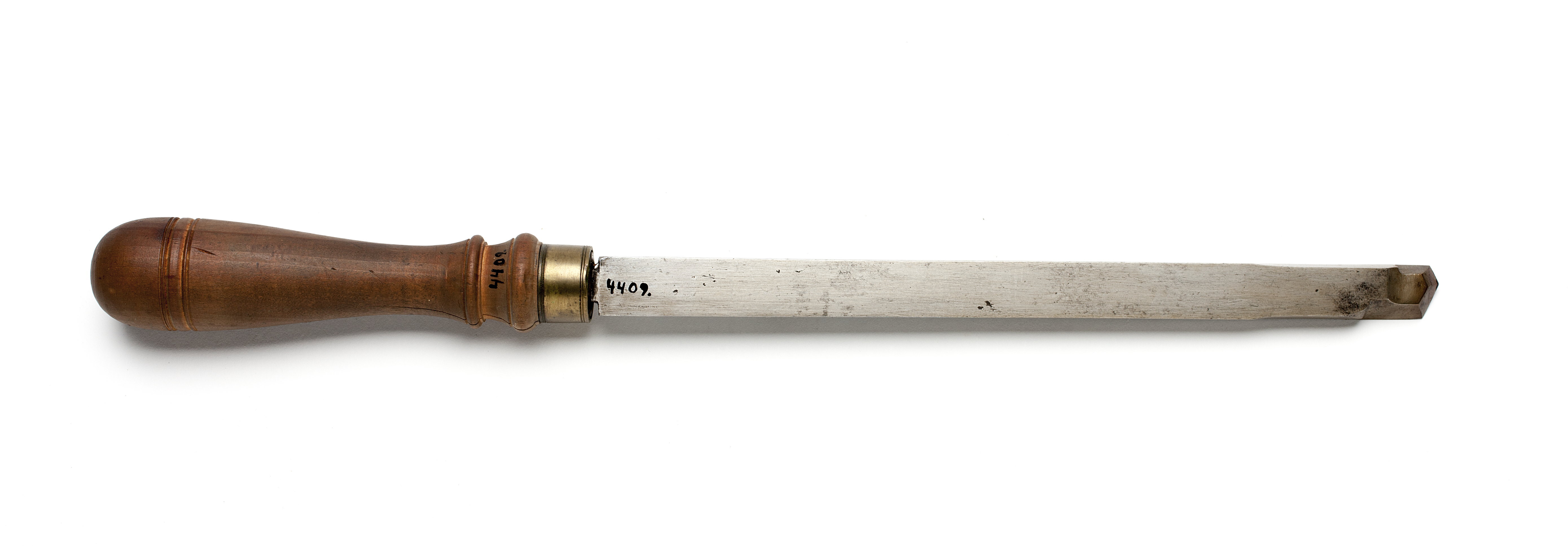 Klinga med rektangulär genomskärning. Eggen formad som trubbig vinkel med en kortare och en längre sida. Stämplat på klingan: "IK" under krona, Johan Kesemaker, Stockholm, samt "P" (proberstämpel). Svarvat skaft av päronträ, med två vulster nedtill ("rydboholmstyp"). Mässingsring. Stämplat på skaftet: "I".