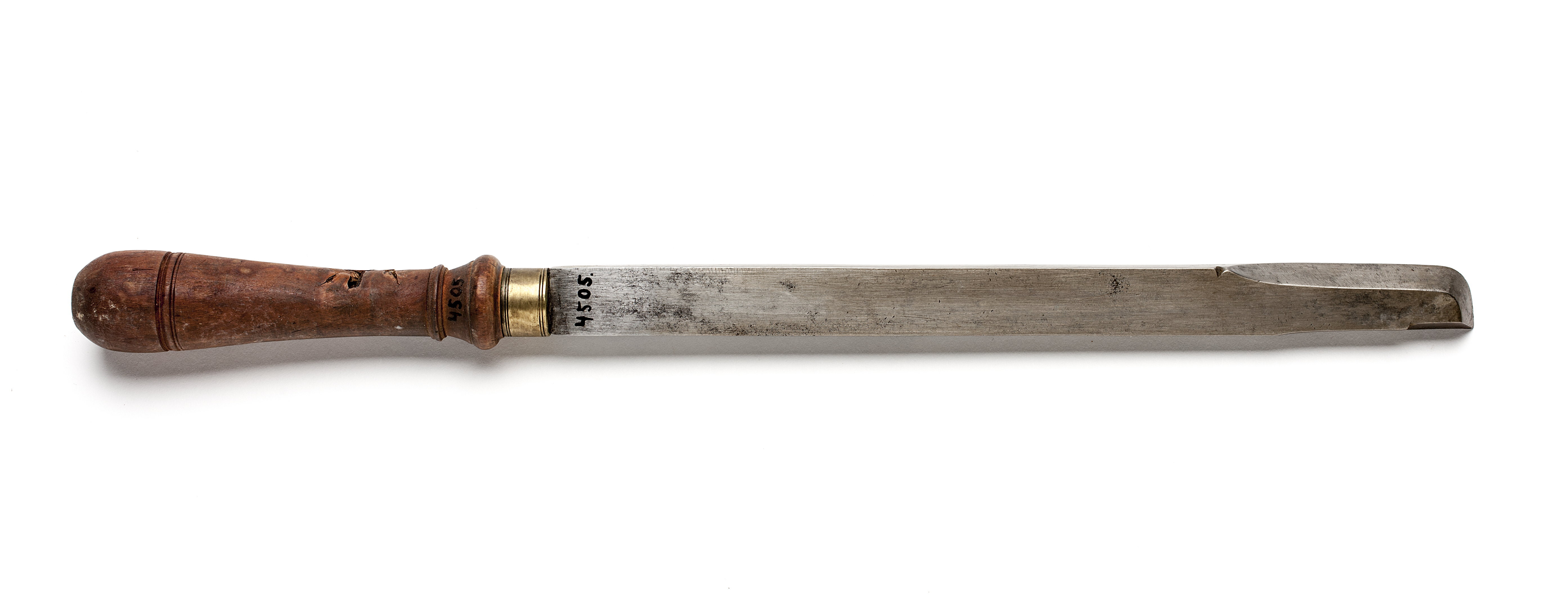 Klinga med rektangulär genomskärning. Kvartscirkelformad egg åt höger. Stämplat på klingan: "EP" och "P" (proberstämpel). Svarvat skaft av päronträ, med två vulster nedtill ("rydboholmstyp"). Mässingsring.