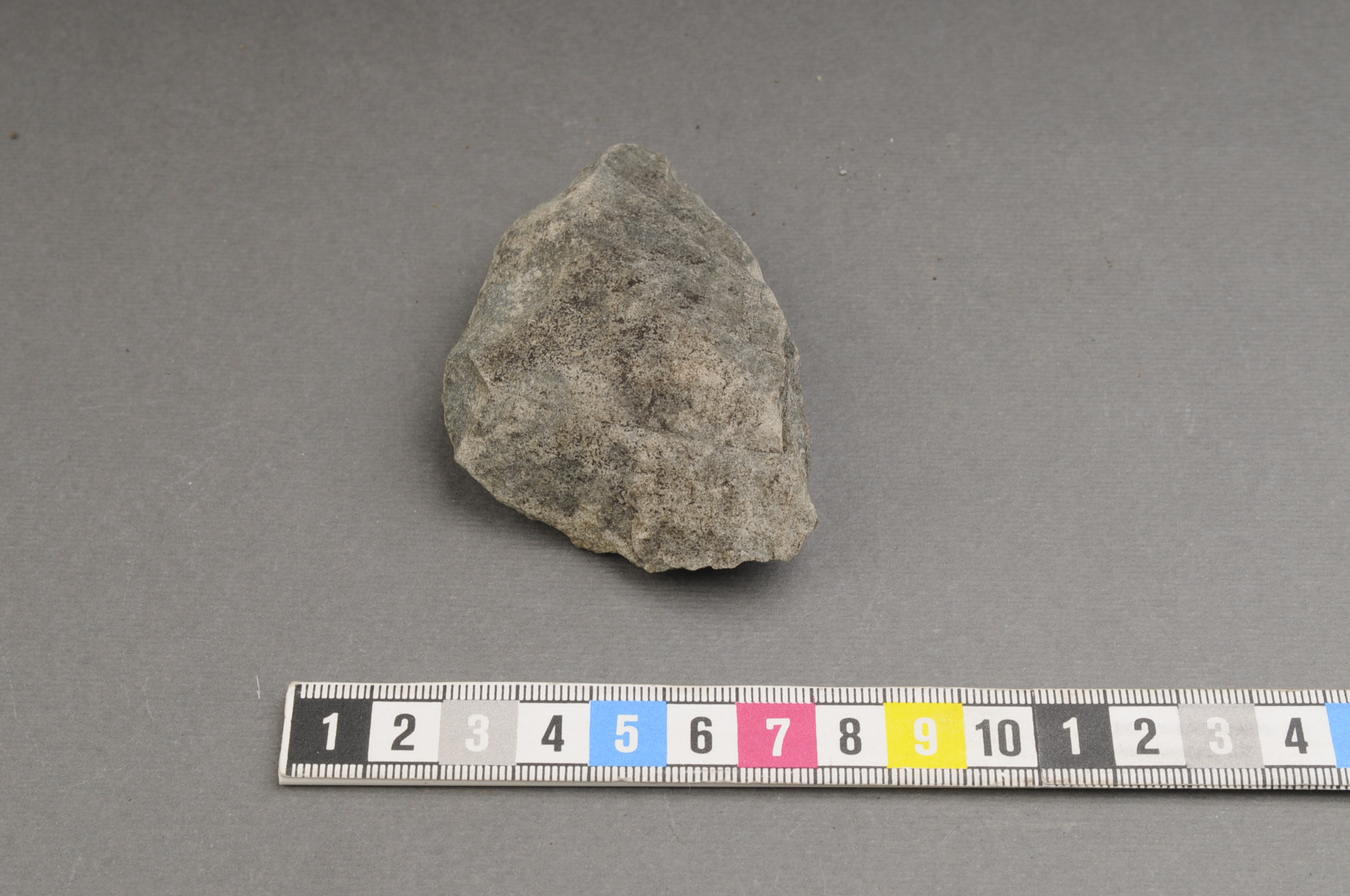 Sannolikt bultad spets. Bränt och delvis vittrat.