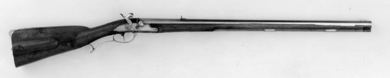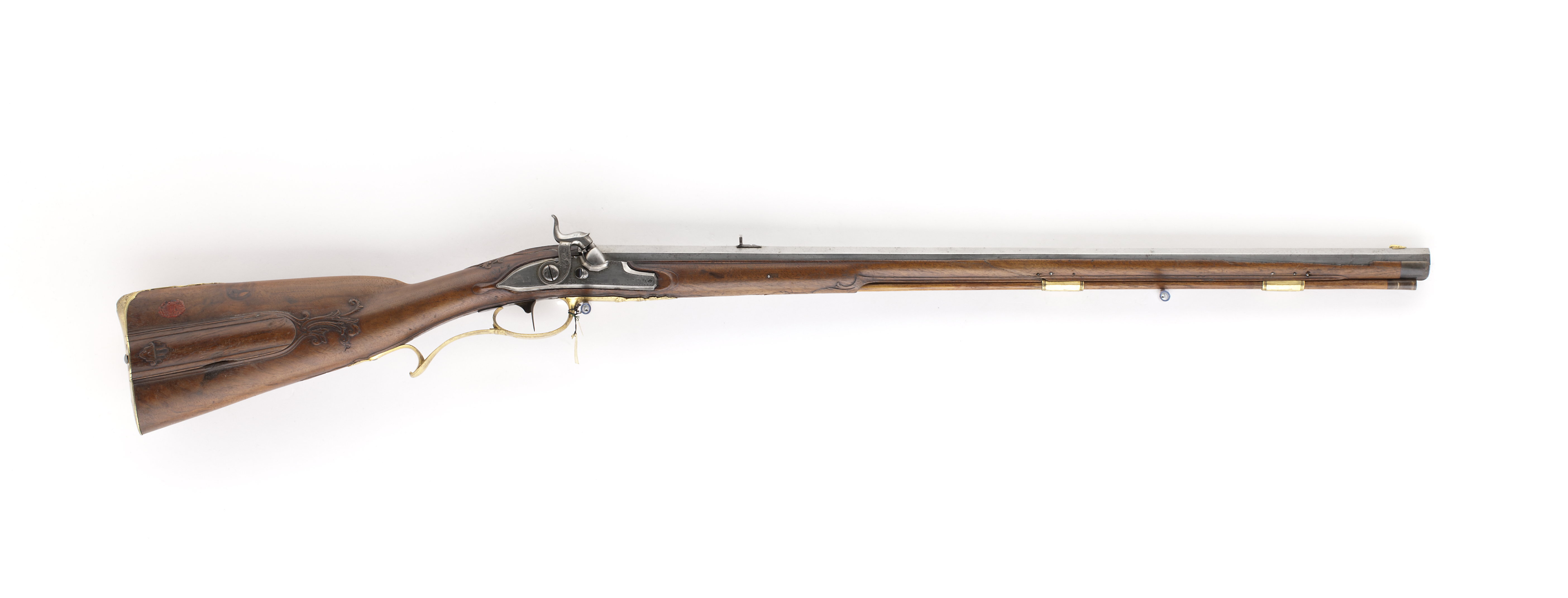 Åttsidig, åttaräfflad pipa av stål, plana bommar. Svansskruvblad med graverad dekor på spetsen mot punsad och förgylld bakgrund. På pipbasen en graverad våglinje, på kammaren inslaget med silver: " FA ". Riktmedel: Inlaxade riktmedel, ståndsikte av blånerat stål, spolformigt korn av mässing. Vid fänghålet en tändhattssnäcka. Tre häften. Pipan fäst med krysskruv samt tre pipstift av stål. Flintlås ändrat till slaglås, plant låsbleck, l: 130 mm med fasade kanter. Graverade rankor och vågband längs kanten. Nedanför fängpannan en blånerad, oval säkringsknapp. Under knappen graverat: " Stockholm ". Plan hane med graverade rankor, harmynt slaghuvud, nätskuret fingergrepp. Blånerad studel och stångarm. Fästning: Två låsskruvar. Rak, blånerad avtryckare. Brun helstock av valnöt, fransk kolv med kolvlåda och kindstöd. Snidad dekor vid kindstöd, svansskruvblad, på och vid kolvlådelocket, vid varbygel och spetsrörka. Bakplåt av förgylld mäsing, vid tån graverat: " N:o 5 ", konturerad flik på kolvryggen, rokokodekor i relief, två blånerade skruvar. På kolvlådelockets ände förgyllt mässingsbeslag. I kolvlådan ett rött lacksigill med lilla riksvapnet. På kolven ovanför kolvlådan ett sigill med " L. B. ". Förgyllt, genombrytet sidbleck av mässing. Kantig mellanrörka och överrörka av förgylld mässing. Näsband av horn. Avtryckarbleck av blånerat stål. S-formigt svängd varbygel av förgylld mässing, främre armen balusterformig, avslutad med ett flikigt blad. Fri bakre arm, omvänt c-formig bakre stolpe, ände i form av treflikigt blad. Tillbehör: Laddstock av ek, l: 685 mm, framtill hornskoning, l: 24 mm, i andra änden ett invändigt gängat mässingsbeslag, l: 125 mm.