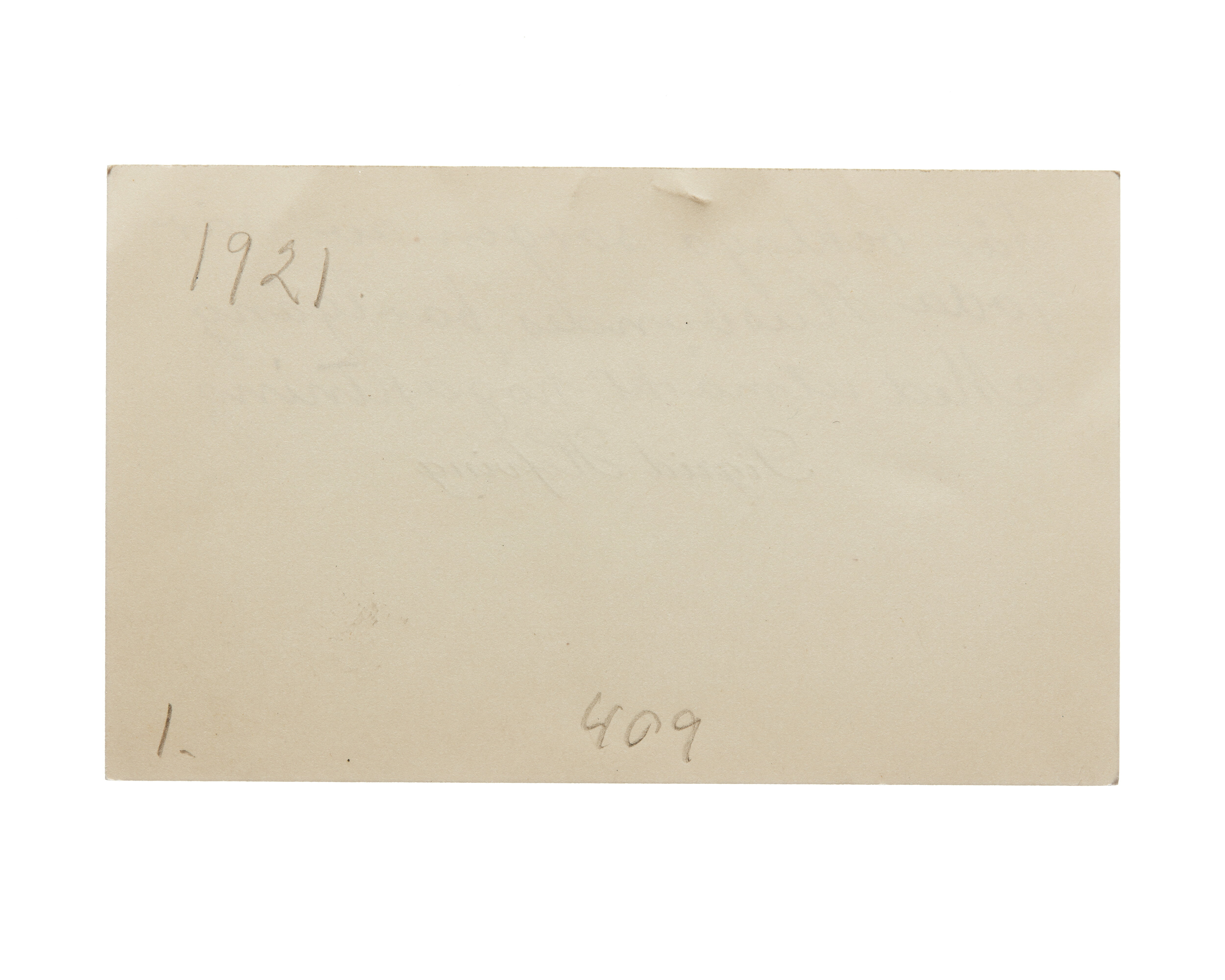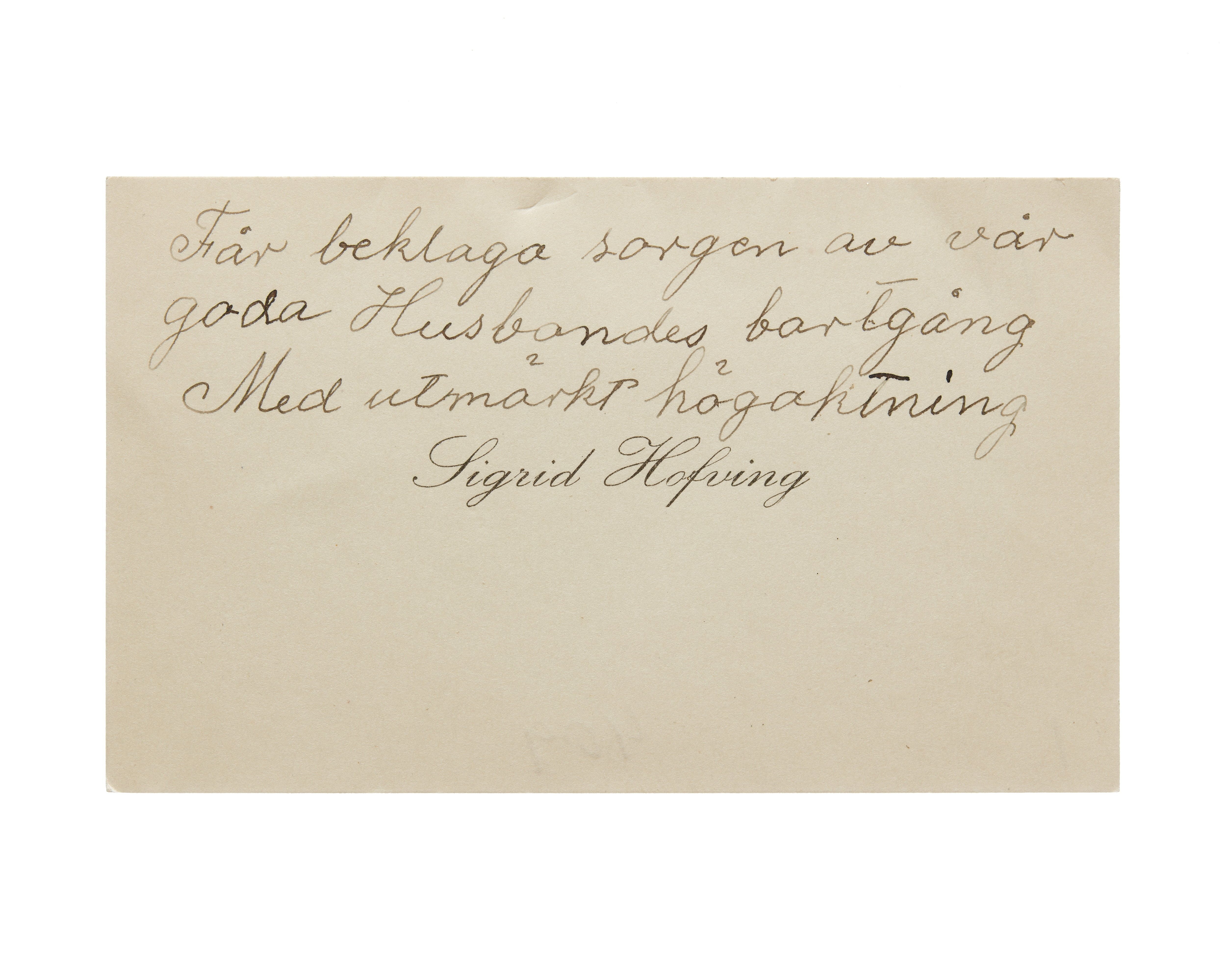 Ett visitkort från Sigrid Hofving, daterat 1921. Handskrift "Får beklaga sorgen av vår goda husbondes bortgång. Med utmärkt högaktning.".