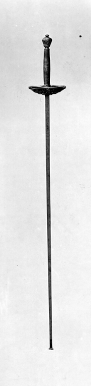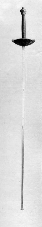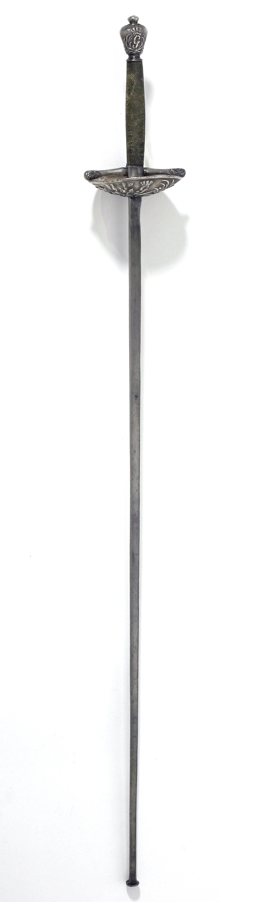 Fäste av reliefsnidat och ciselerat silver. Knapp omvänt päronformig, på ut- och insidan ett G i skrivstil under en kunglig krona, omgivet av två palmkvistar. Parerplåt rundoval, skålformig, på utsidan dekor i form av en korslagd spira och ett svärd, tre kronor, palm och lagerkvistar samt som centralt motiv ett krönt G som på knappen. (Varje ornament återfinns två gånger). Kavel lindad med segelgarn. Klinga rak med rektangulärt tvärsnitt samt på starka delens ut- och insida en 154 mm lång våglinje. Udden med en fastnitad, rund skiva, d: 12 mm.