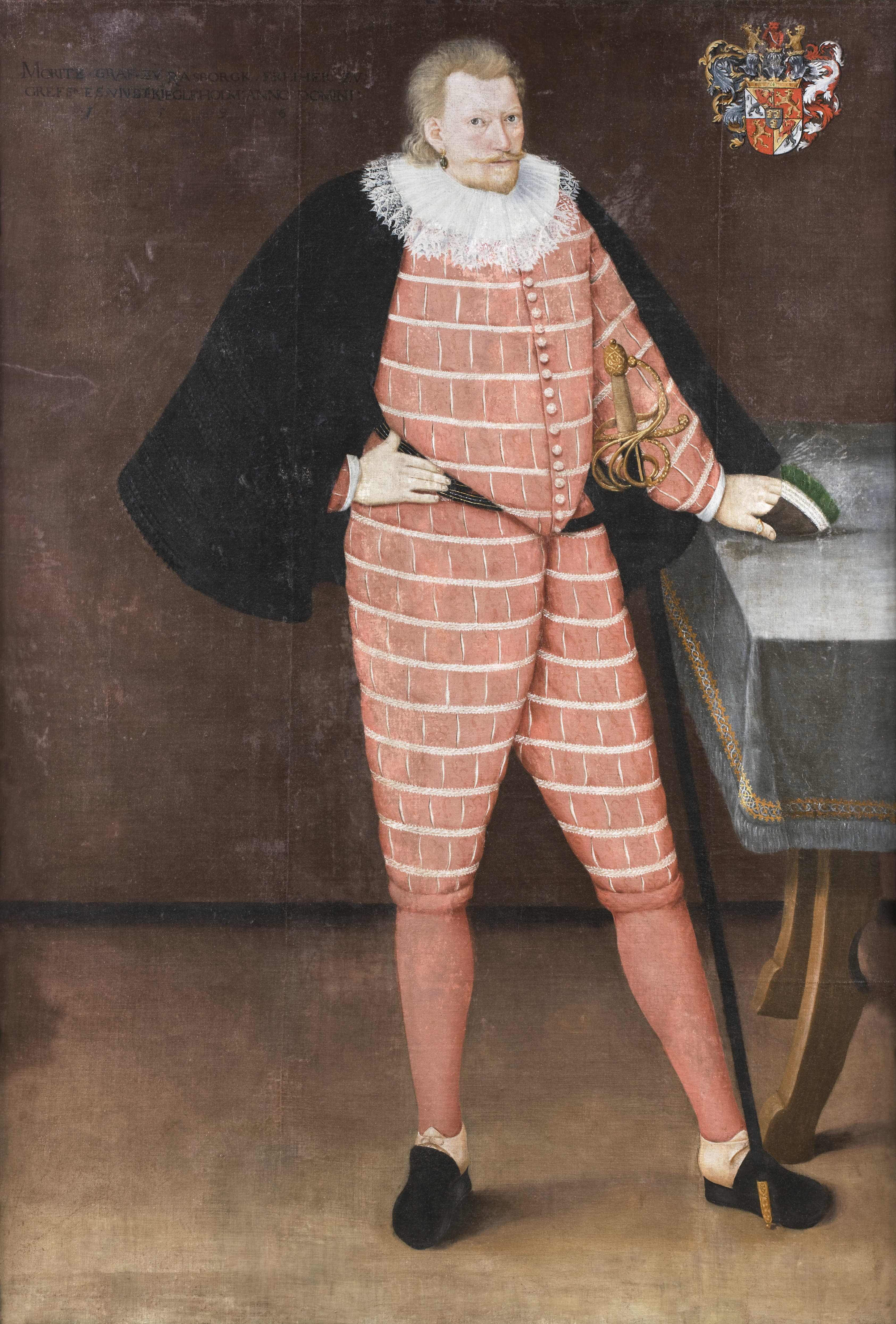 Helfigur , fas höger. Röd dräkt med spetsig jacka , horisontella , vita band och regelbundna uppskärningar mellan banden så att det vita fodret skymtar. Nedliggande , vit , spetskantad krage. Kort ,svart kappa, röda strumpor och svarta skor med vita fotlappar. Smalt , svart midjehäng , lång ryttarvärja med förgyllt korgfäste , svart balja med förgylld doppsko. Handskar i vänstra handen , som vilar på bord med grå duk. Brun bakgrund , upptill till höger grevliga lewenhauptska vapnet. Till vänster inskrift : " MORITZ : GRAF : RASBORGK : FREIHER ZV GREFSNES : VNDT : KIEGLEHOLM : ANNO DOMINO 1596 ". Stiftad spännram. Profilerad ram med grönoxiderade , bronserade lister. Ramlistens 32 mm.