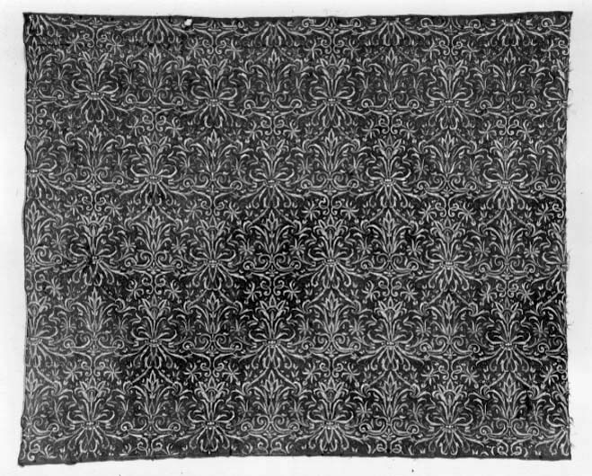 - do. do. do. (Gardiner af rödt damast, på båda sidor broderade i guld och silfver med löfverk och rosor, kantade på trenne sidor med smala silfver- och guldfransar. Söndrig.)
