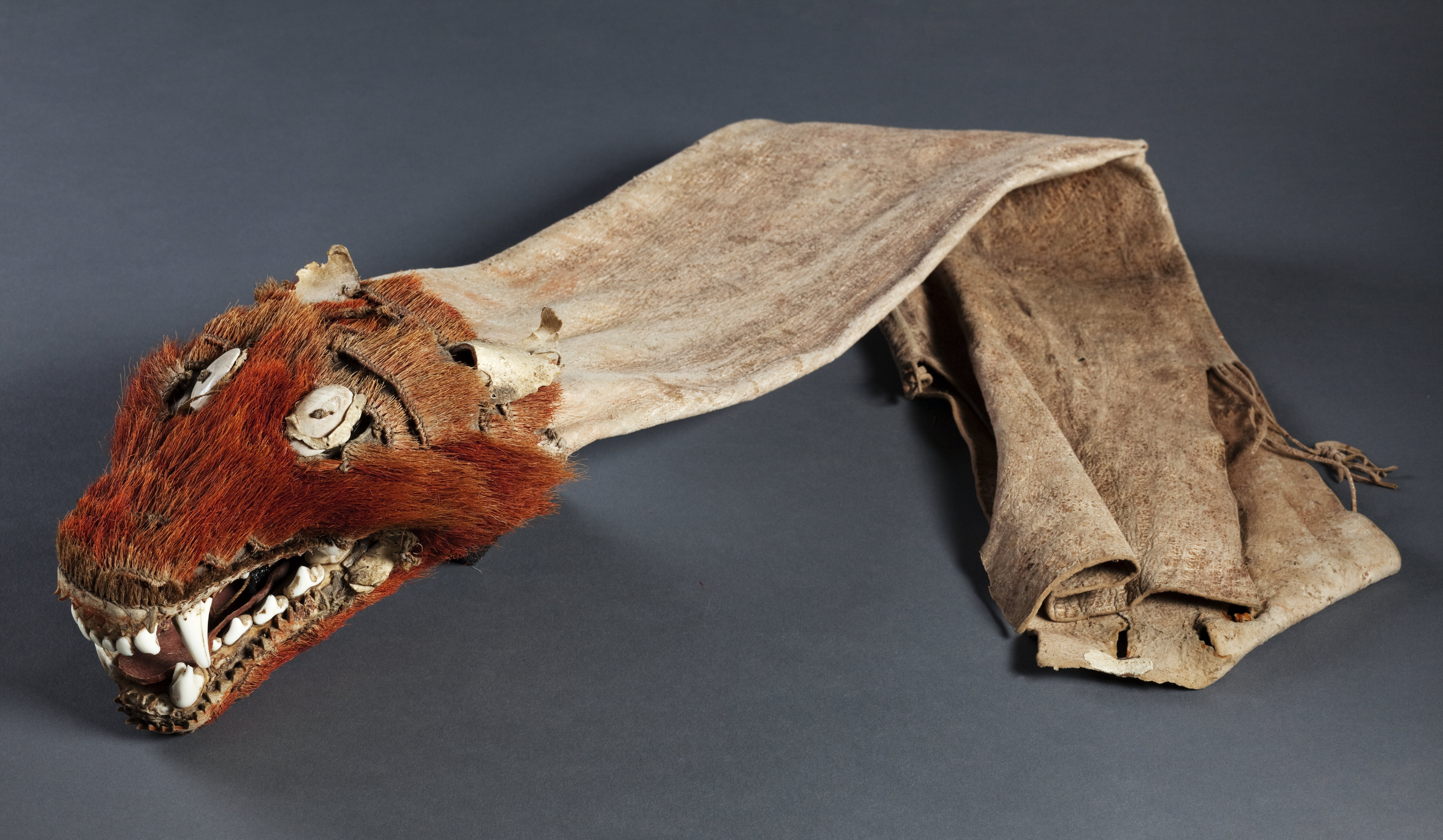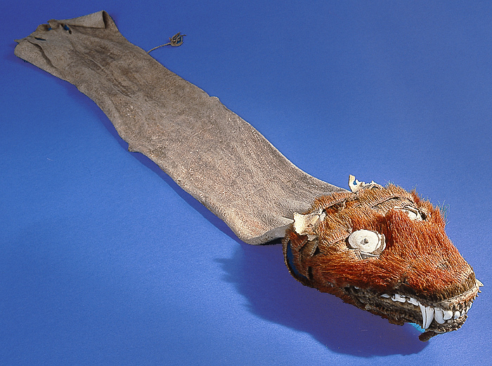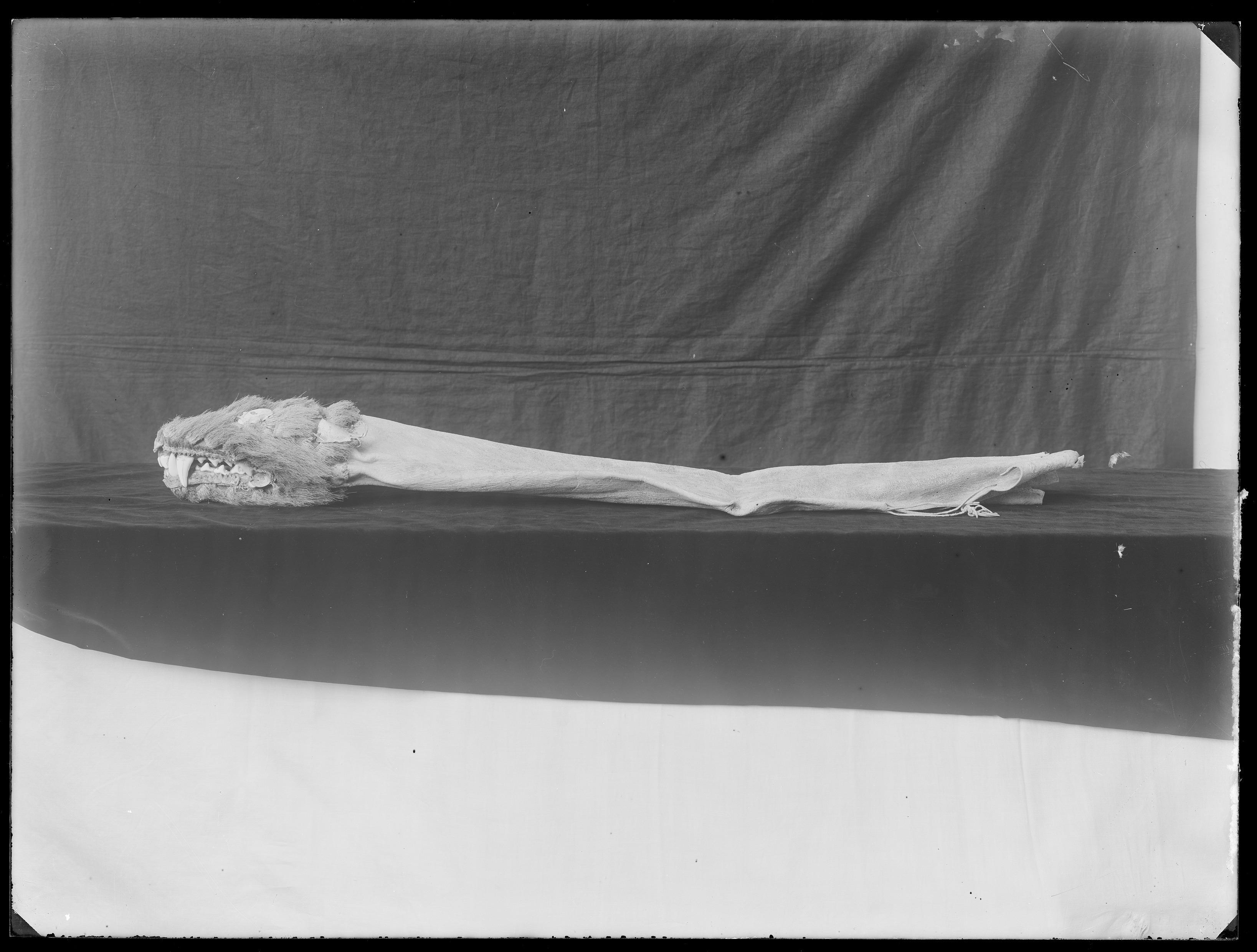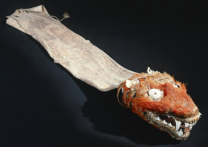 Koger från kolonin New Sweden. Möjligen en gåva från guvenören Johan Printz (1642-1653) till Carl Gustaf Wrangel eller Per Brahe d.y. Kogret kommer sannolikt från Susquehannock-stammen. Vargkranium ( canis lupus lyacon ) fäst vid en, längs ena sidan hopsydd, skinnpung, ursprungligen rödfärgad. Denna är öppen vid kortändan. Kraniet är klätt med rödfärgat hjorthår och har ögon av vita snäckskal. Öron och tunga av skinnlappar.