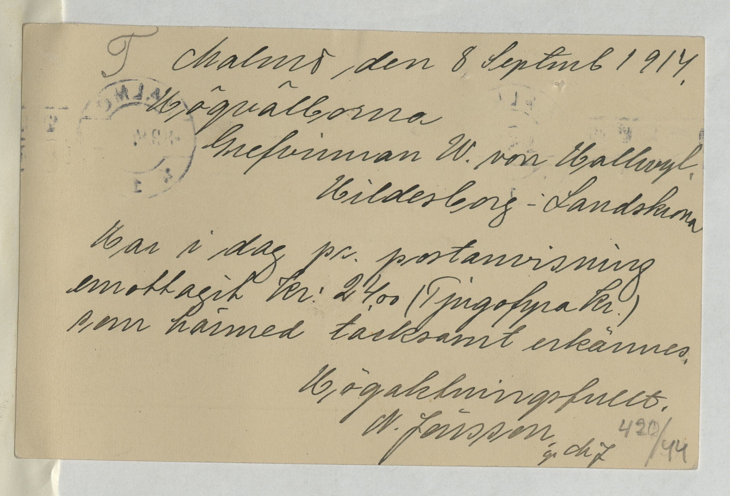 Kvitto från N. Jönsson, Skoetablissement. Malmö, 1914.