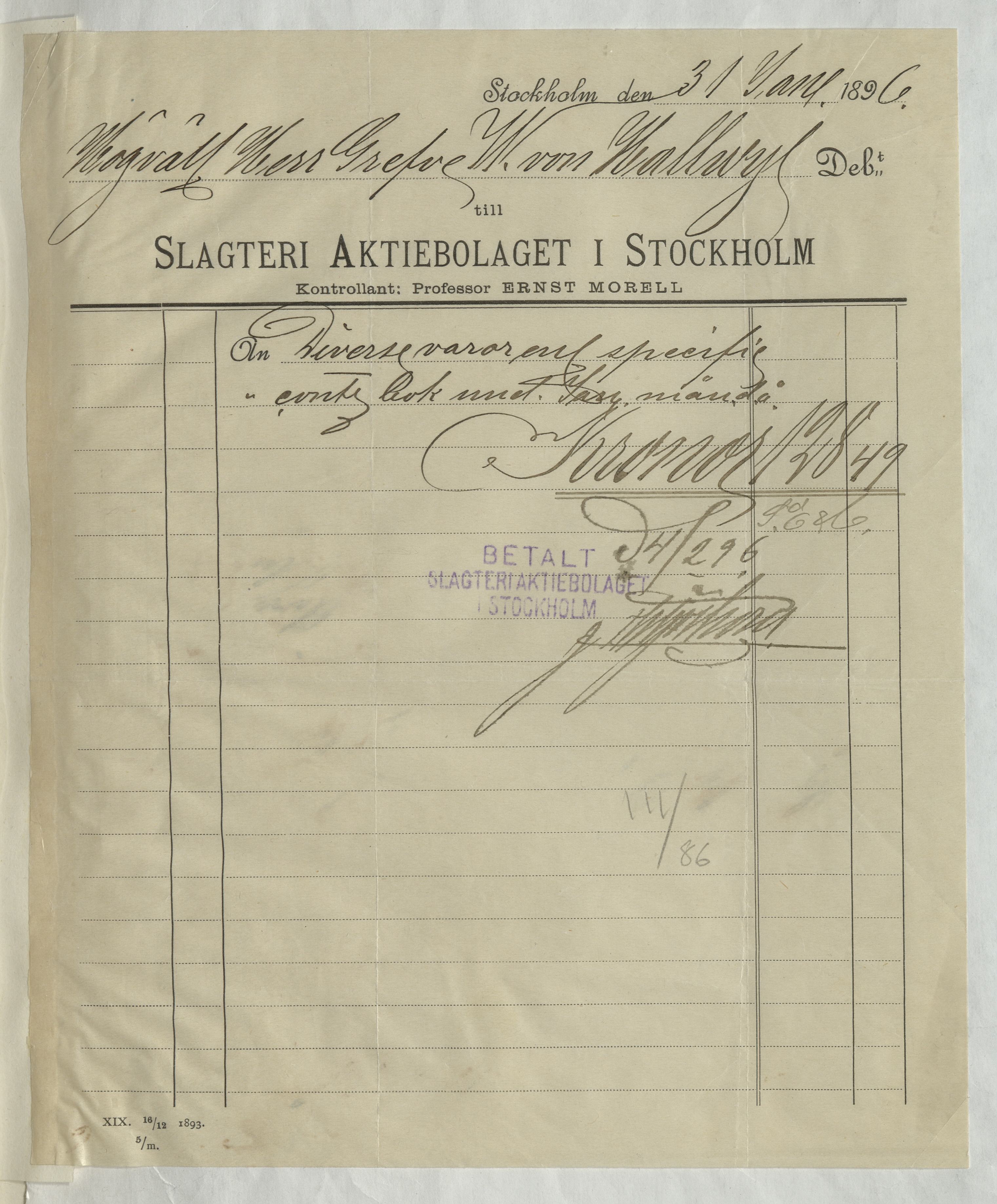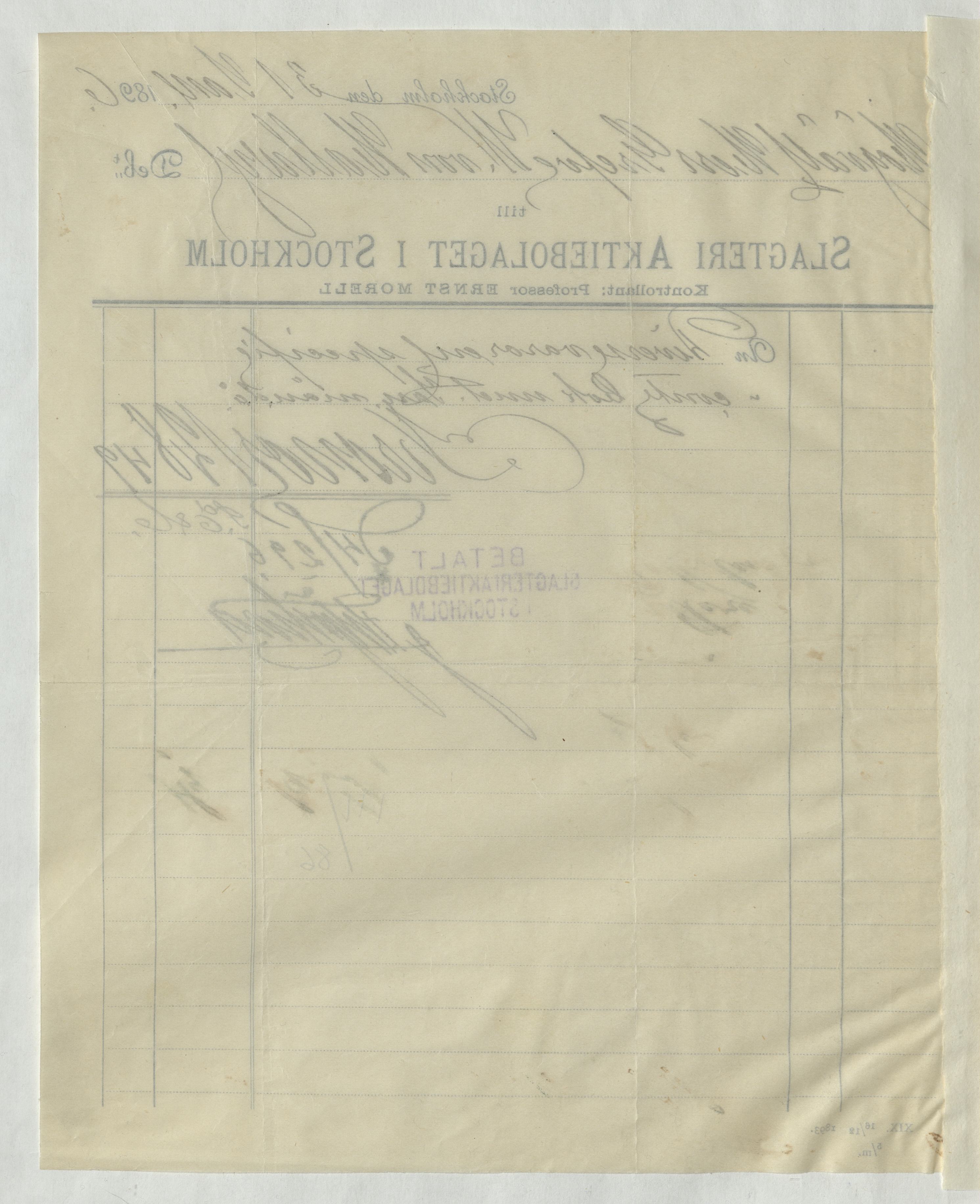 Kvitto från Slagteri Aktiebolaget i Stockholm