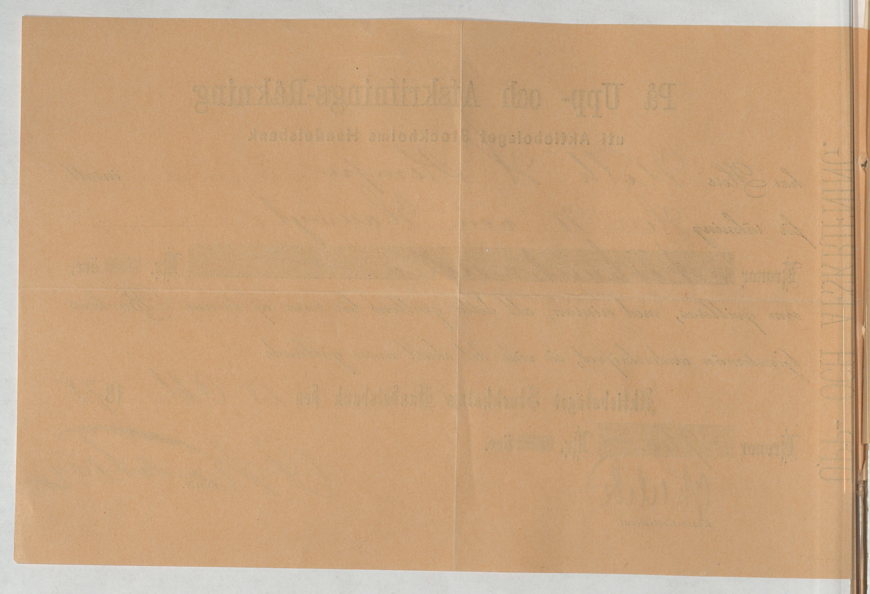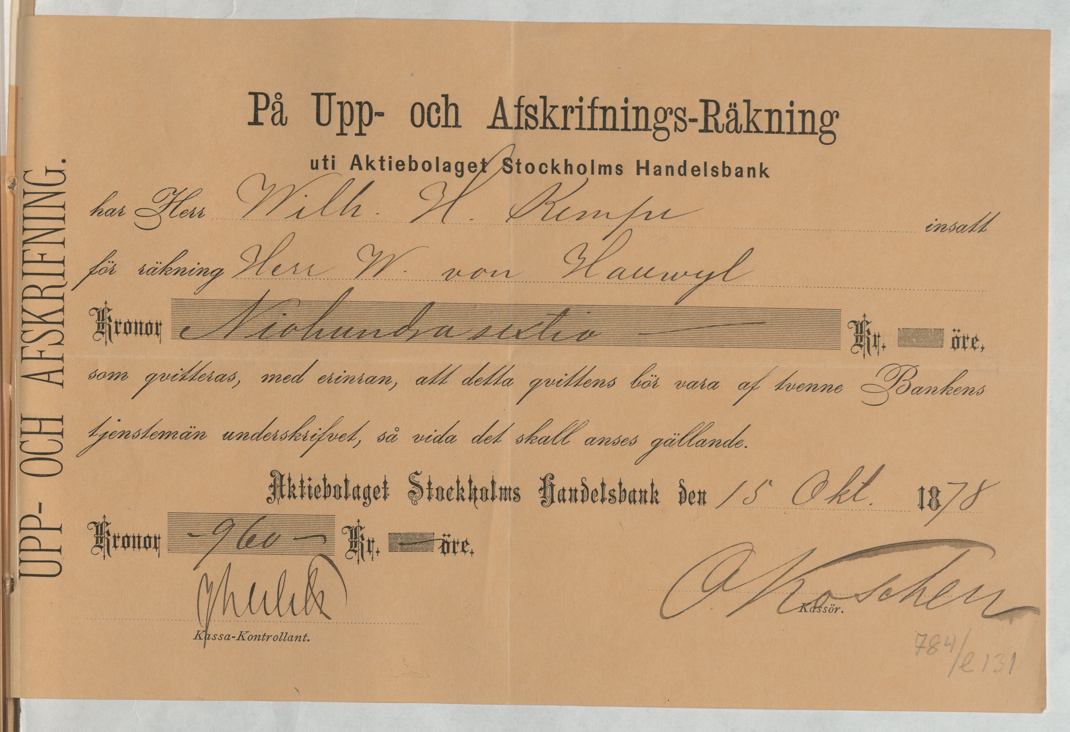 Kvitto från Aktiebolaget Stockholms Handelsbank rörande Upp- och Afskrifnings-Räkning