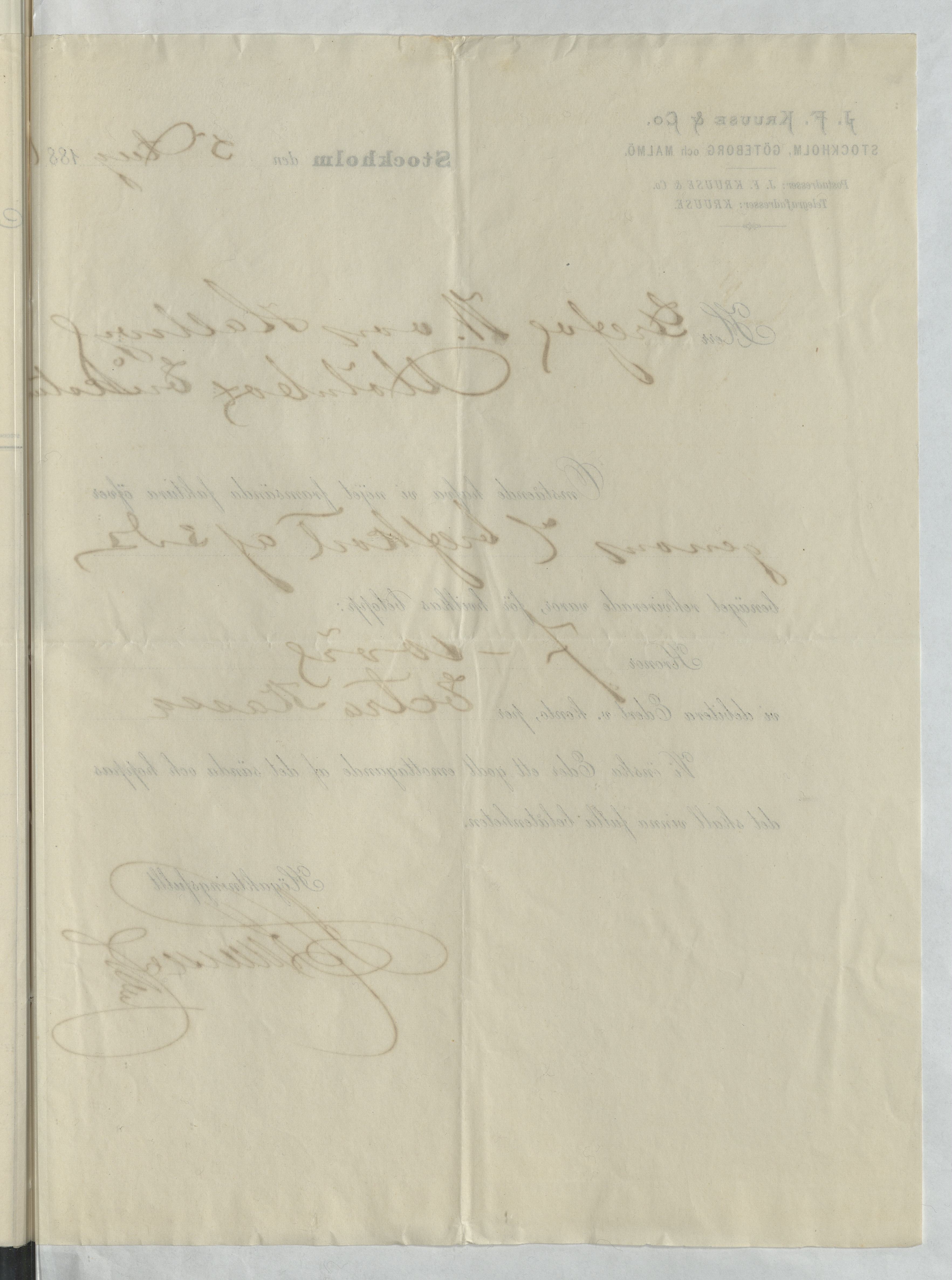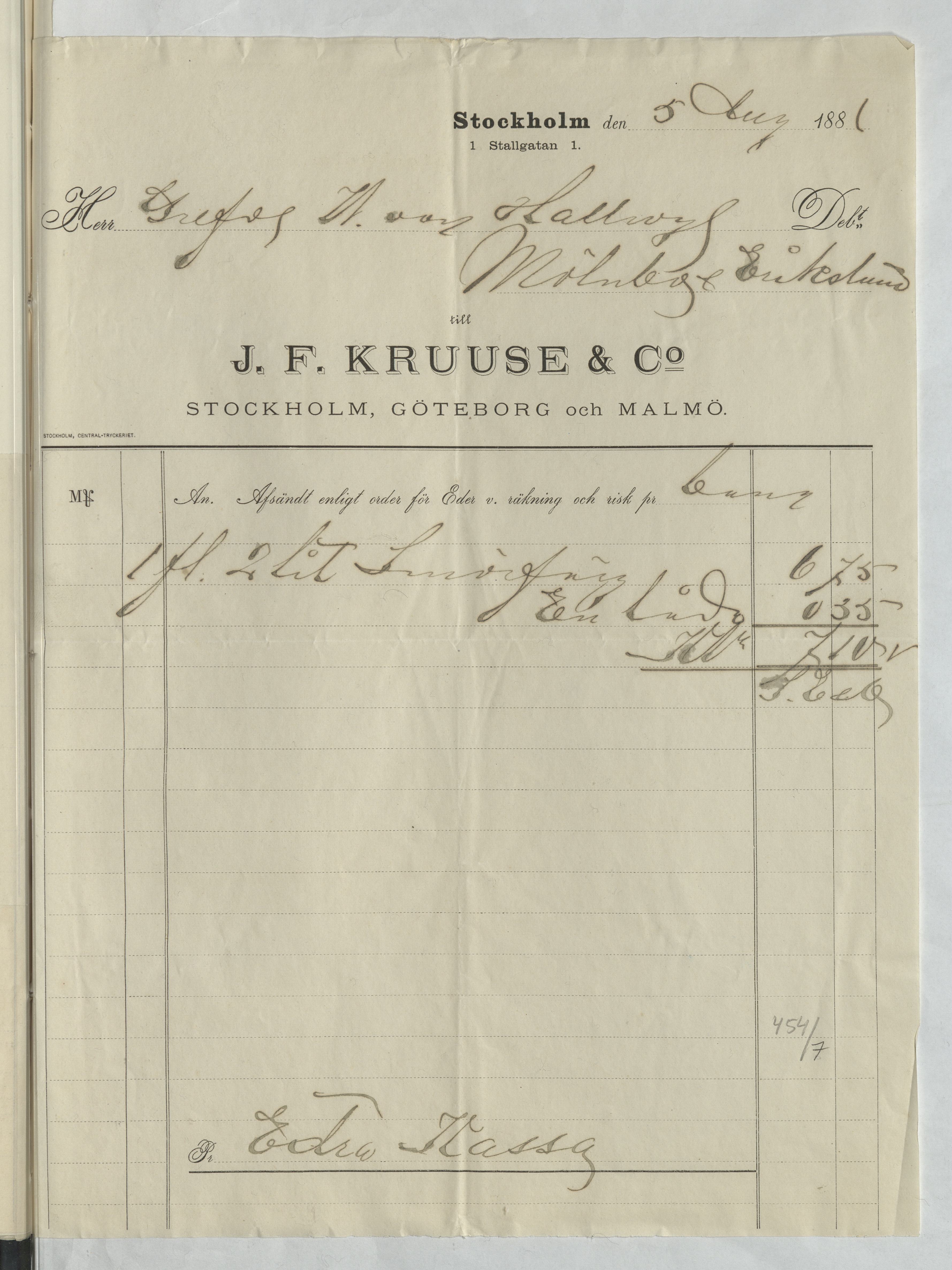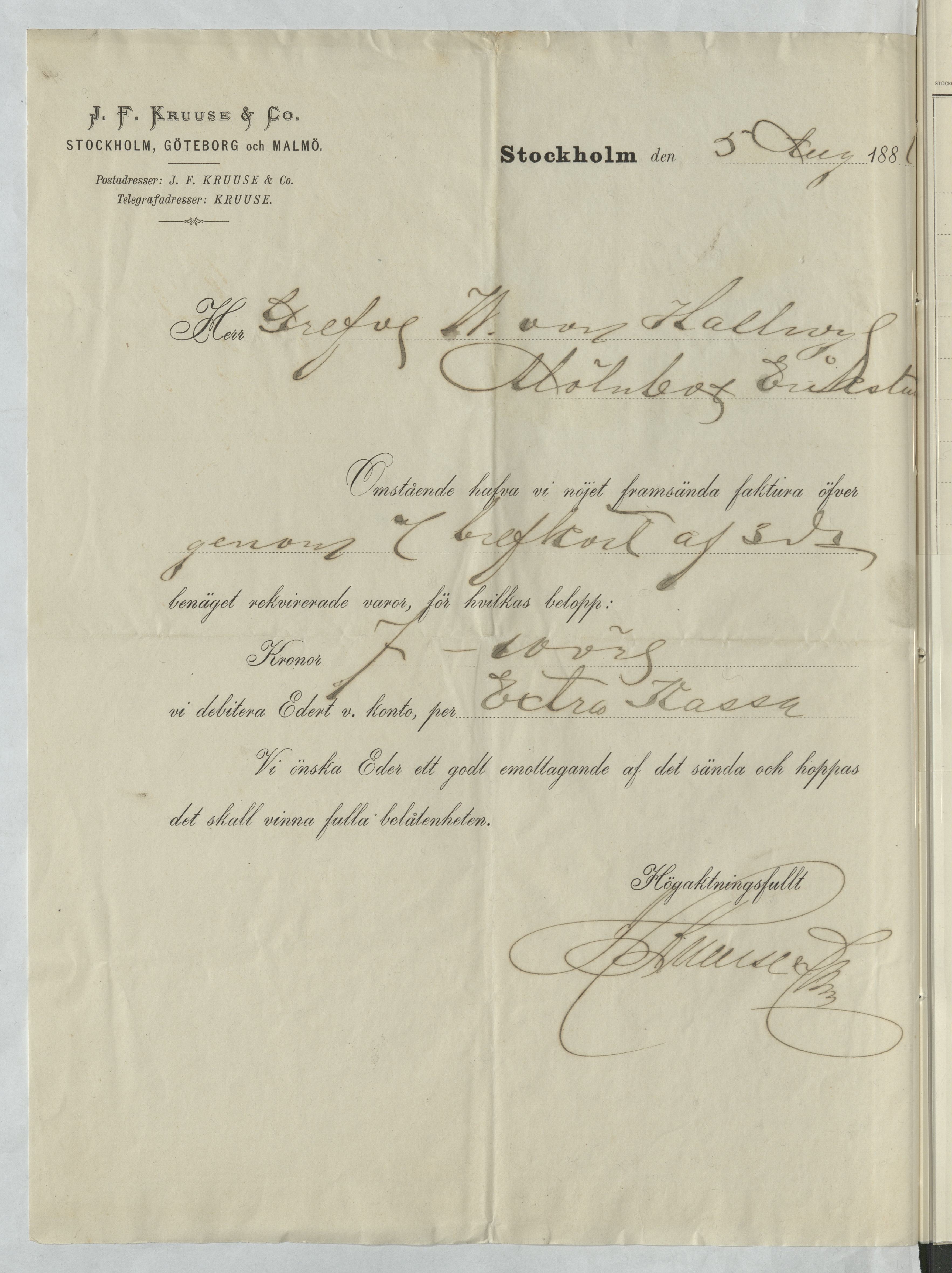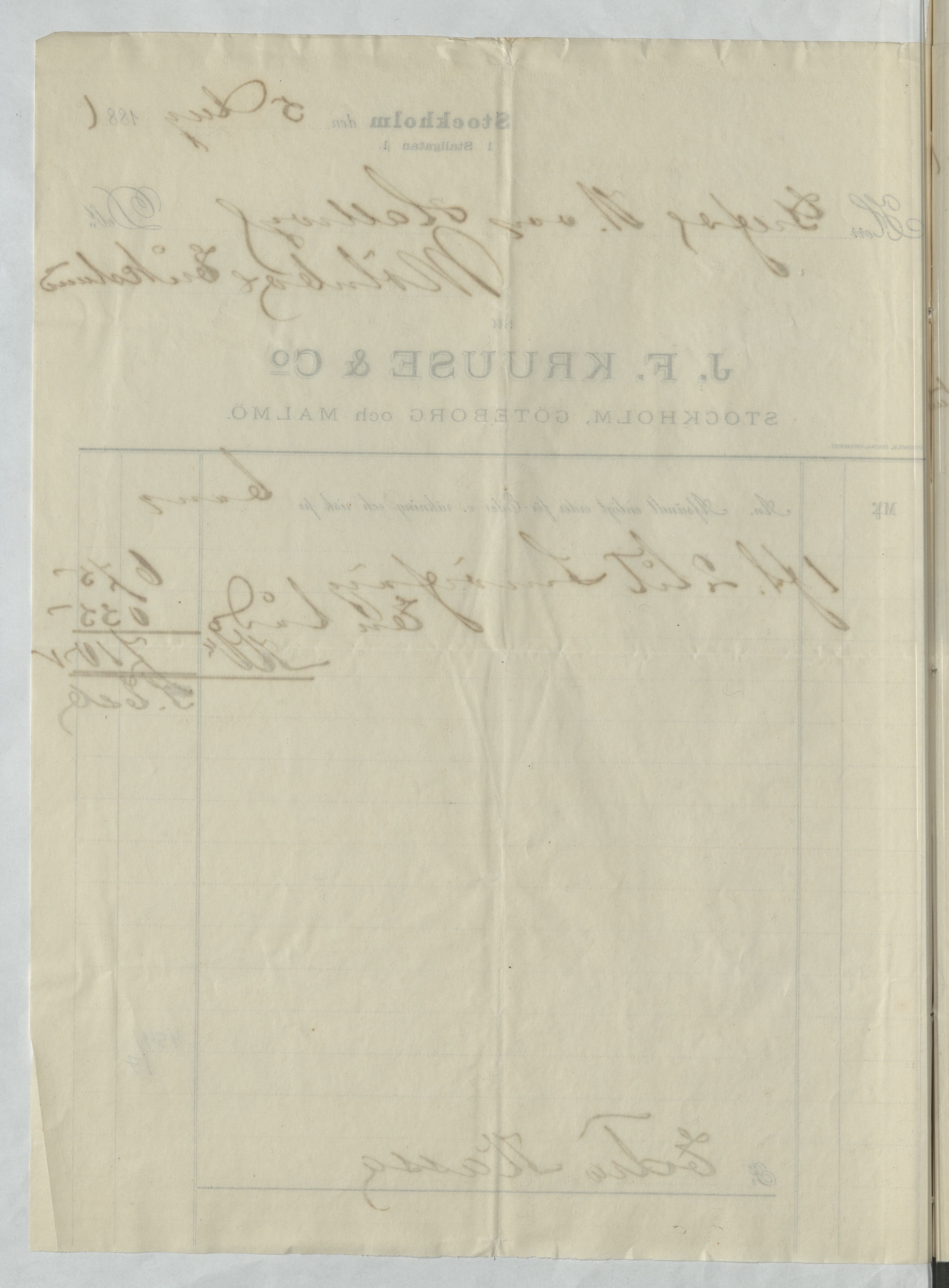 Kvitto från J. F. Kruuse & Co. Stockholm, 1881.