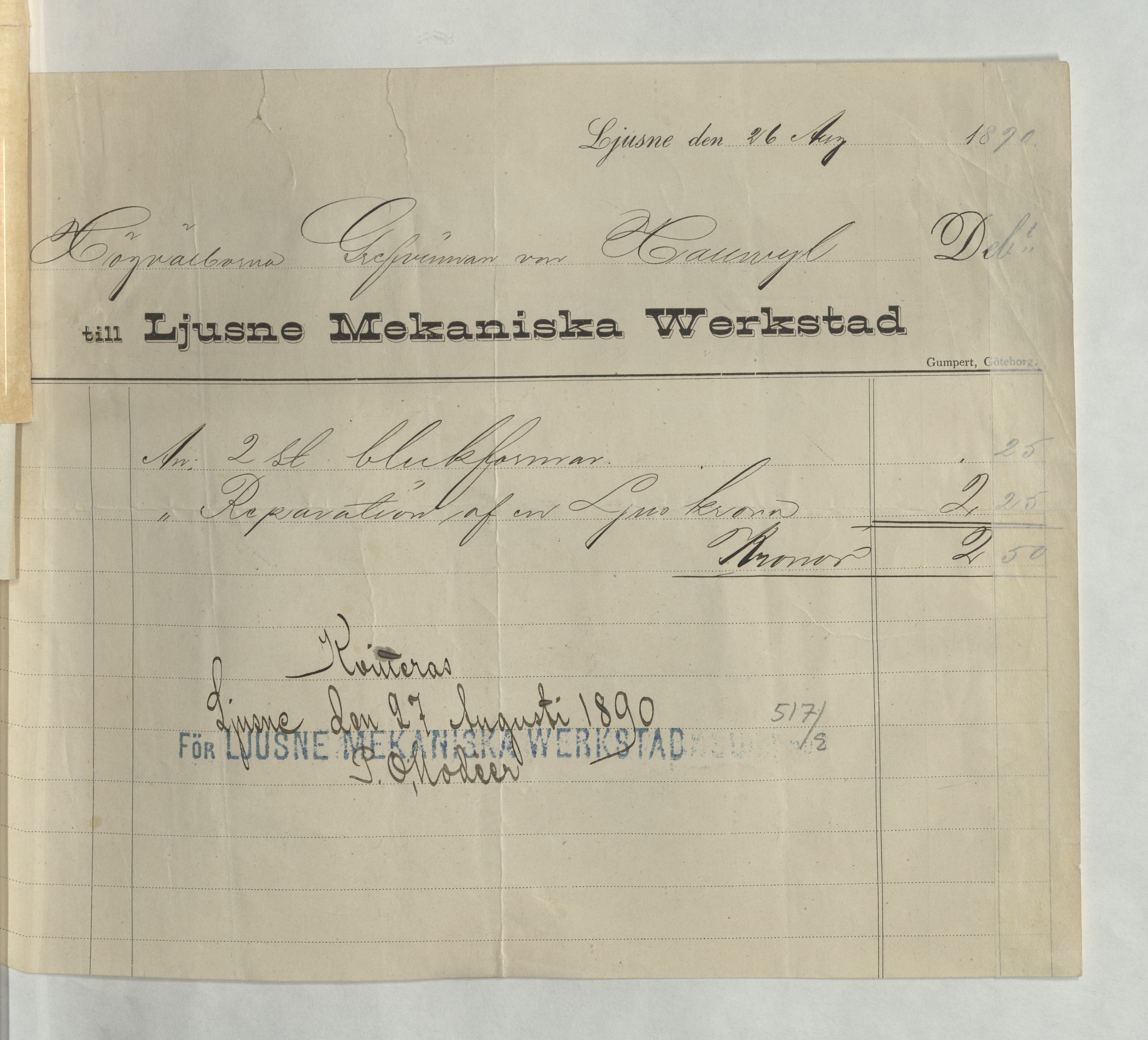 Kvitto från Ljusne Mekaniska Werkstad, 2:50krm 27 augusti 1890.
