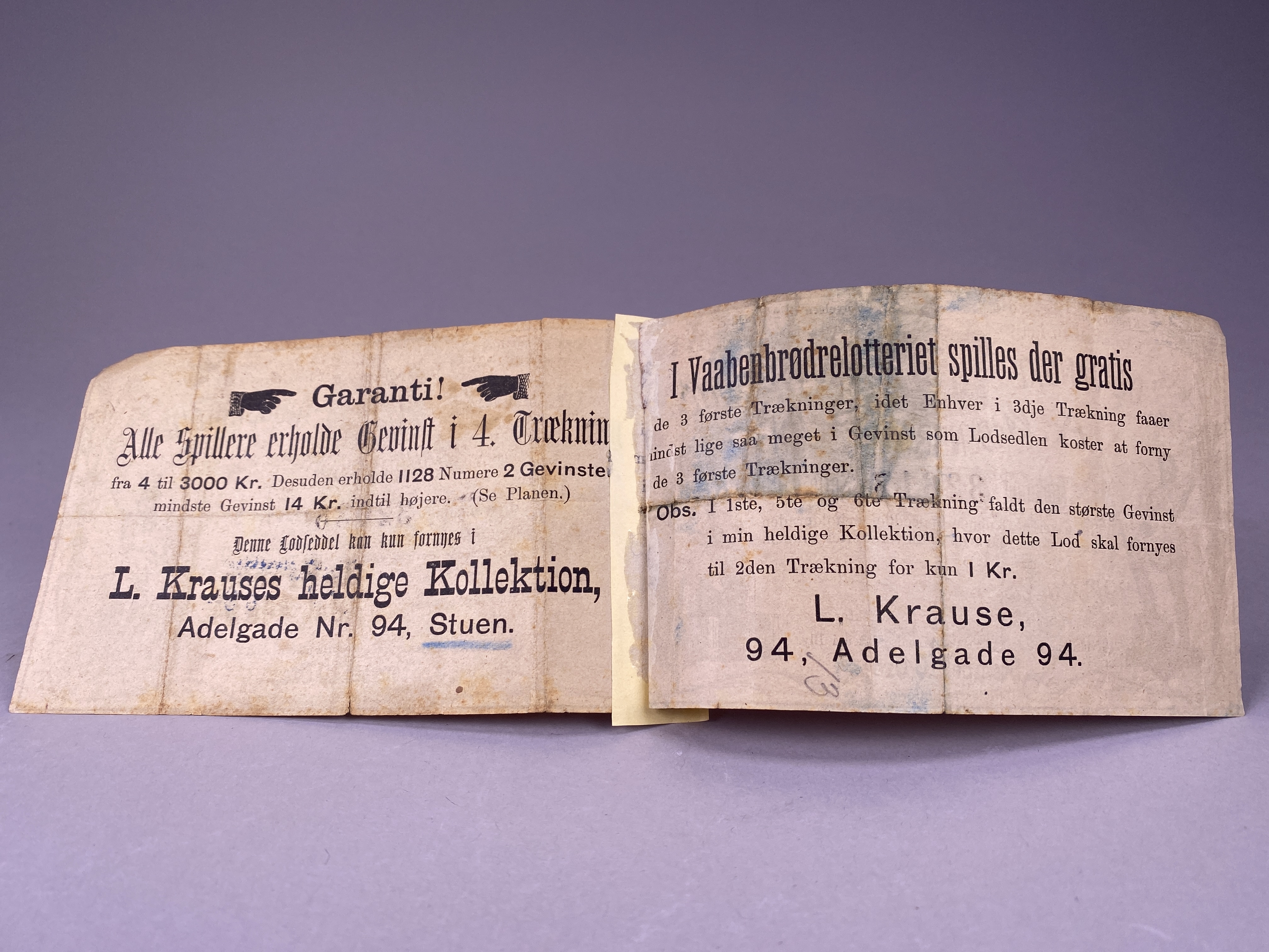 "De Danske Industrilotteri Vaabenbrødres" Köpenhamn, lott no 32035. 3:e dragningen äger rum den 13 juni 1884. Svart text tryckt på orange bakgrund, även en stämpel med lottkollektörs namn och adress. Kraftigt bruks- och åldersslitage, skador längst kanterna. Obs. sammanlimmad med lott 3126402.