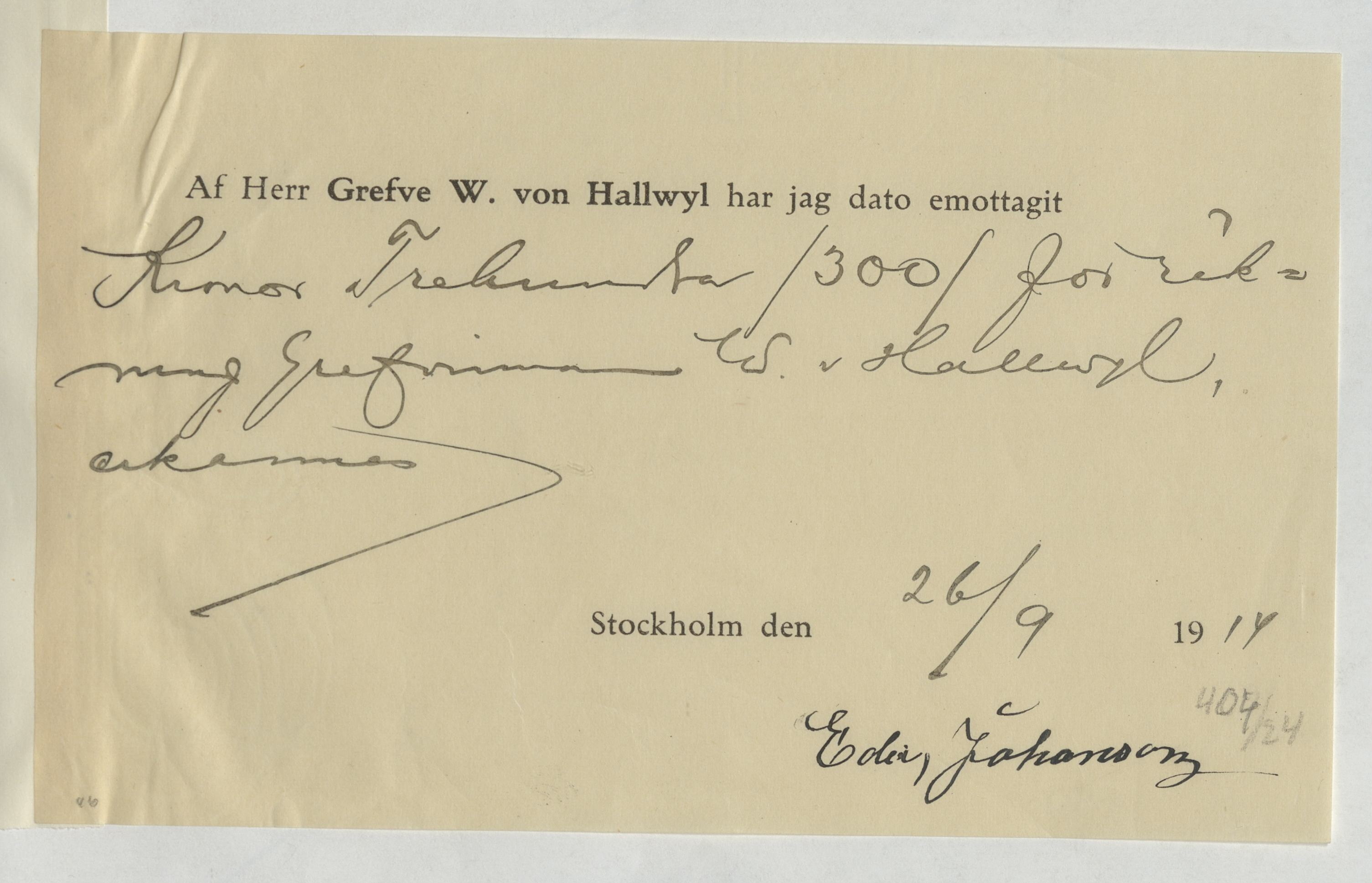 Kvitto från Edv. Johanson, Snickare. Gällande betalning för utfört arbete.