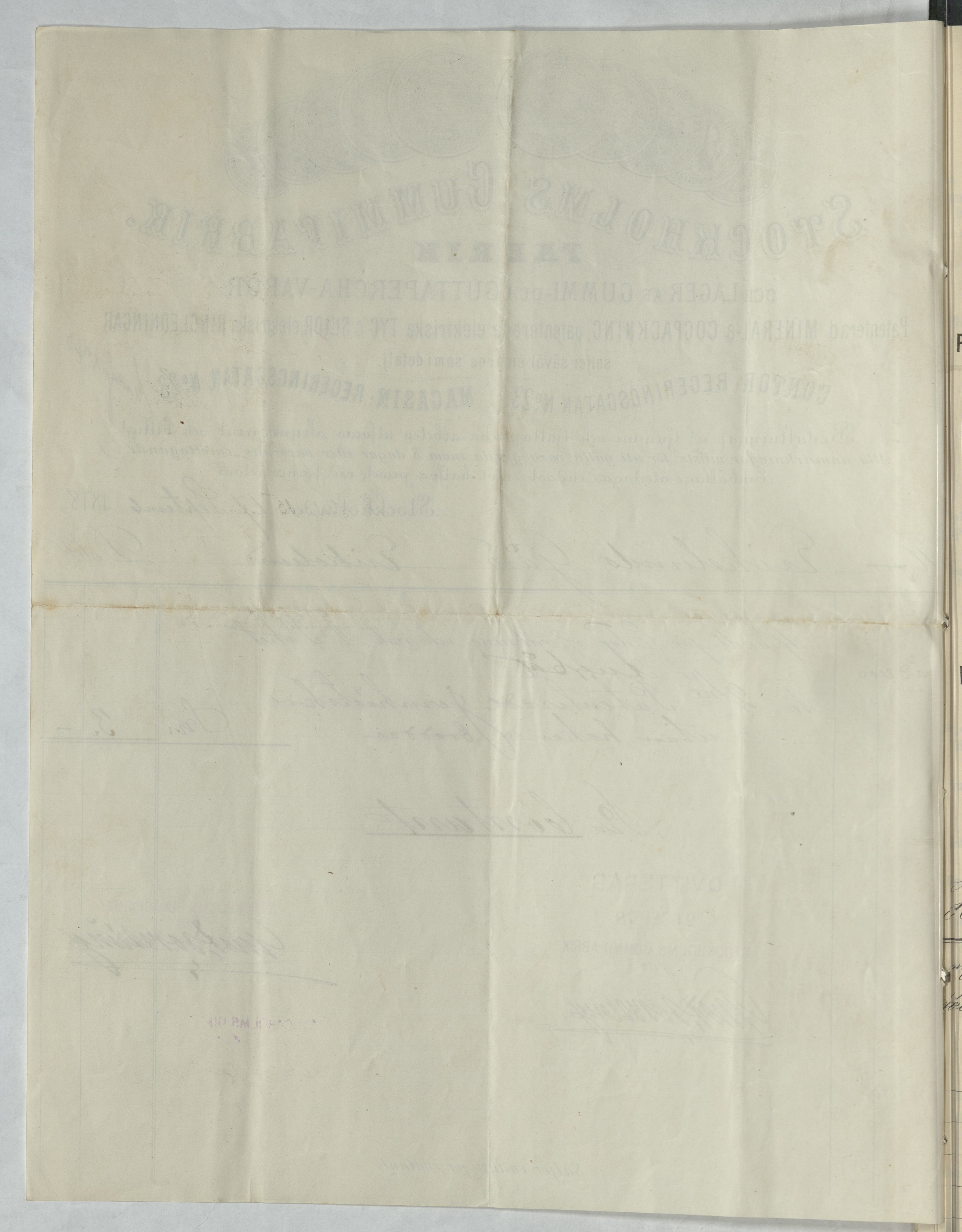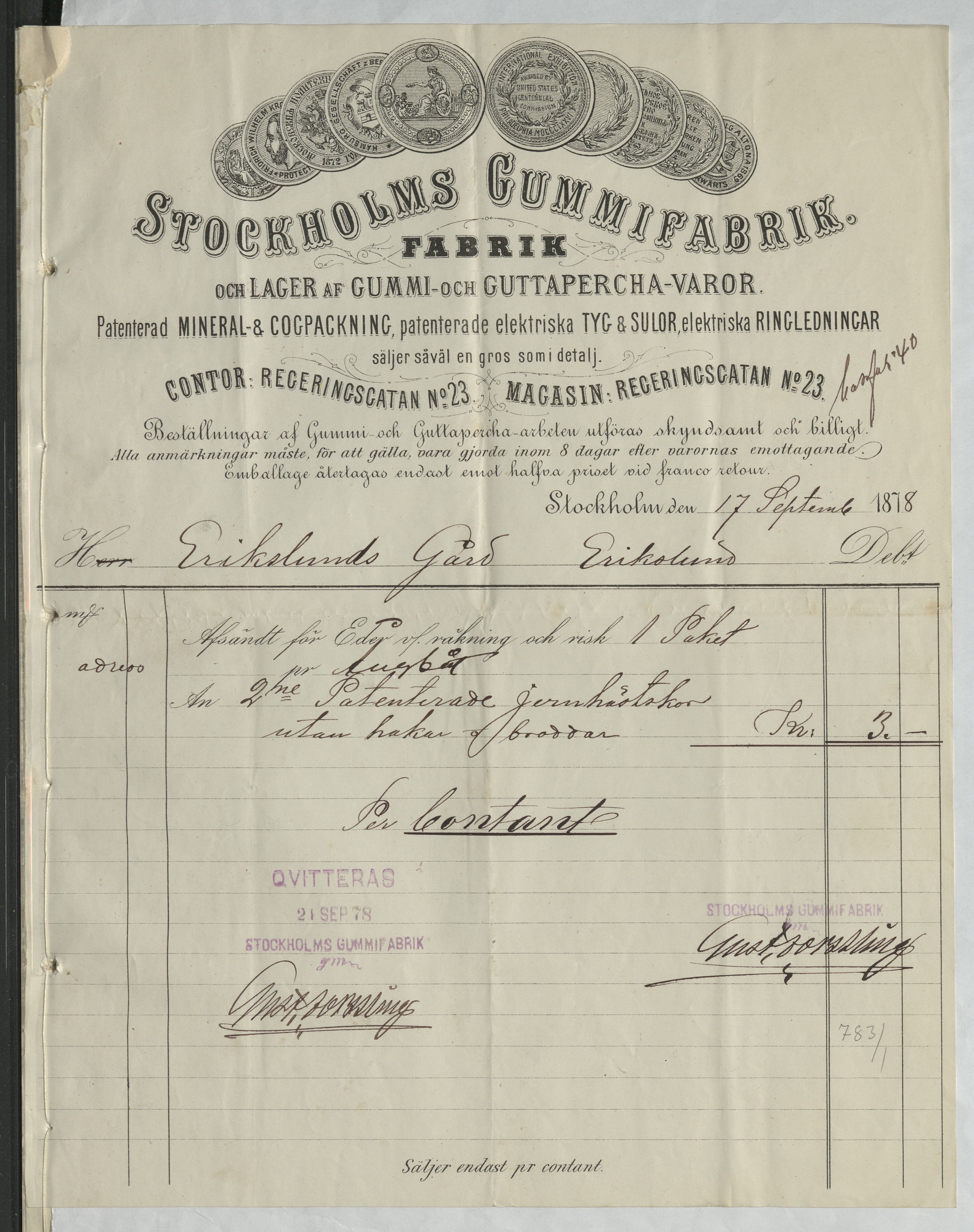 Kvitto från Stockholms Gummifabrik. Gällande inköp och frakt av hästskor. Stockholm, 1878.