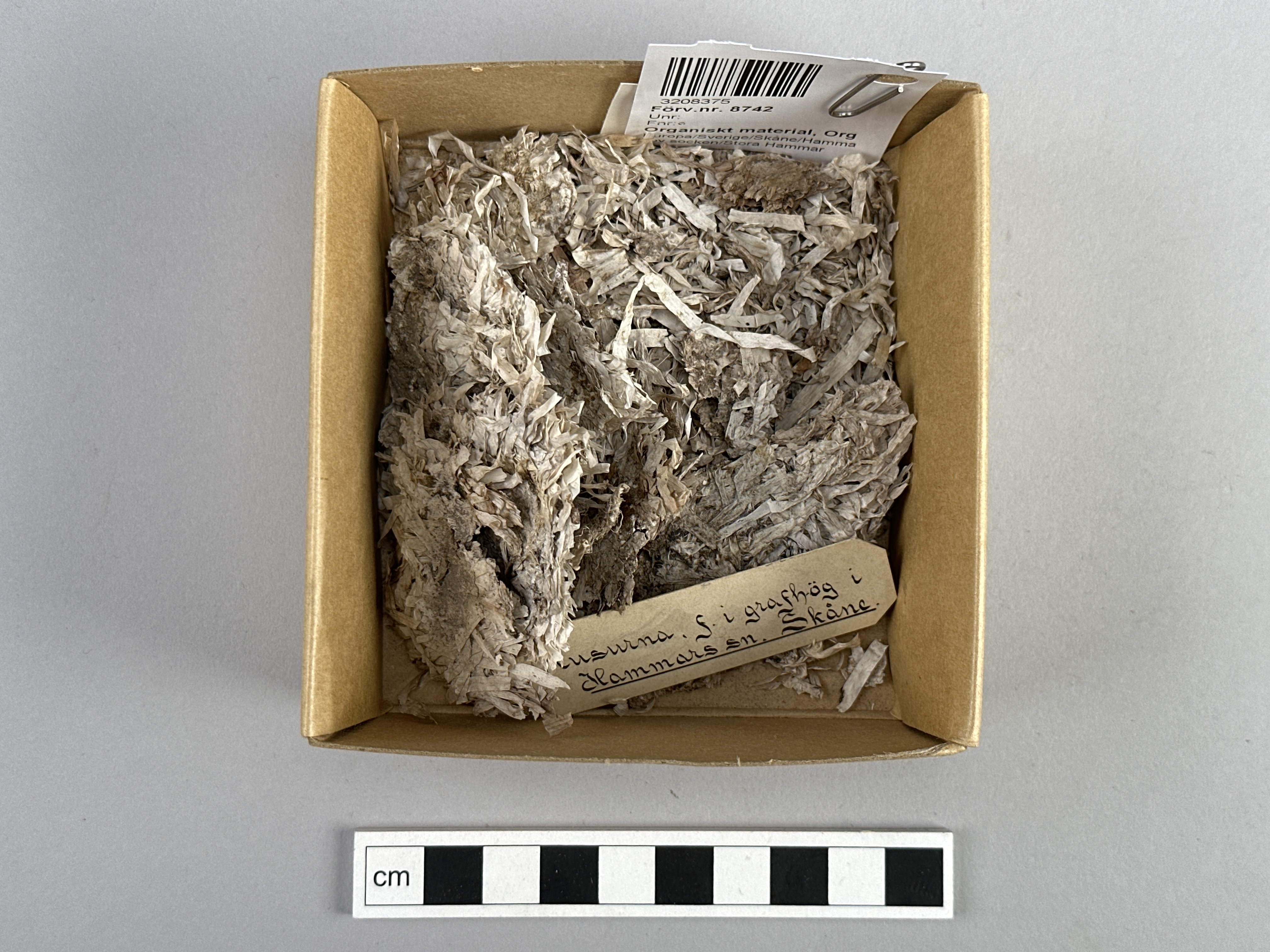 Ljusgrått orgnaiskt material, troligen tång? Funnet i grav.