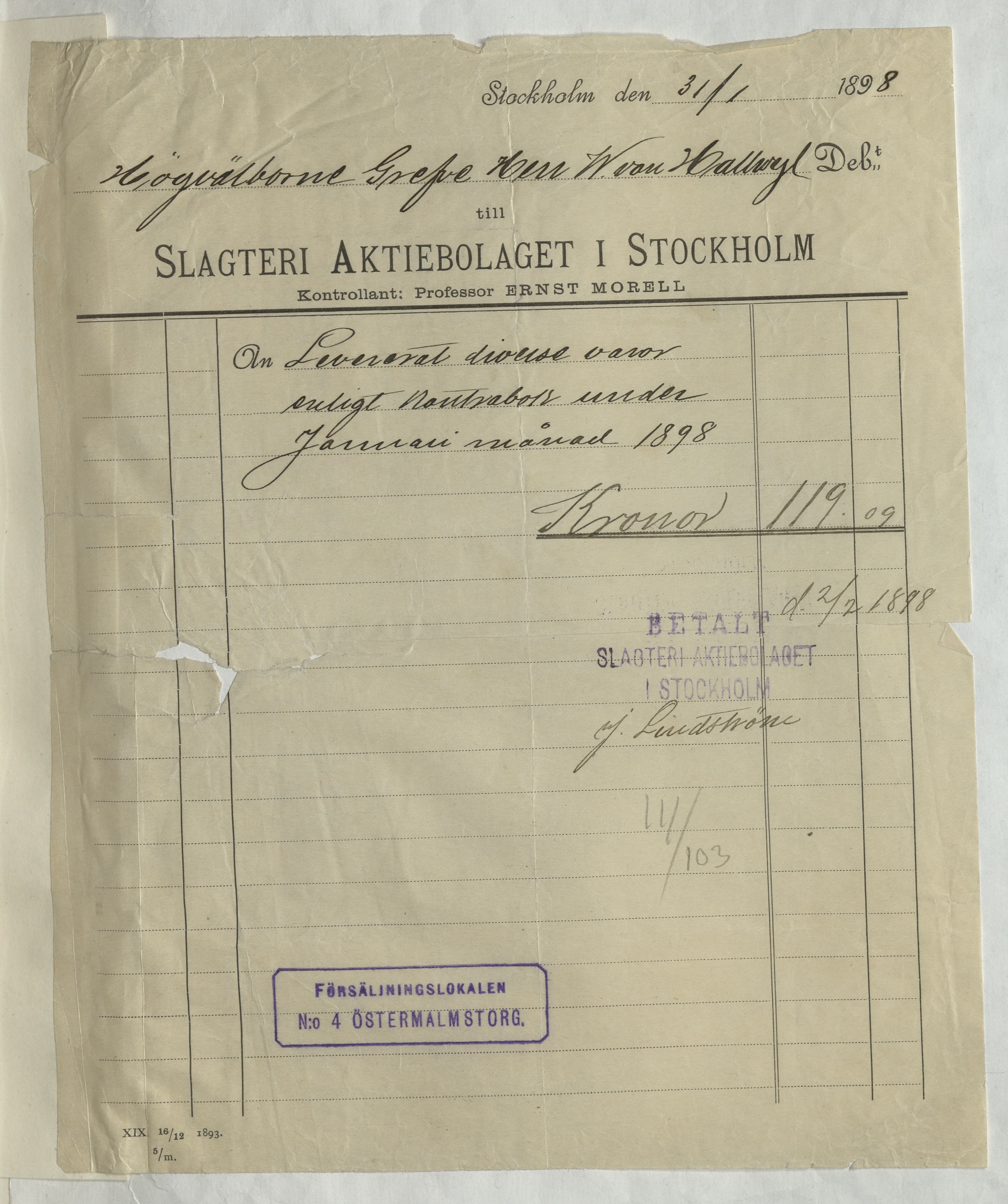 Kvitto från Slagteri Aktiebolaget i Stockholm