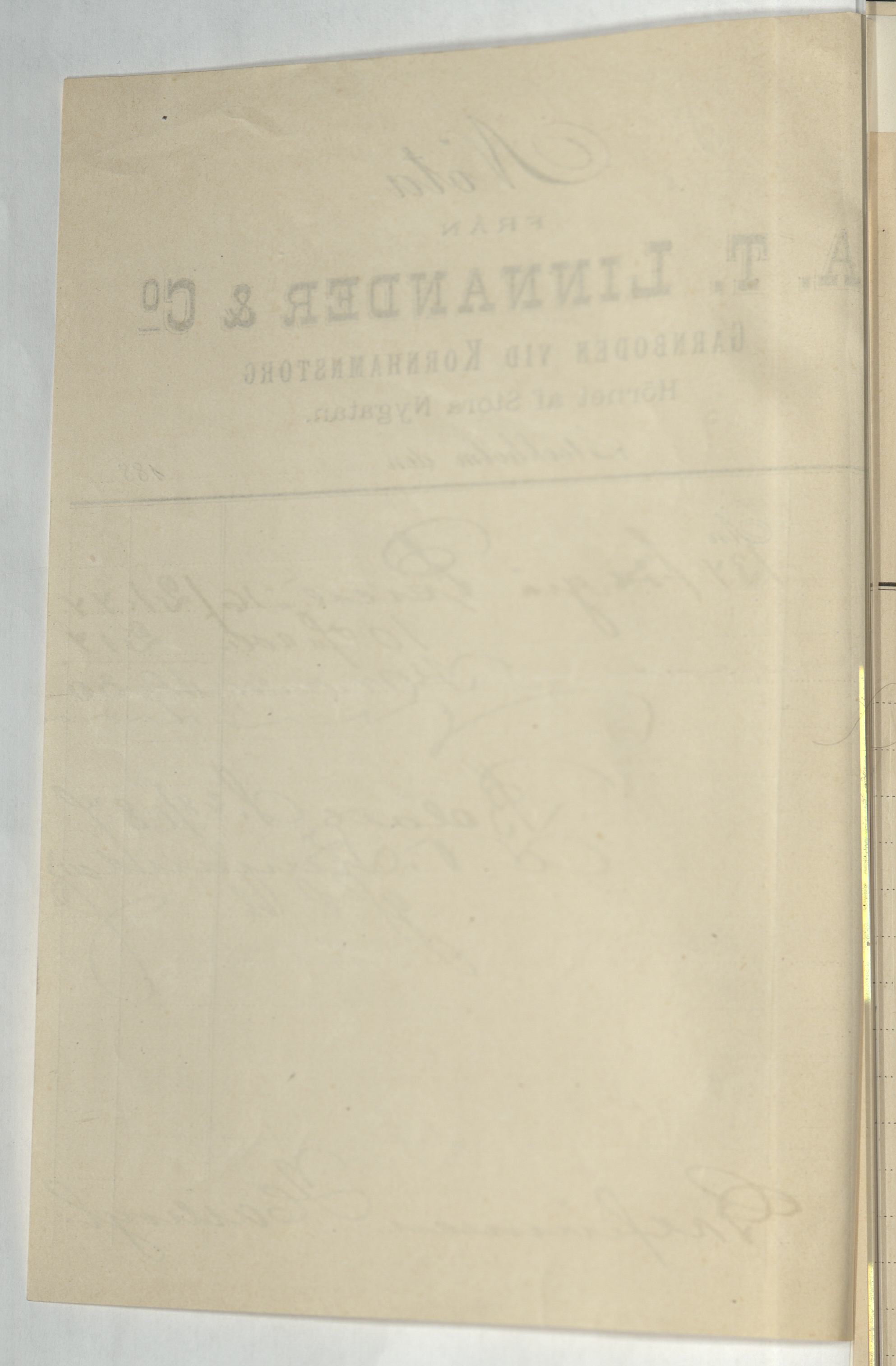 Kvitto från A. T. Linnander & Co. Garnboden vid Kornhamnstorg. Stockholm, 1887.
