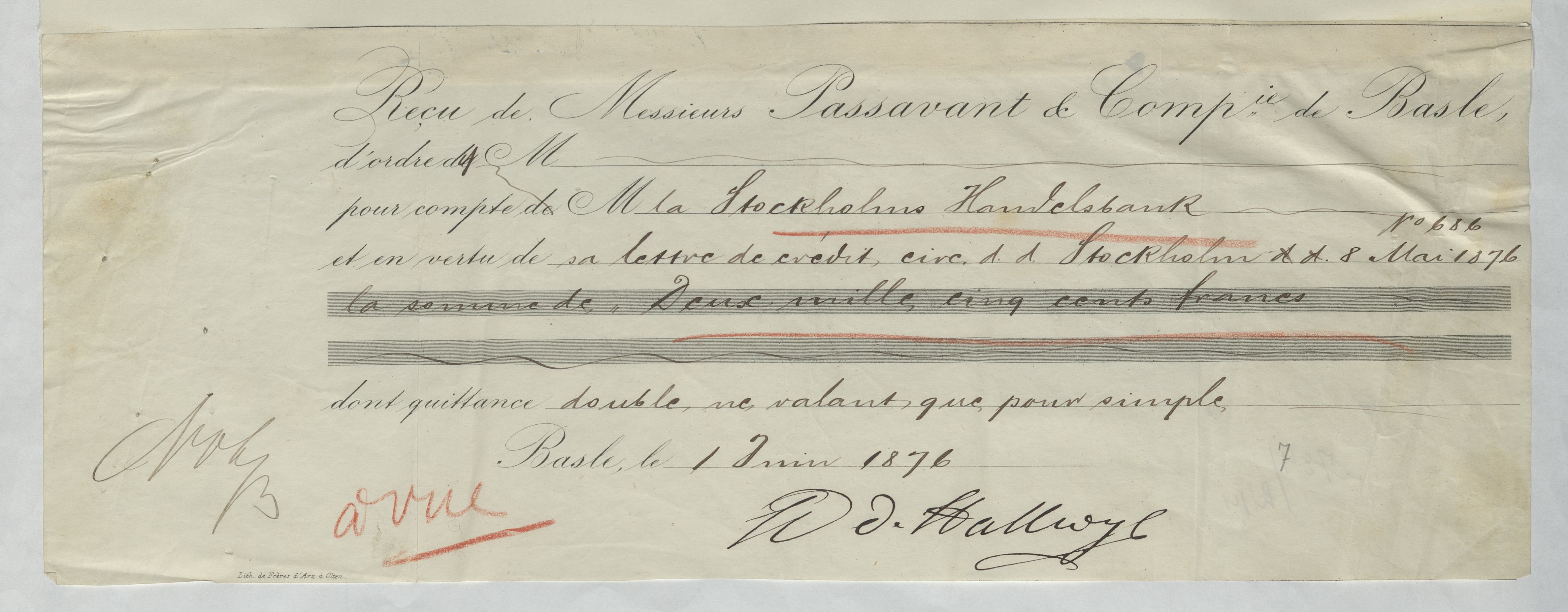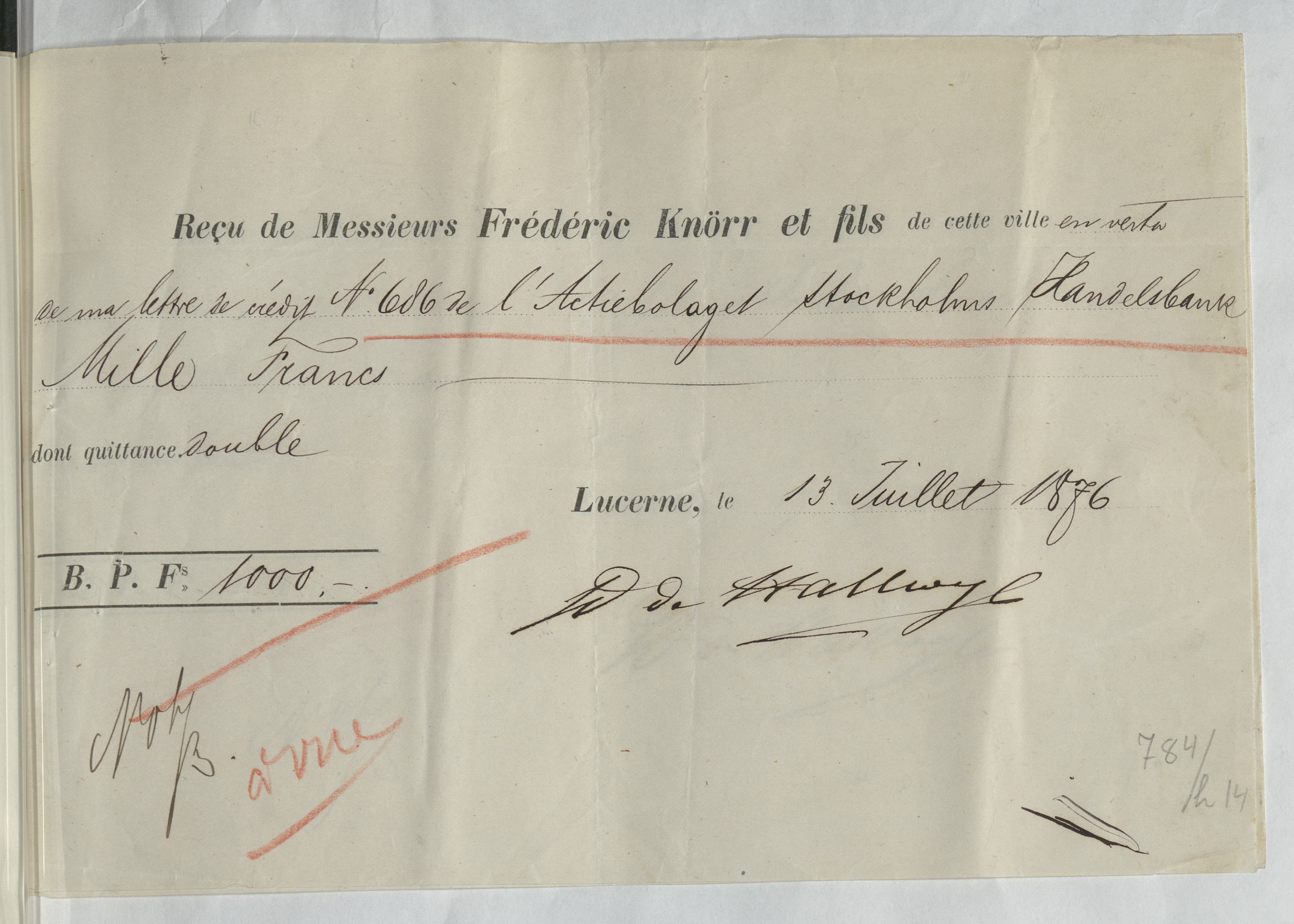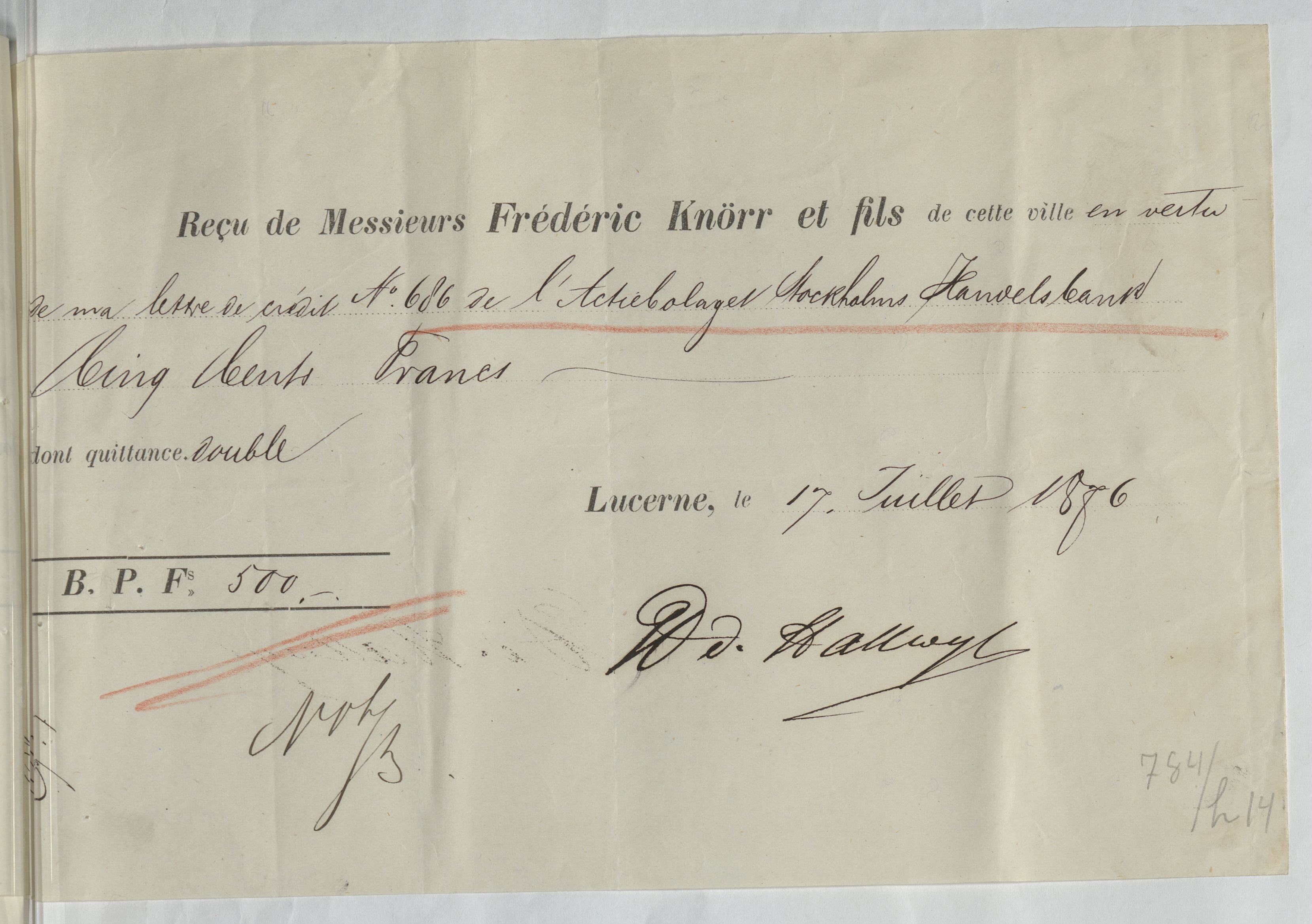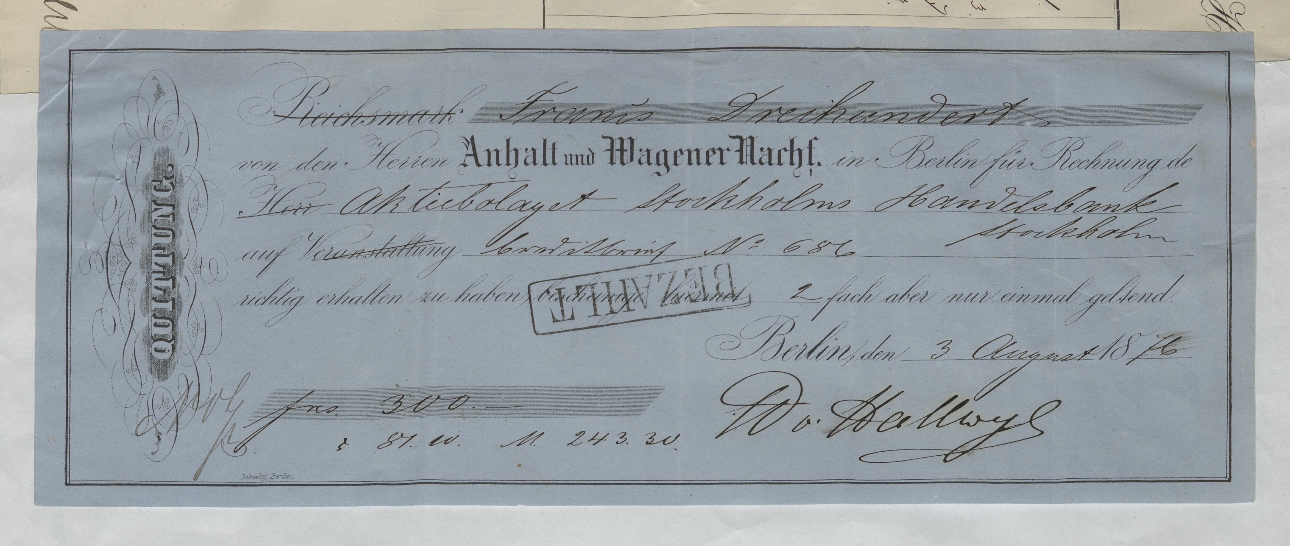 Kvitto från Aktiebolaget Stockholms Handelsbank rörande Passavant & Comp. Basel; Knörr, Frédéric & fils, Lucerne: Anhalt & Wagener, Berlin