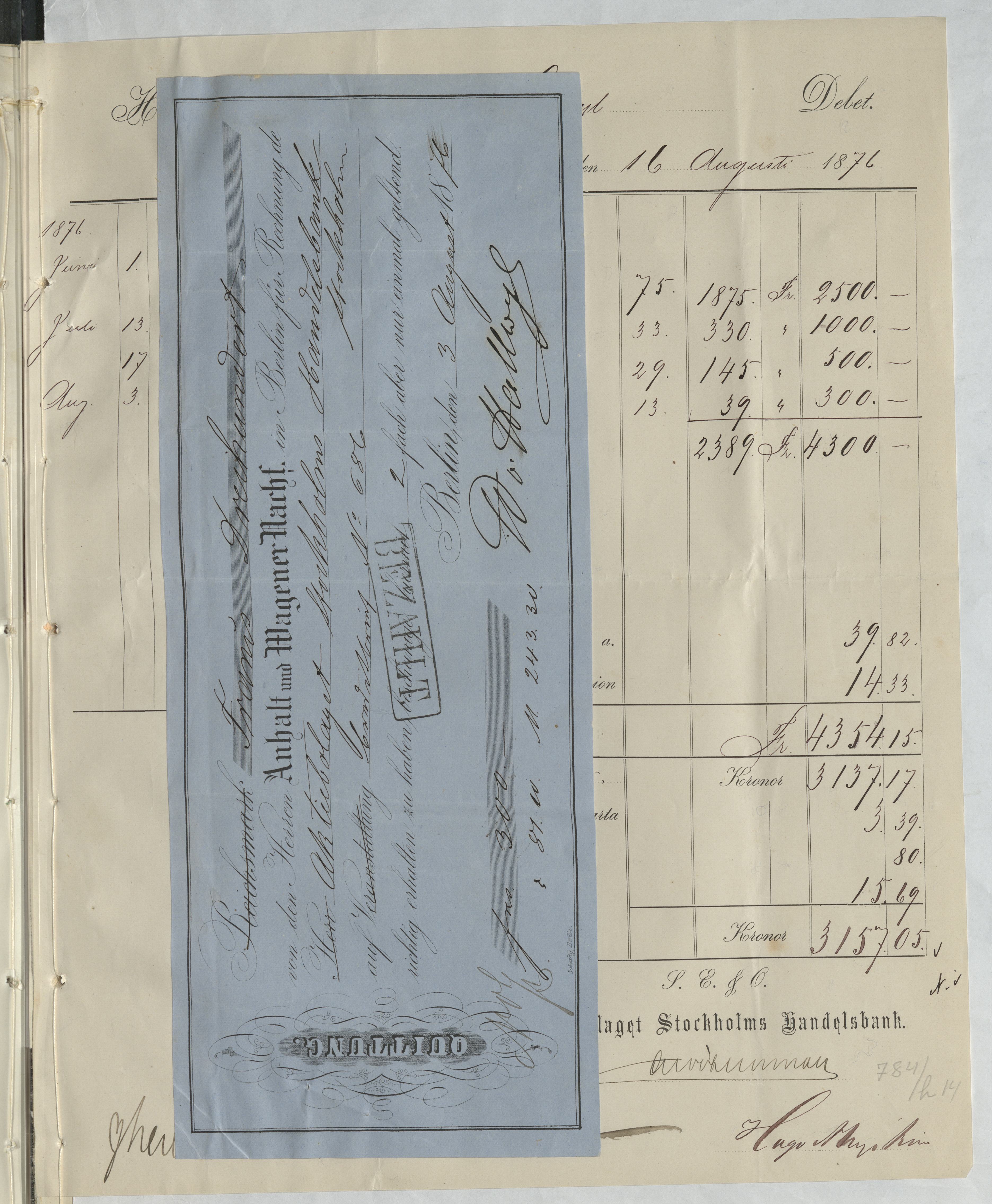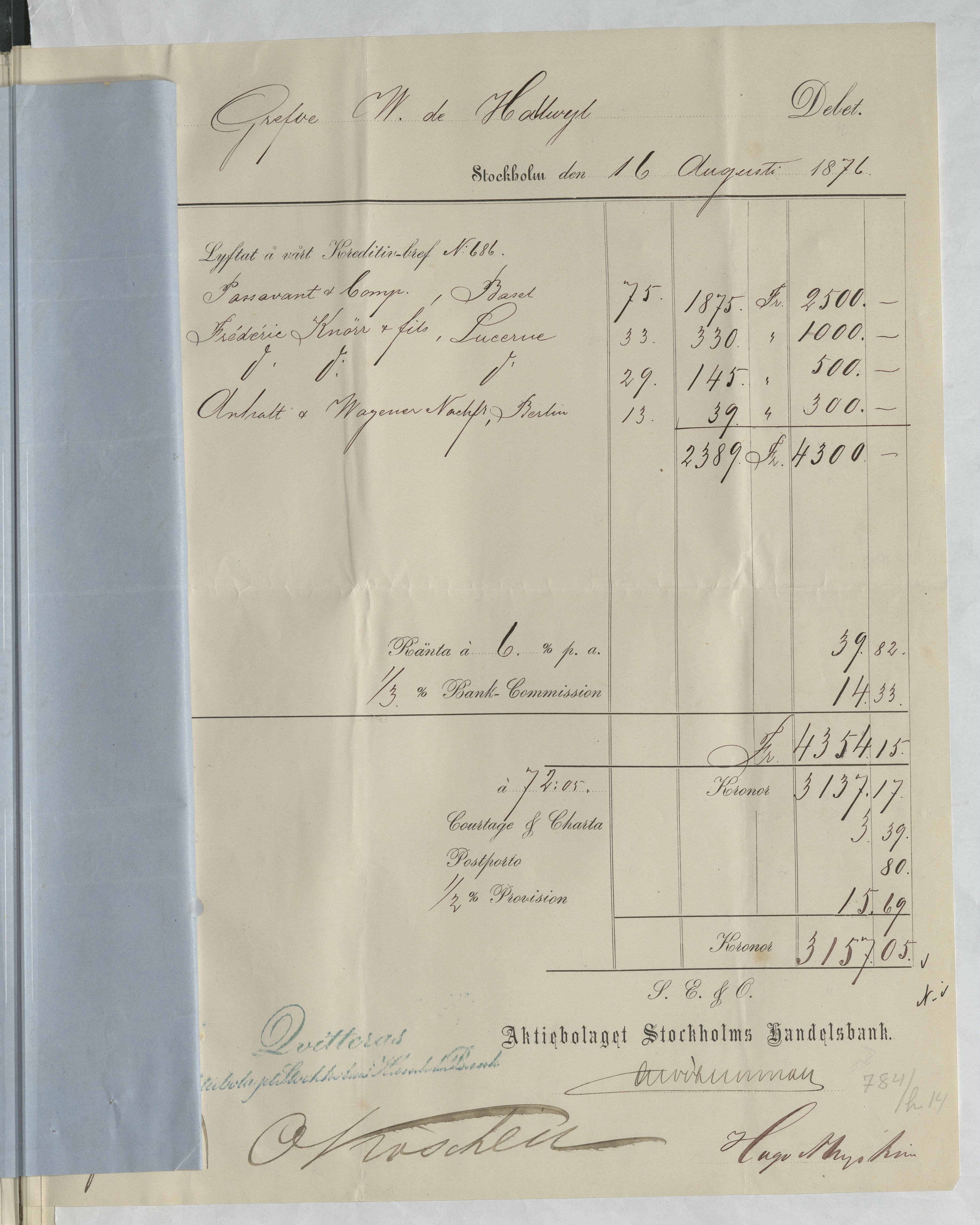 A. Anhalt und Wagener Nachf. Berlin B. Bayerischen Vereinsbank, München C. Boucicaut, Aristide, Paris D. Erikson, L. E. Spannmålshandlare E. Loewe, M. Innsbruck F. Mallet, Frères & C:ie, Paris G. Munktells Mekaniska Werkstads AB H. Passavant & Comp. Basel; Knörr, Frédéric & fils, Lucerne: Anhalt & Wagener, Berlin (på samma räkning) I. Schultess Erben, Zürich J. Sjöberg, Gustaf, Operasångare K. Stametz & C:o, I. H. Nachfolger, Wien L. Upp- och Afskrifnings-Besked och andra verifikationer