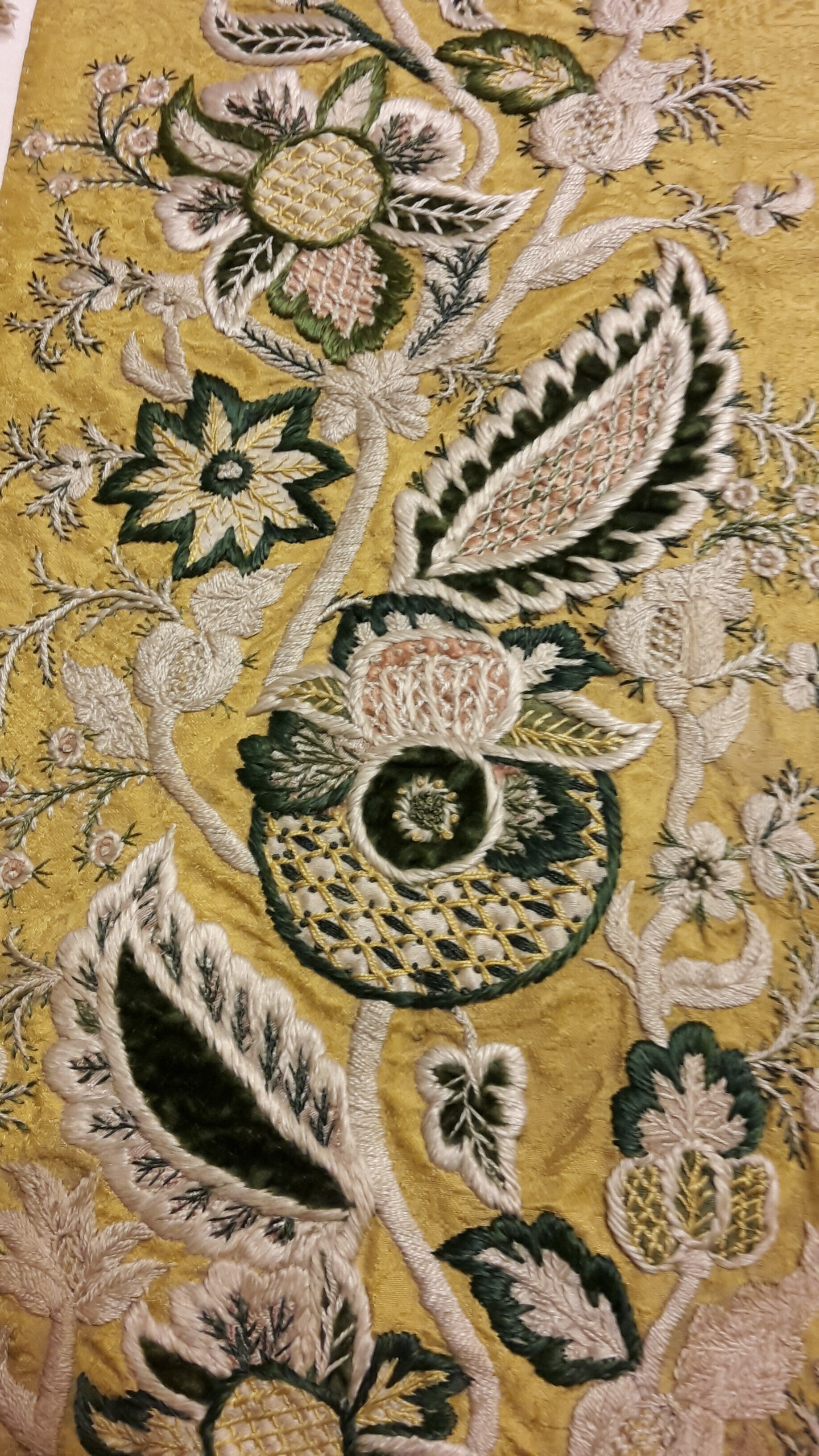 Gul blommig sidendamast. Broderi i grönt, gult, vitt silke, applicerad sammet och siden. Blom- och bladmönster. Gulgrönt taftfoder. Gåva 1874.