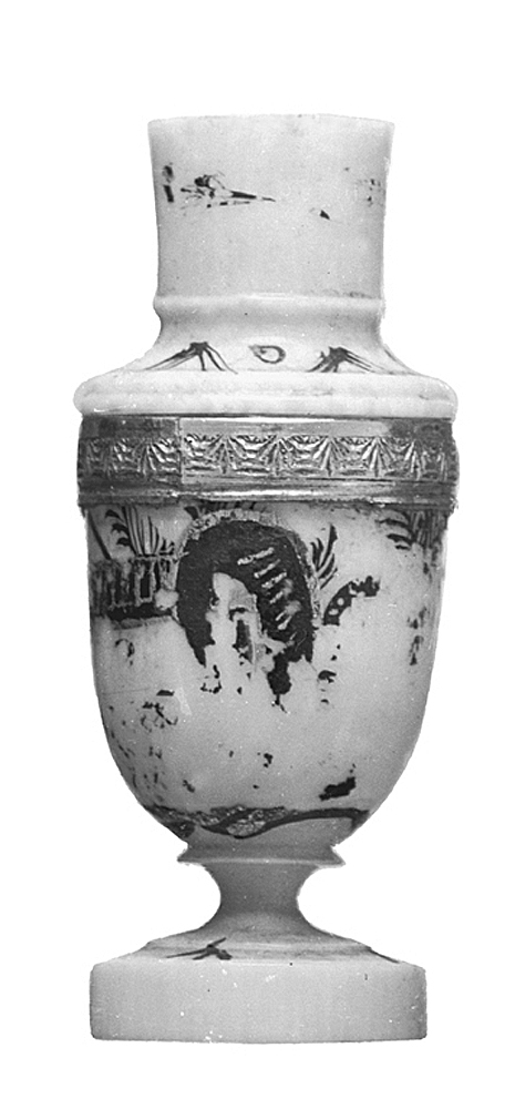 Av elfenben. Svarvad i form av en urna, med högt skruvlock. Dekor i svart och guld. Kring dosan ett landskap, nästan utplånat, samt kring övre kanten ett band av guld, därpå en ciselerad bård av sammanhängande musseliknande ornament. Locket med nedre delen utsvängd, utgörande urnans skuldra; den övre cylindrisk med platt överända samt med spår av svart dekor. Fot rund, platt, på smal kälformad hals. Tillv.: Tyskland troligen. Gåva till Wilhelmina von Hallwyl från antikvitetshandlaren Ed. Kahlert, Eisenach, Tyskland, 27 maj 1896.