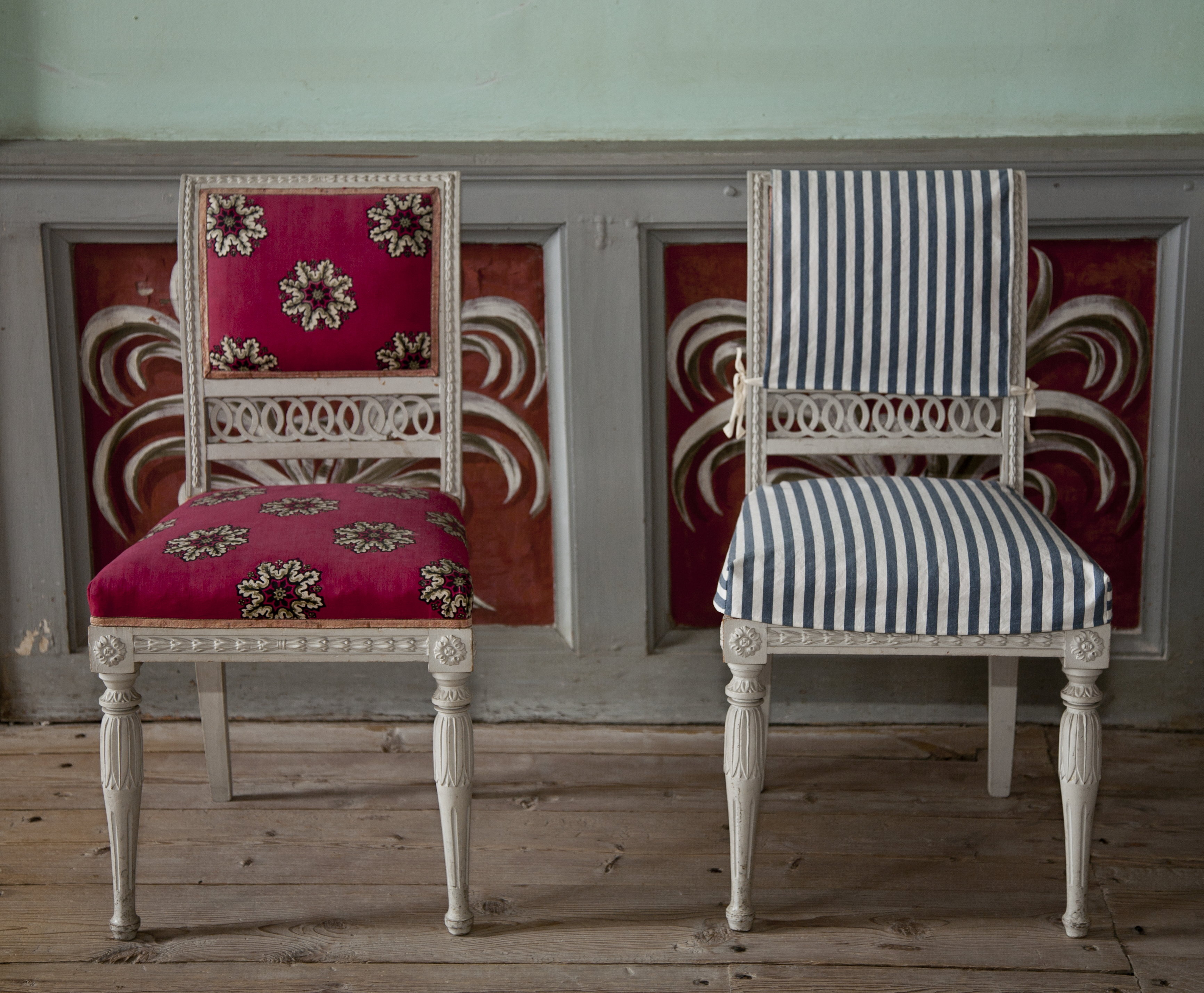 Åtta stolar av gråvitmålad björk.